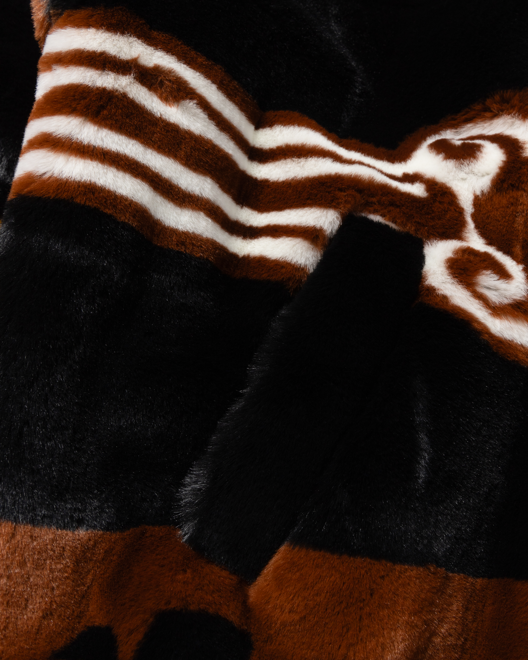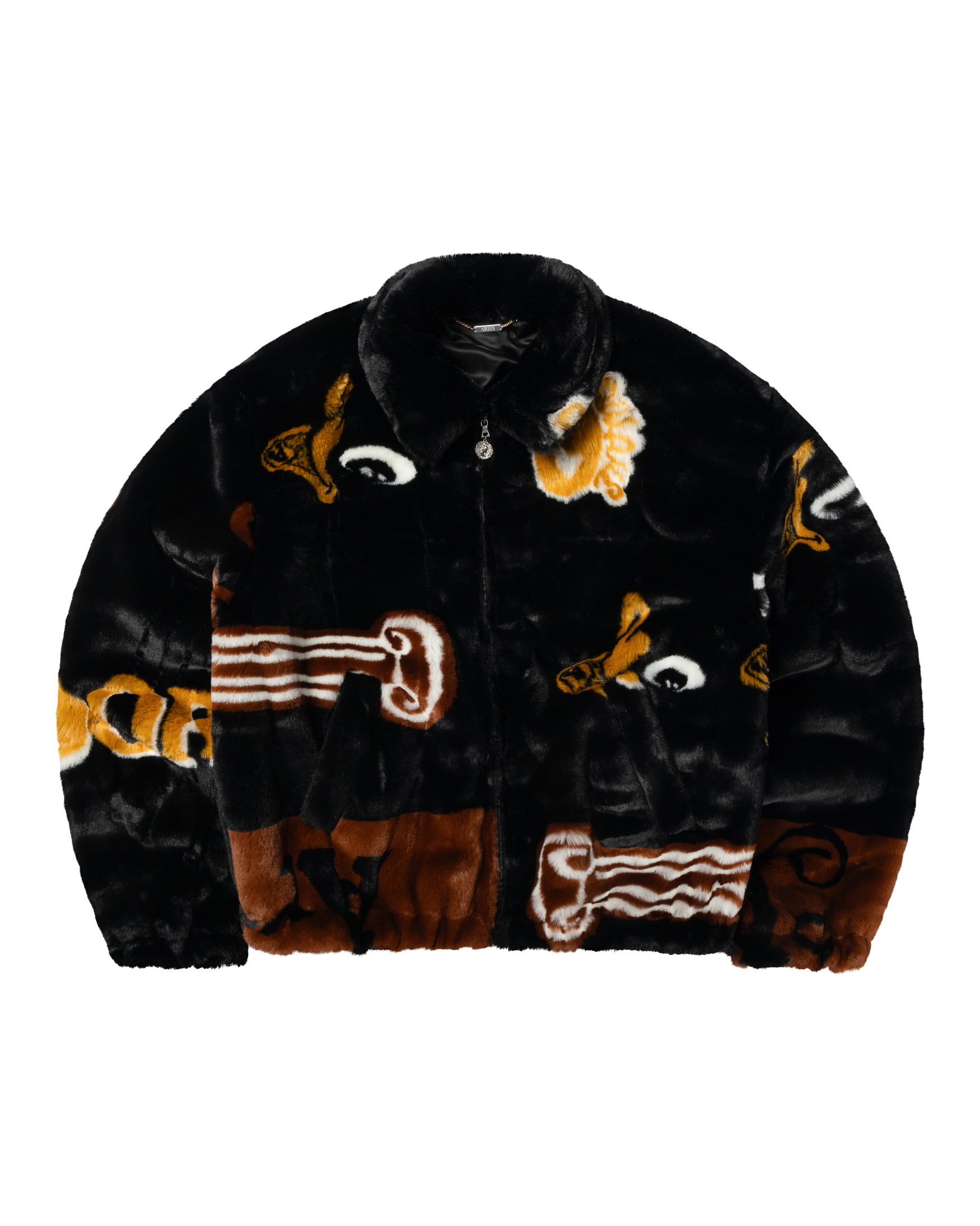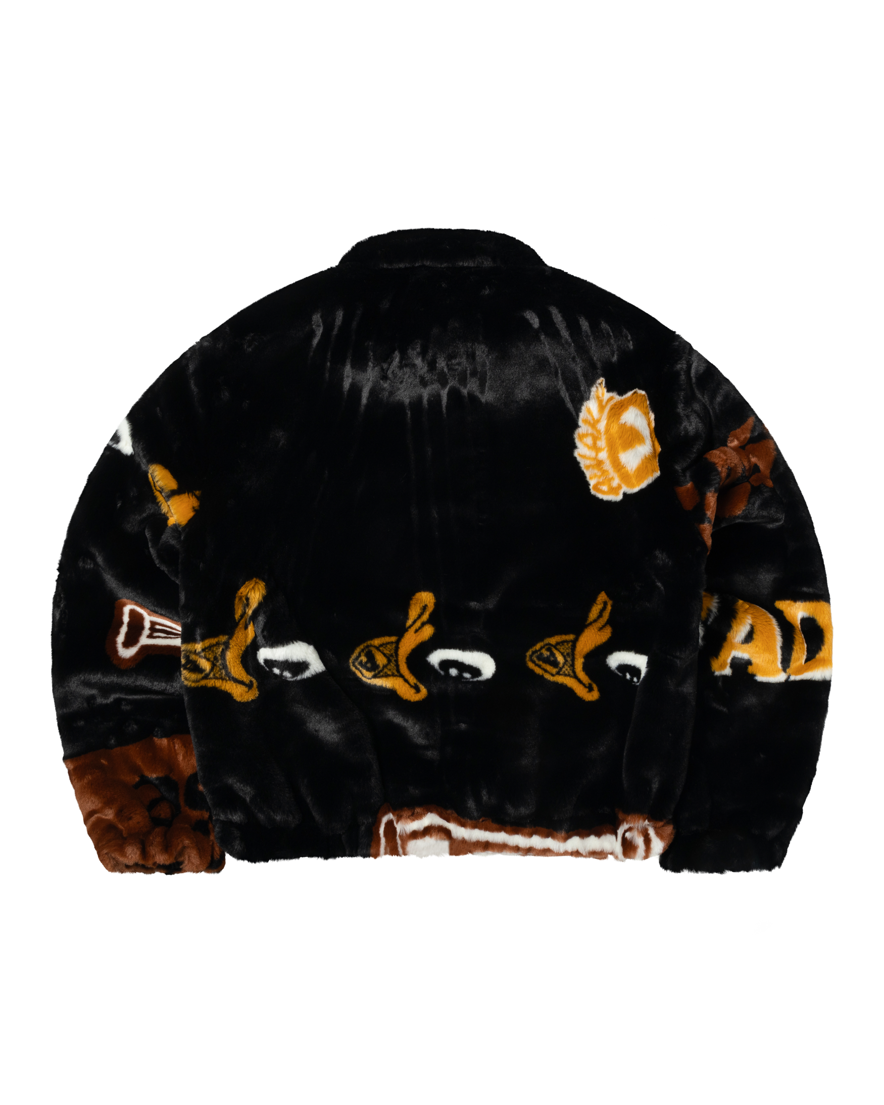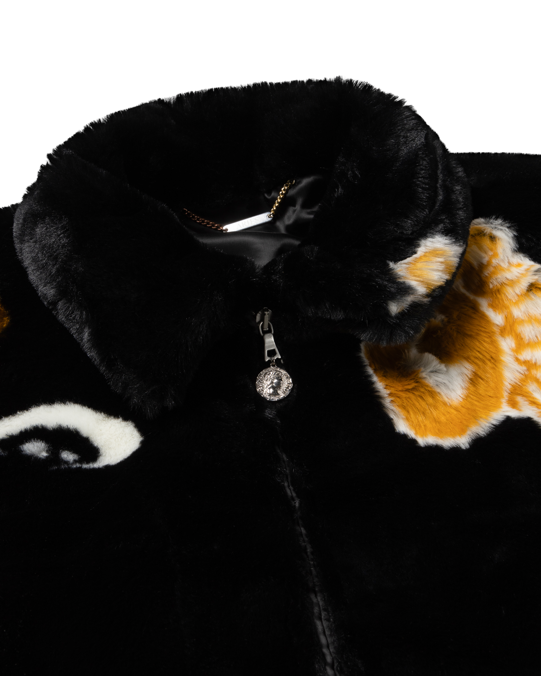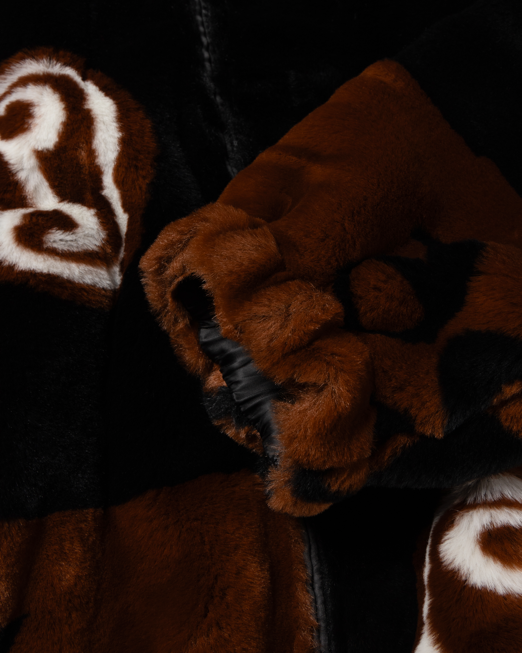 Oversized bomber made of customJacquard faux fur with elasticated cuffs and hem. Fully lined, with chain branding at internal back neck and Roman Coin zip puller. Mohair (79%), Polyester (16%), Acrylic (5%).
