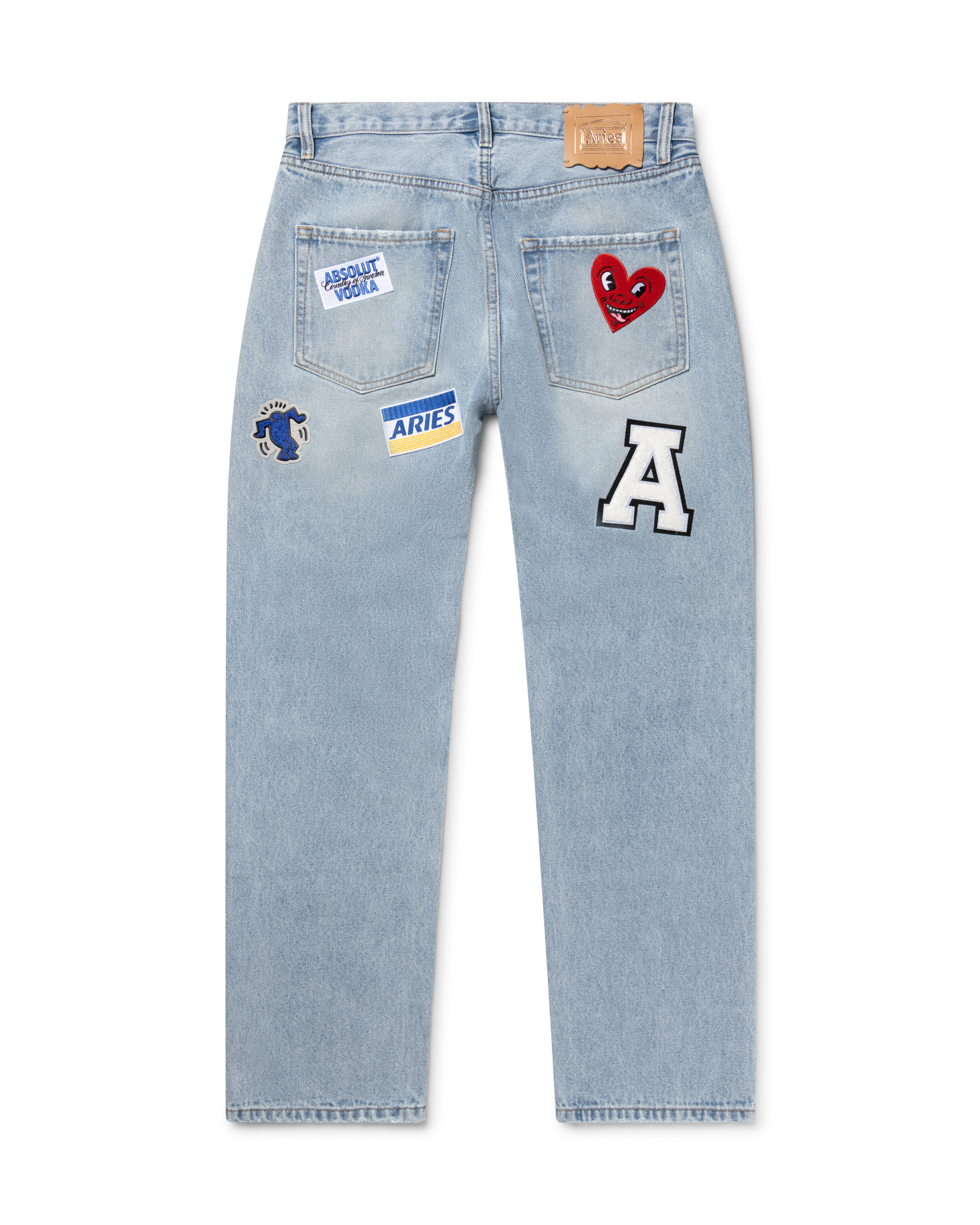 The aries x absolut haring embellished lilly jean is a unisex style cut from premium indigo denim and treated with a pale vintage wash. finished with a mix of embroidered deadstock aries patches and patches inspired by keith haring’s iconic absolut vodka artwork. a versatile straight-leg jean with a high rise and button fly that works worn fitted or loose.
