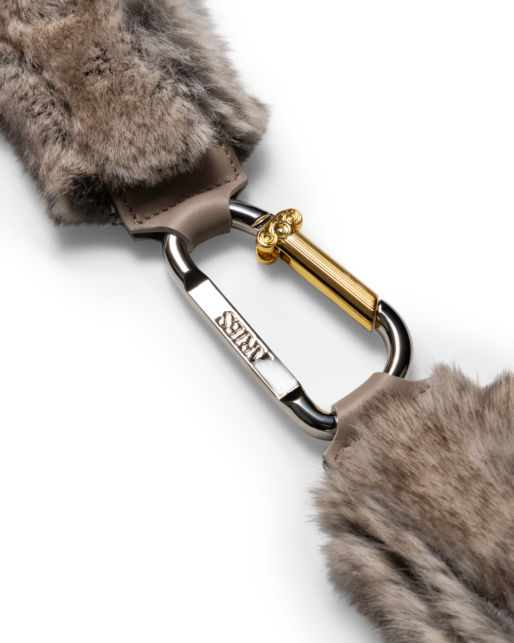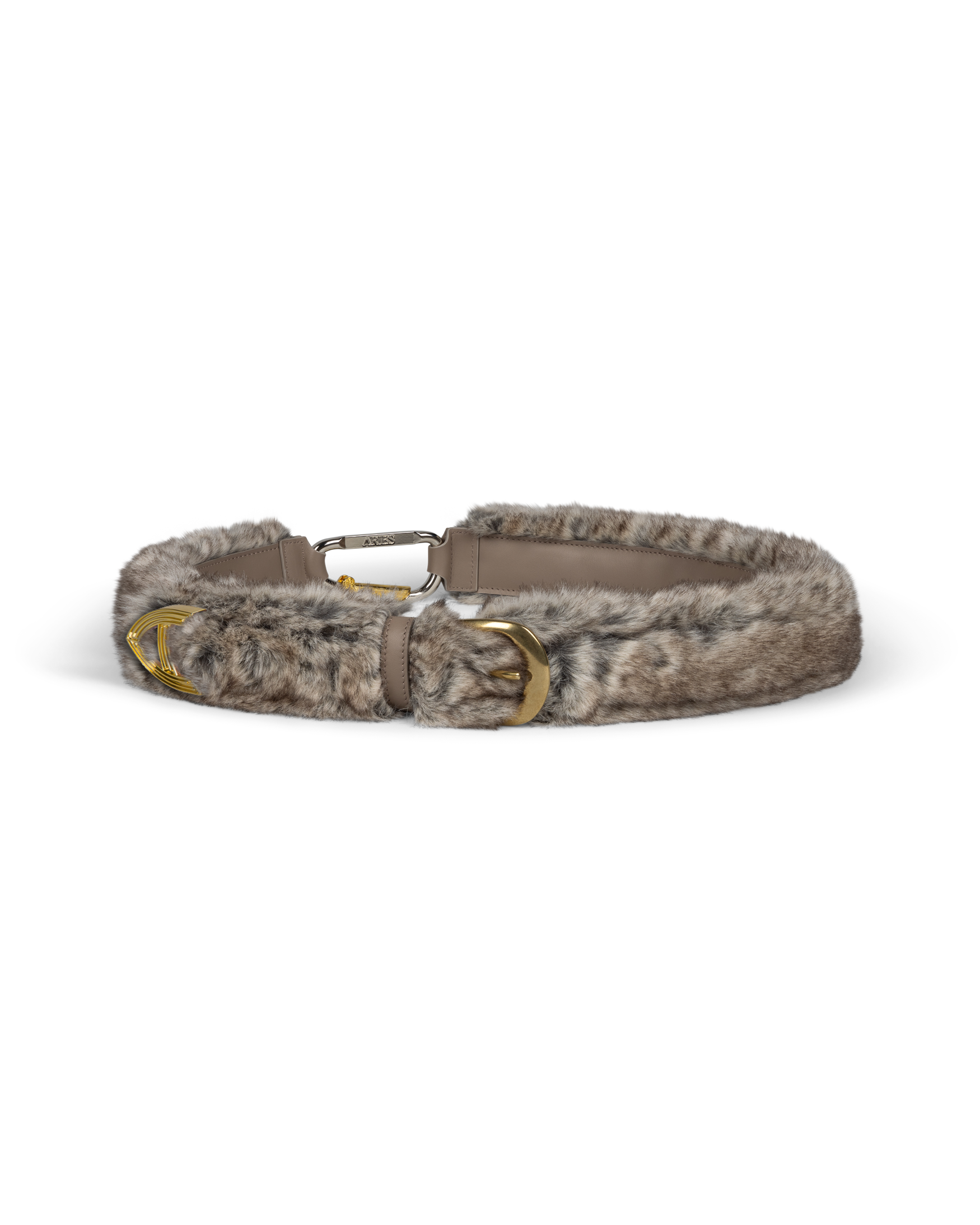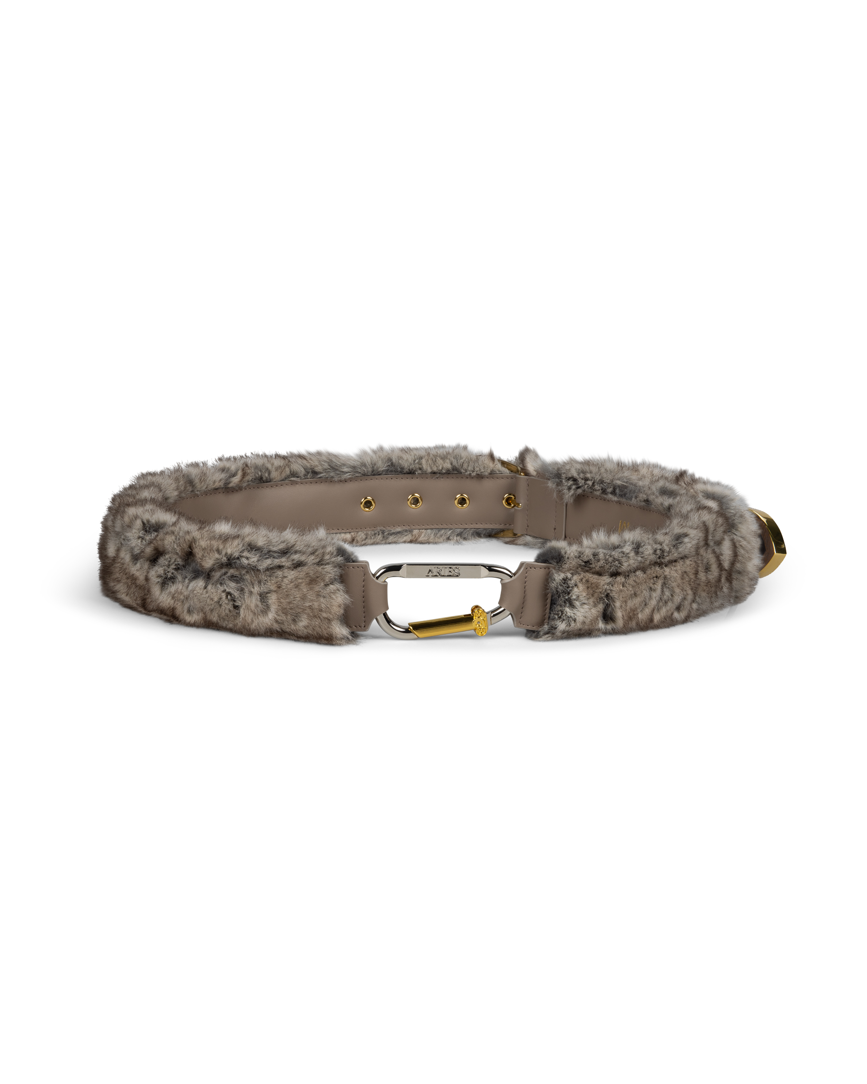 Faux chinchilla finish. Features the Aries metal column belt loop, Aries carabiner fastening, and aluminium hardware.