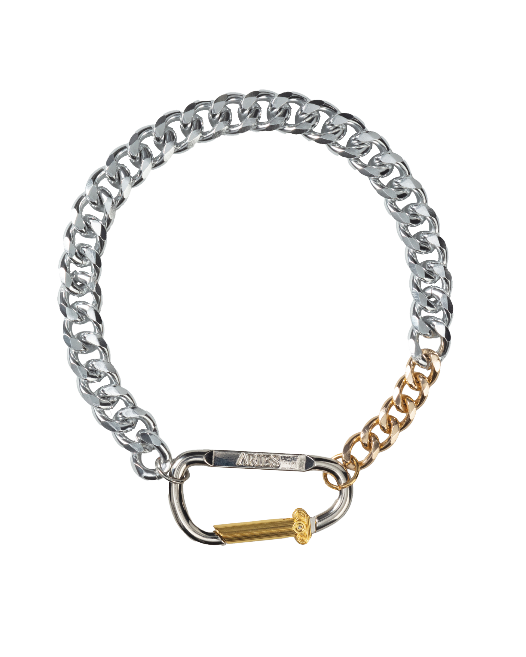 Aries Column carabiner attached to silver chain with five gold links.