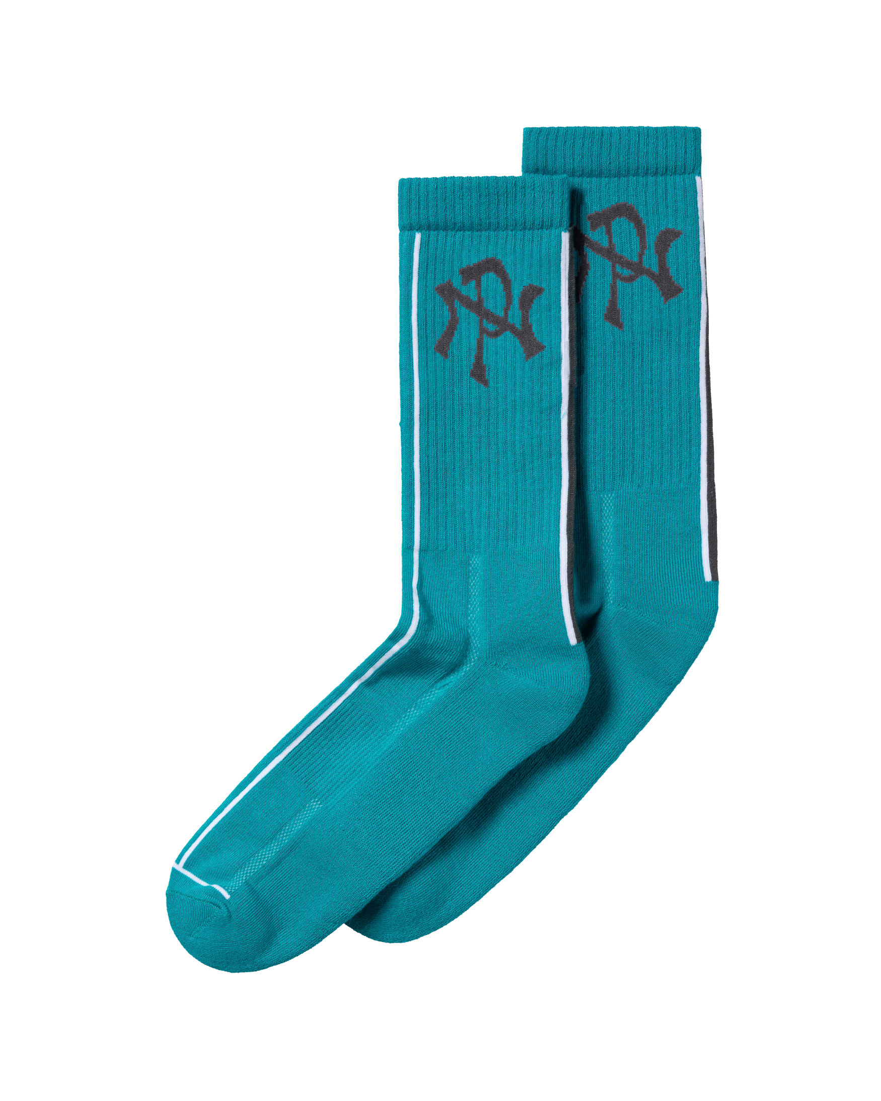 Jacquard socks in a sports-blend mix yarn featuring NYP graphic.