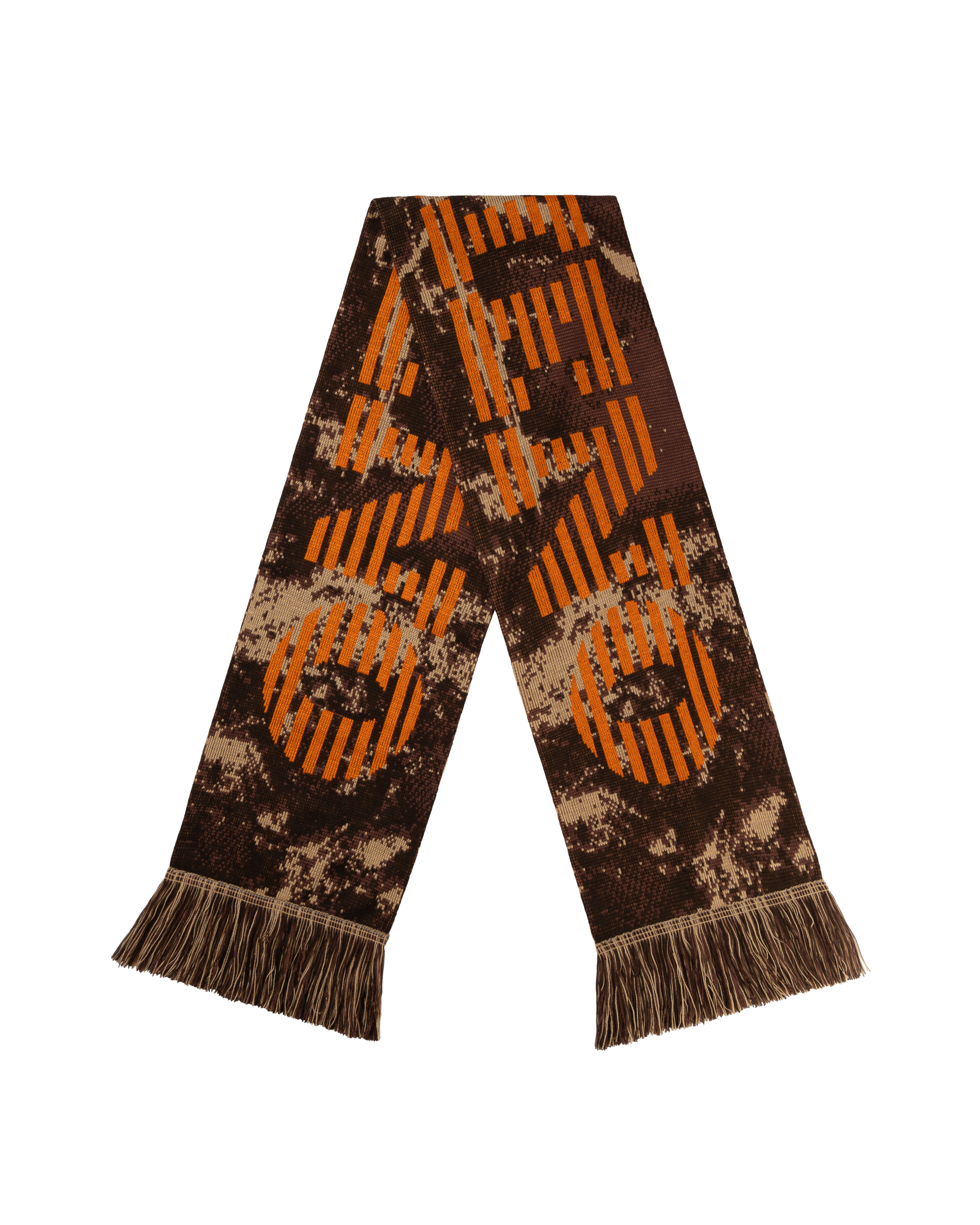 knitted acrylic football-style scarf with a i love alieno intarsia design and fringed ends.