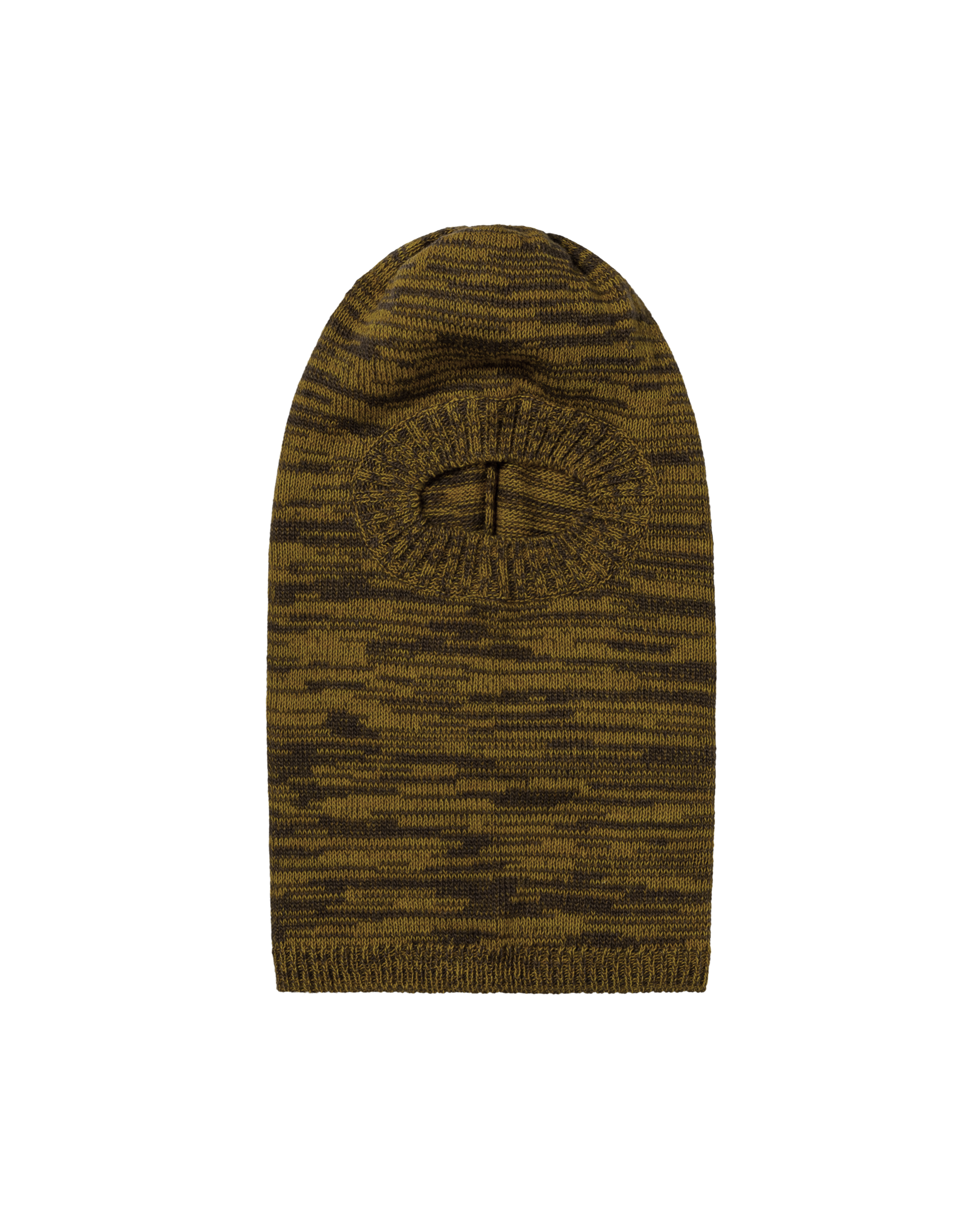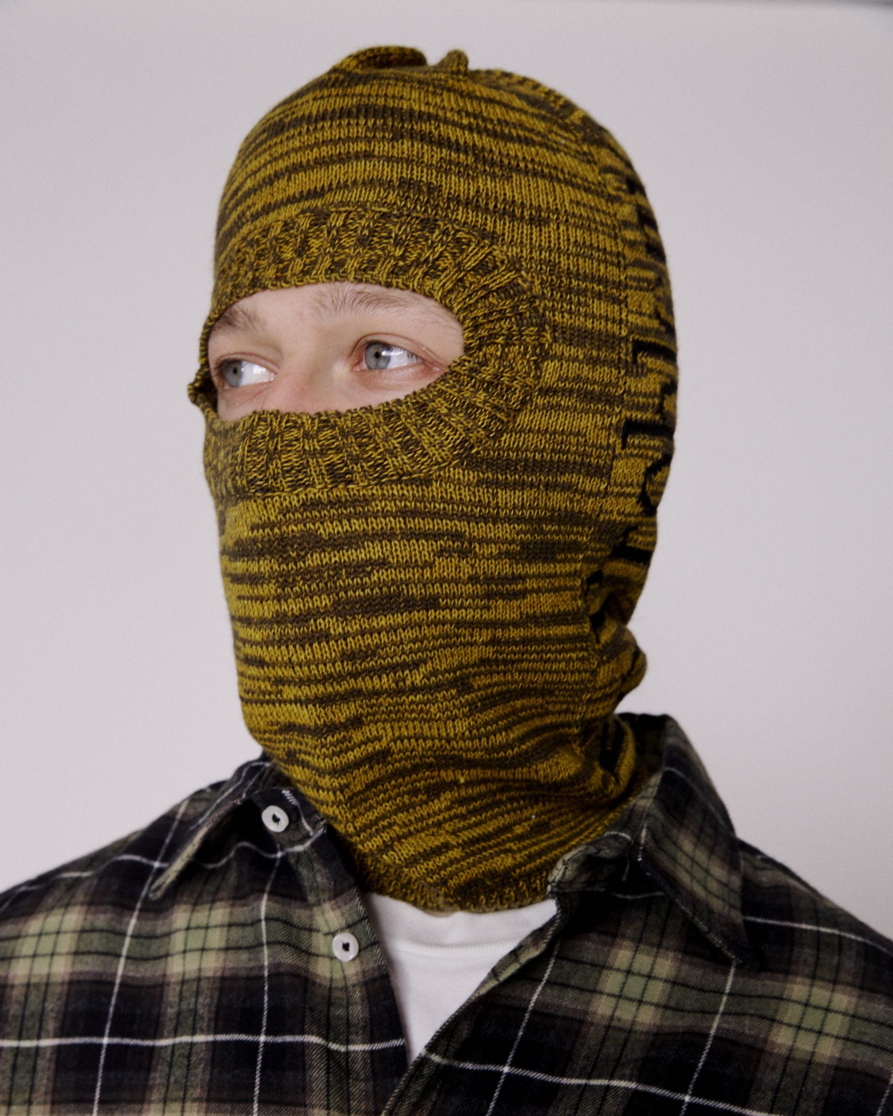 knitted balaclava made from cotton and recycled polyester yarn and an allover glitch-y knit jacquard design.