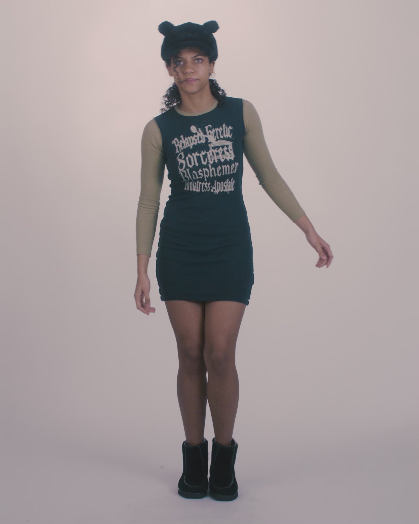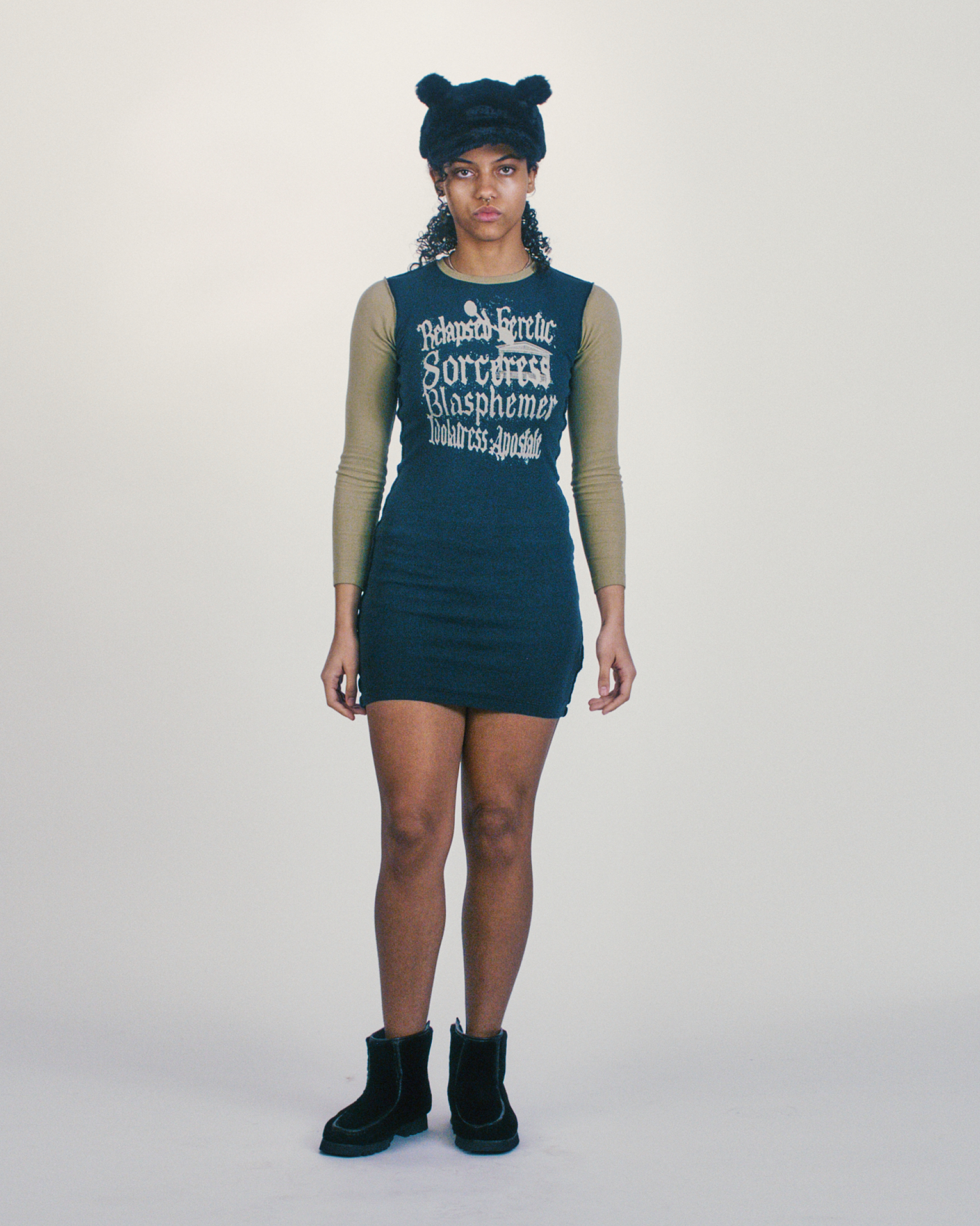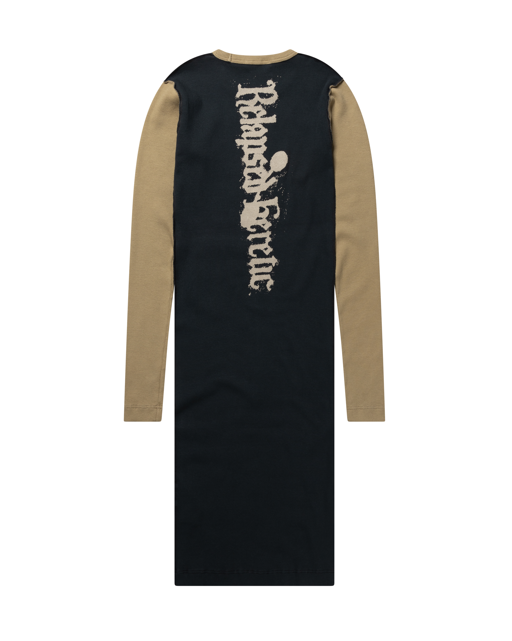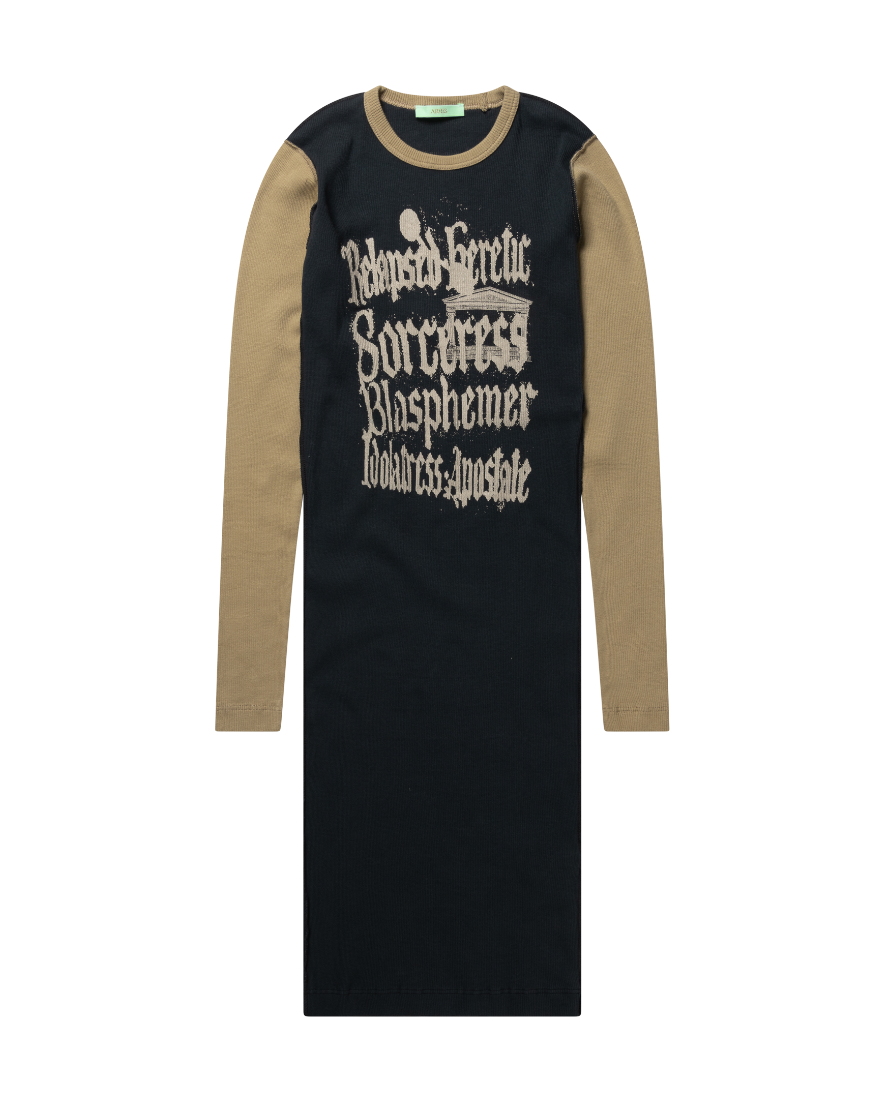 Fitted long sleeved dress in a lightweight ribbed cotton featuring seasonal 'Relapsed Heretic' graphics screen printed on the front and back. 100% cotton.