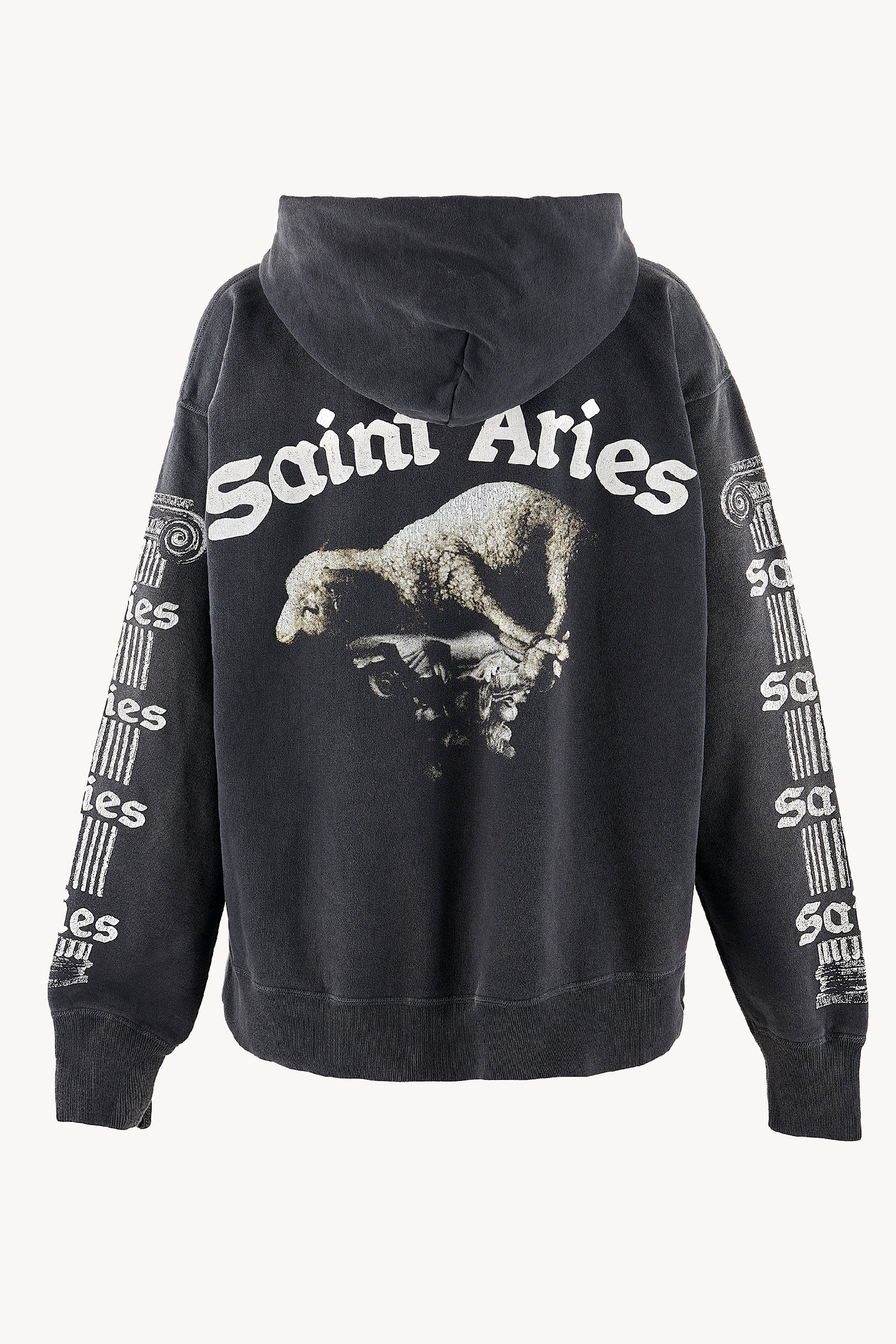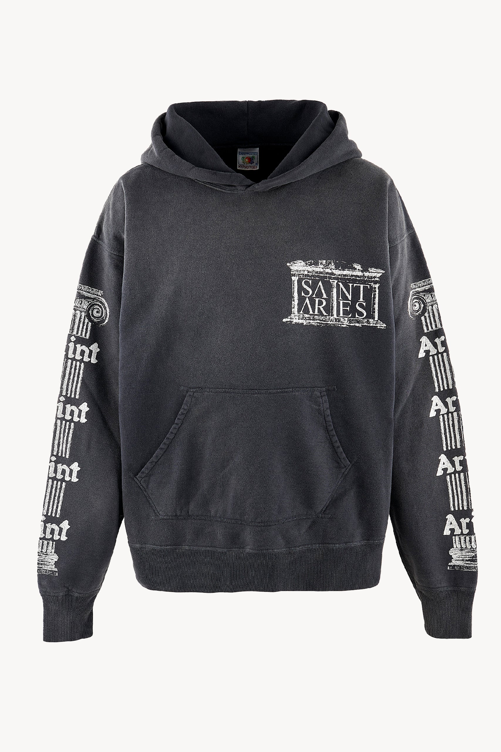 Unisex hooded sweatshirt made from brushed-back jersey fleece. With a front kangaroo pocket and rib cuffs and hem. With aged screen-printed columns on the arms and a Saint Aries temple logo on the chest. Treated with a heavy vintage stone-wash treatment for intentional aging. 100% cotton. Made in Japan.