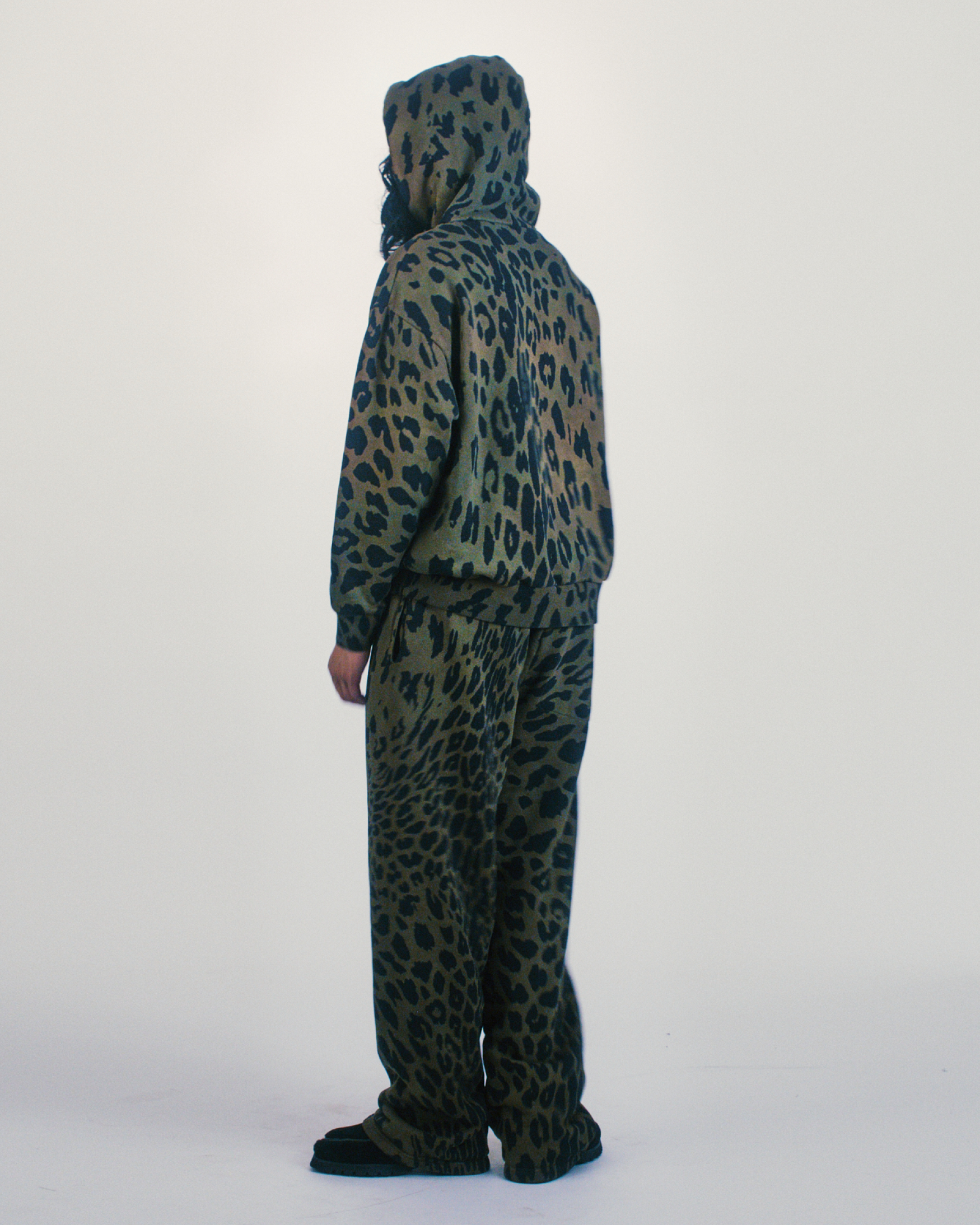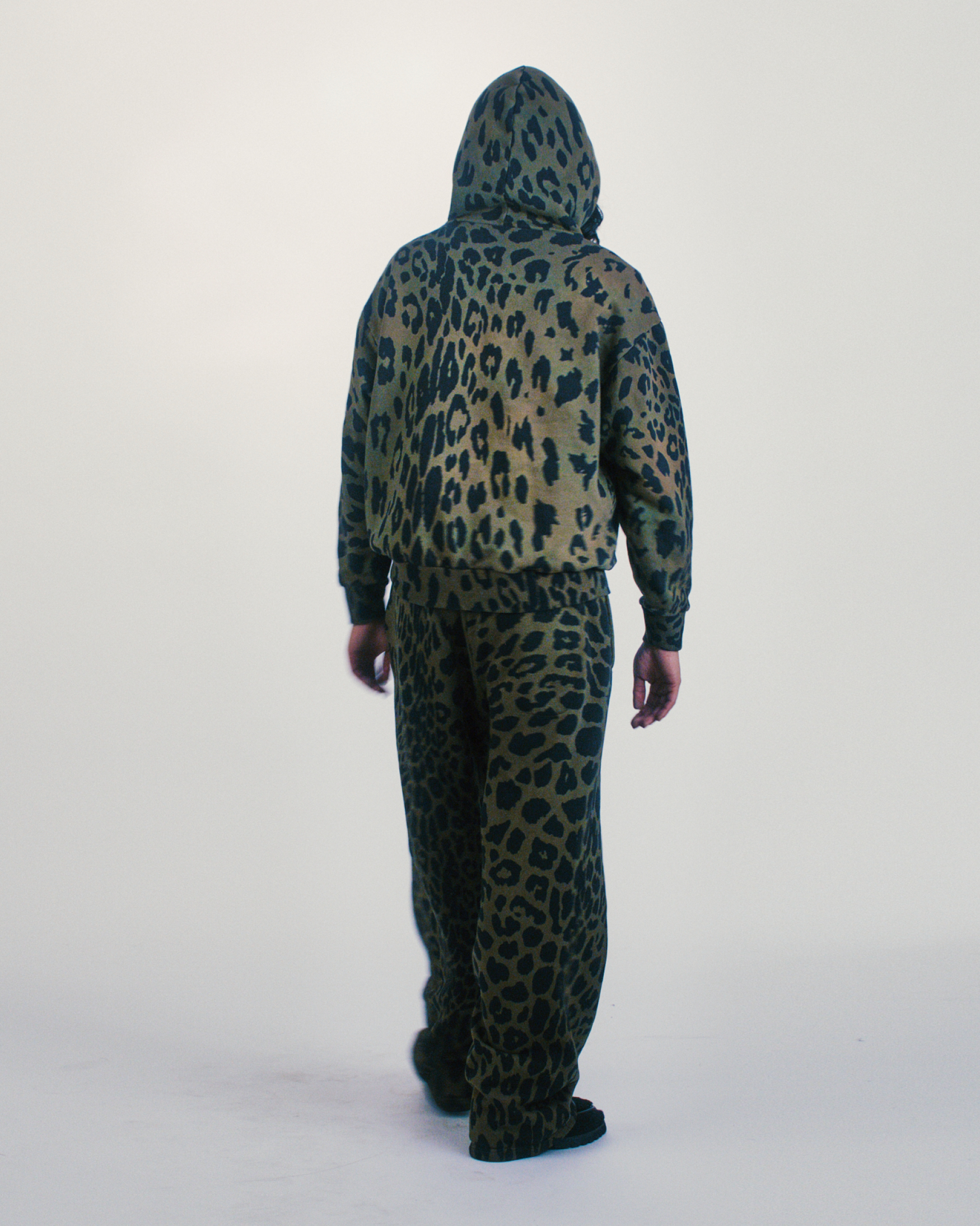 Unisex straight-leg sweatpant, made in brushed-back cotton jersey fleece, with back zip pocket. Allover printed in seasonal leopard graphic and finished with a tie-dye effect and diamante Temple on the back pocket. 100% cotton.