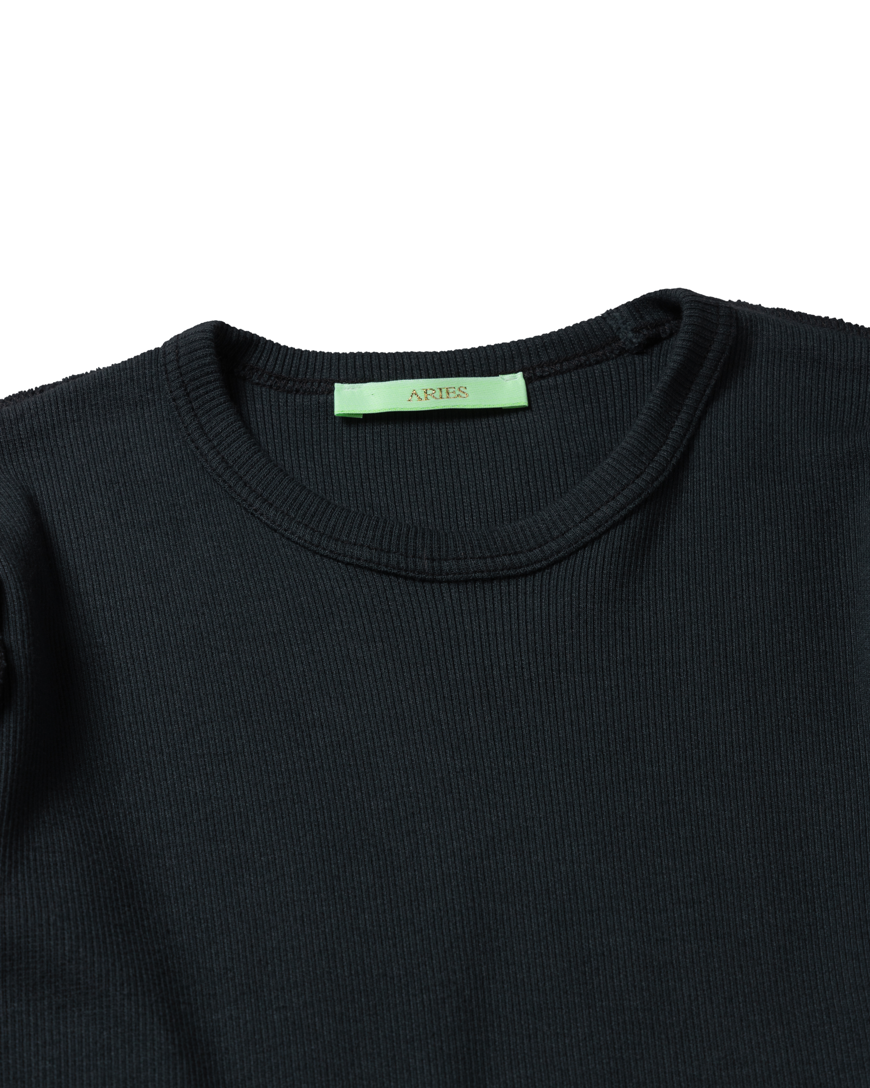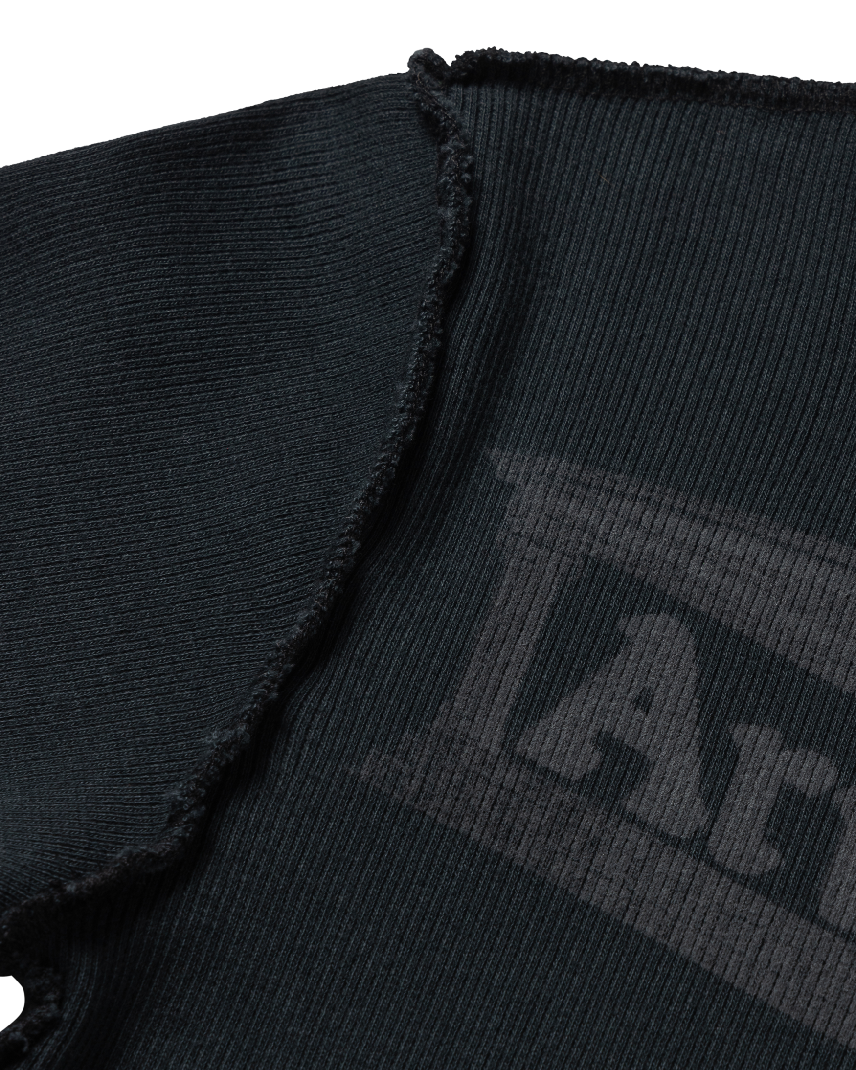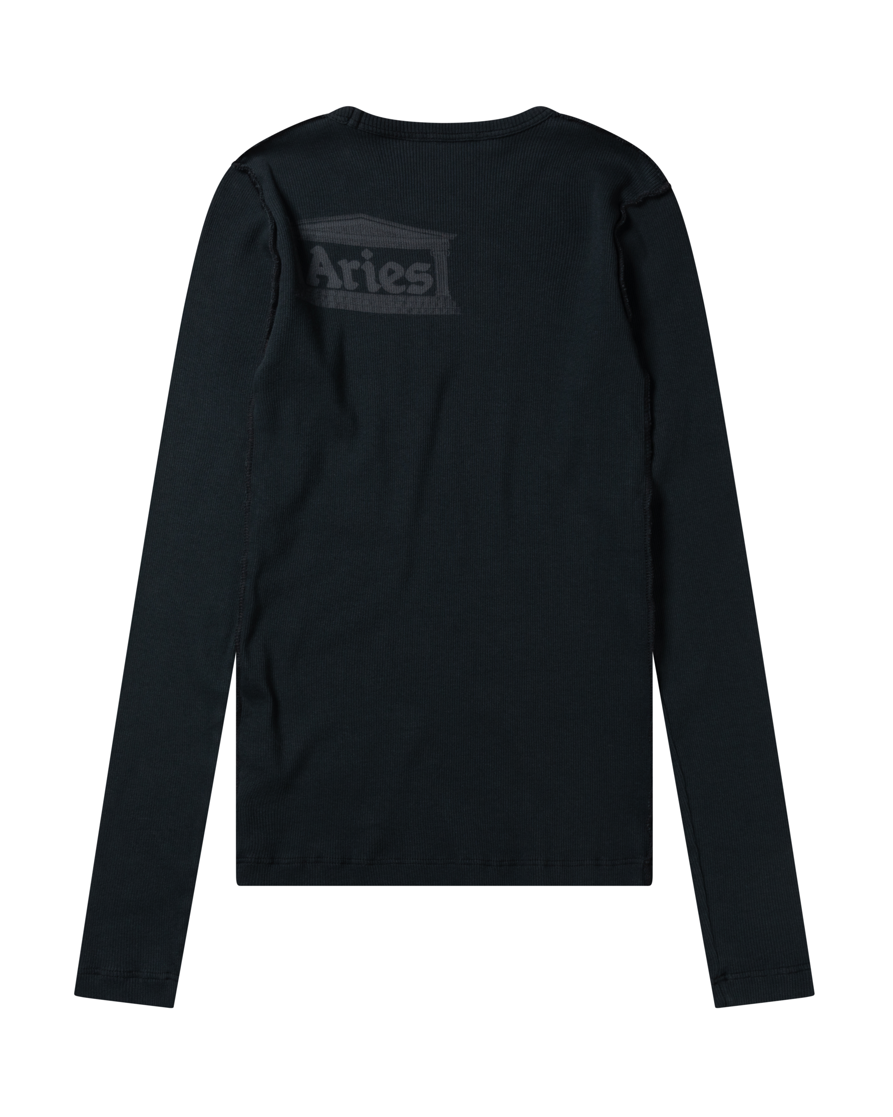 Shrunken long sleeved T-shirt in a lightweight ribbed cotton featuring an Ancient Temple screen printed on the back shoulder. 100% cotton.