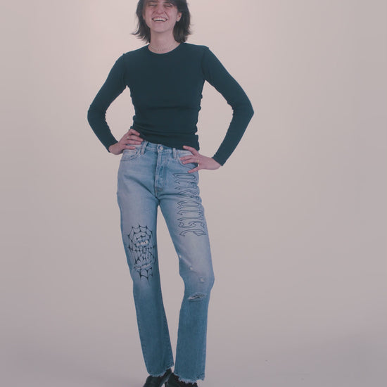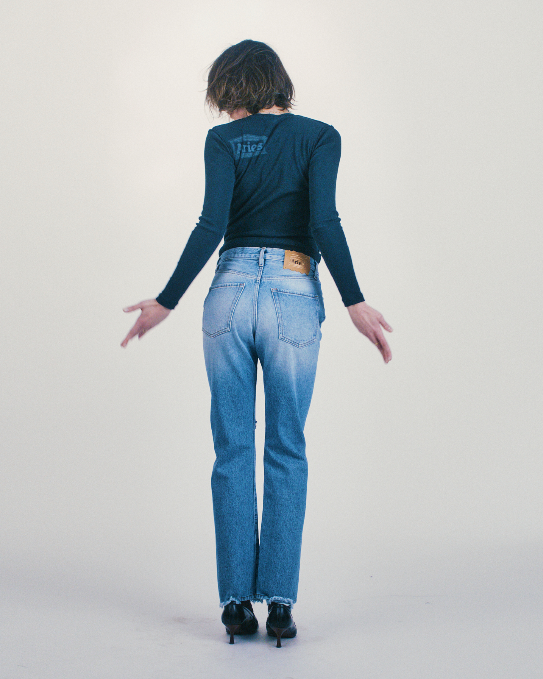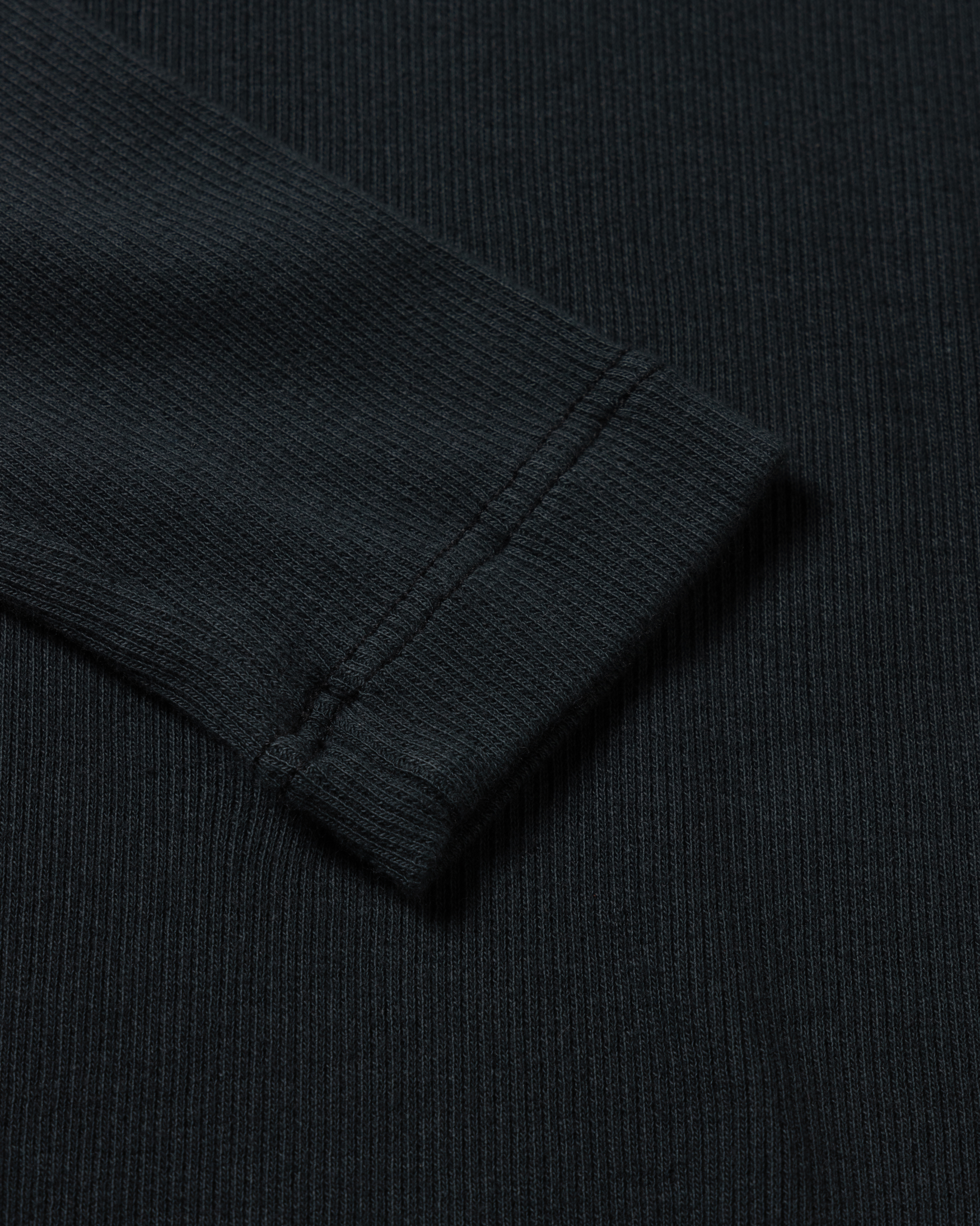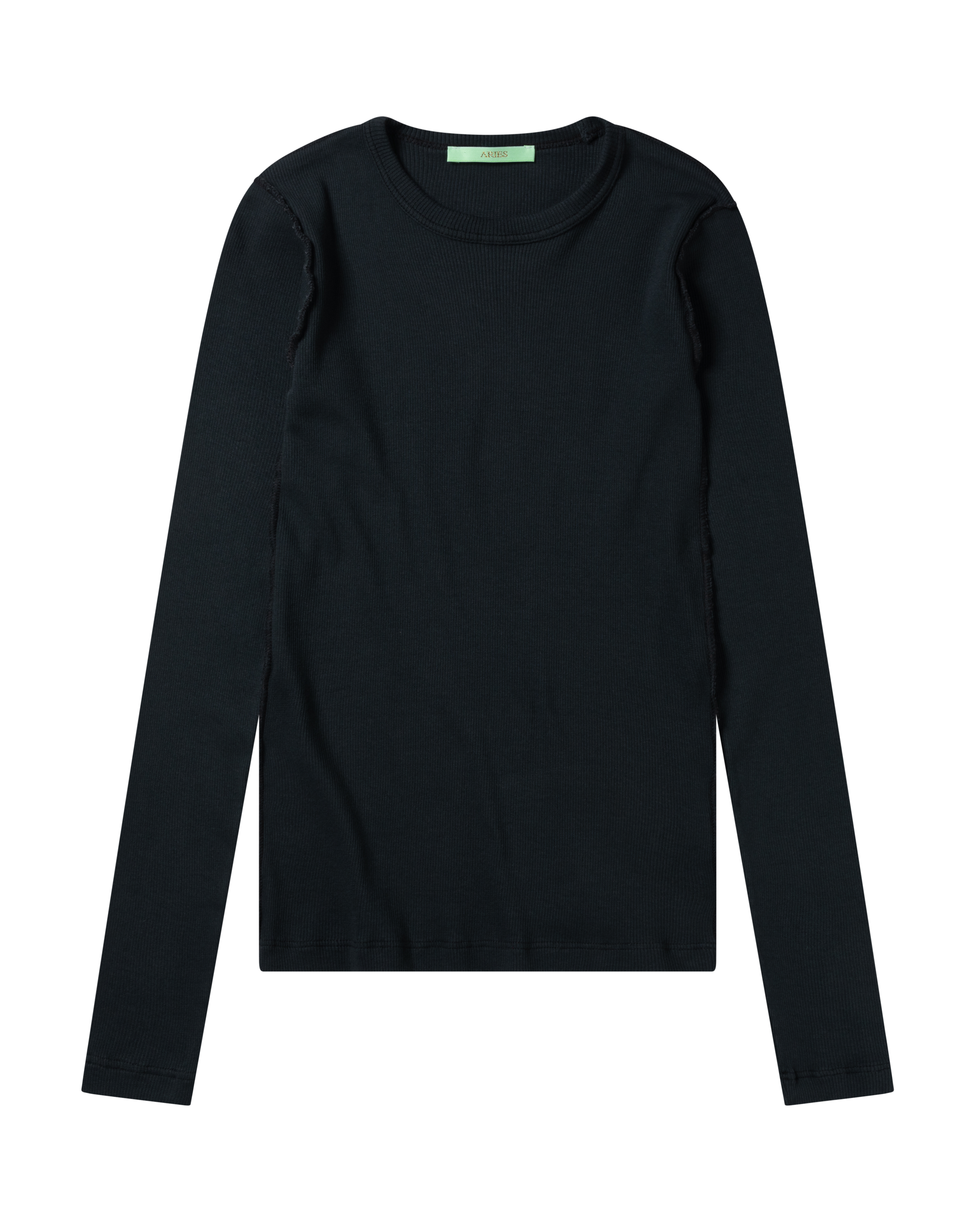 Shrunken long sleeved T-shirt in a lightweight ribbed cotton featuring an Ancient Temple screen printed on the back shoulder. 100% cotton.