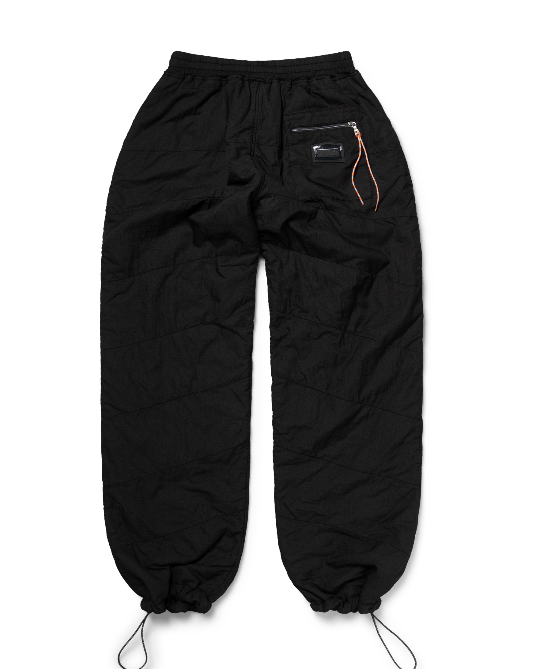 Unisex quilted mini ripstop nylon trackpant with chevron stitch detailing, using sustainable wadding from recycled PET bottles. With an elasticated waistband, ankle toggles and a back zip patch pocket with silicone temple patch. Folds down into its own bag. With a two-colour spray dye finish. 100% nylon.