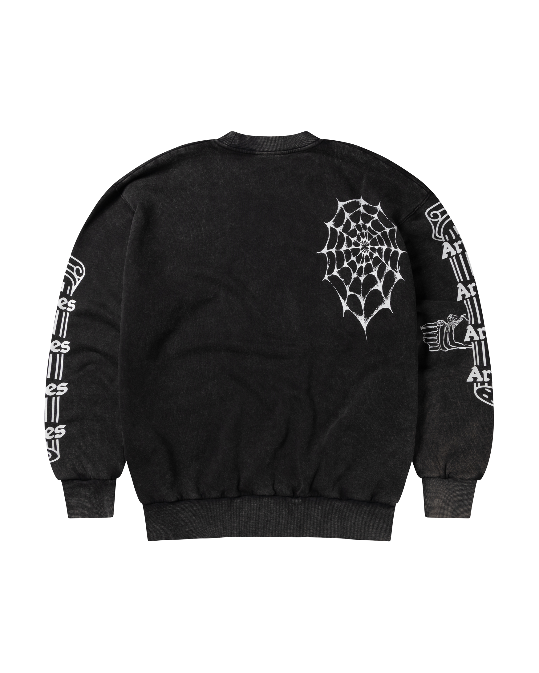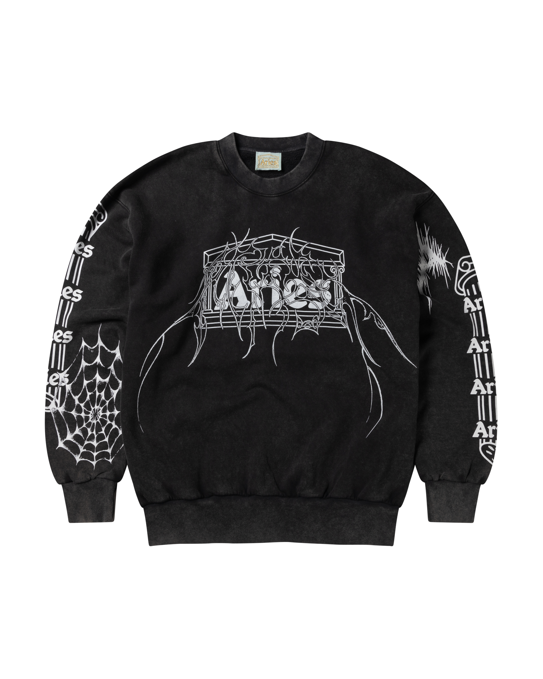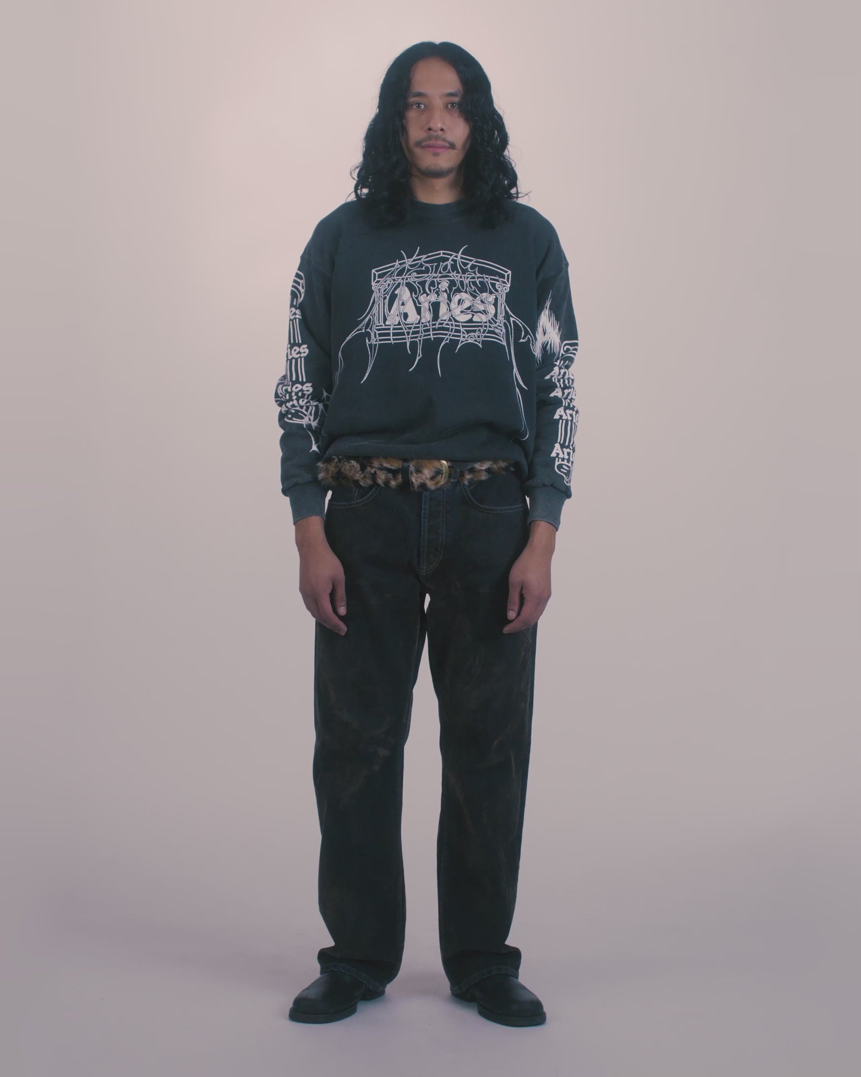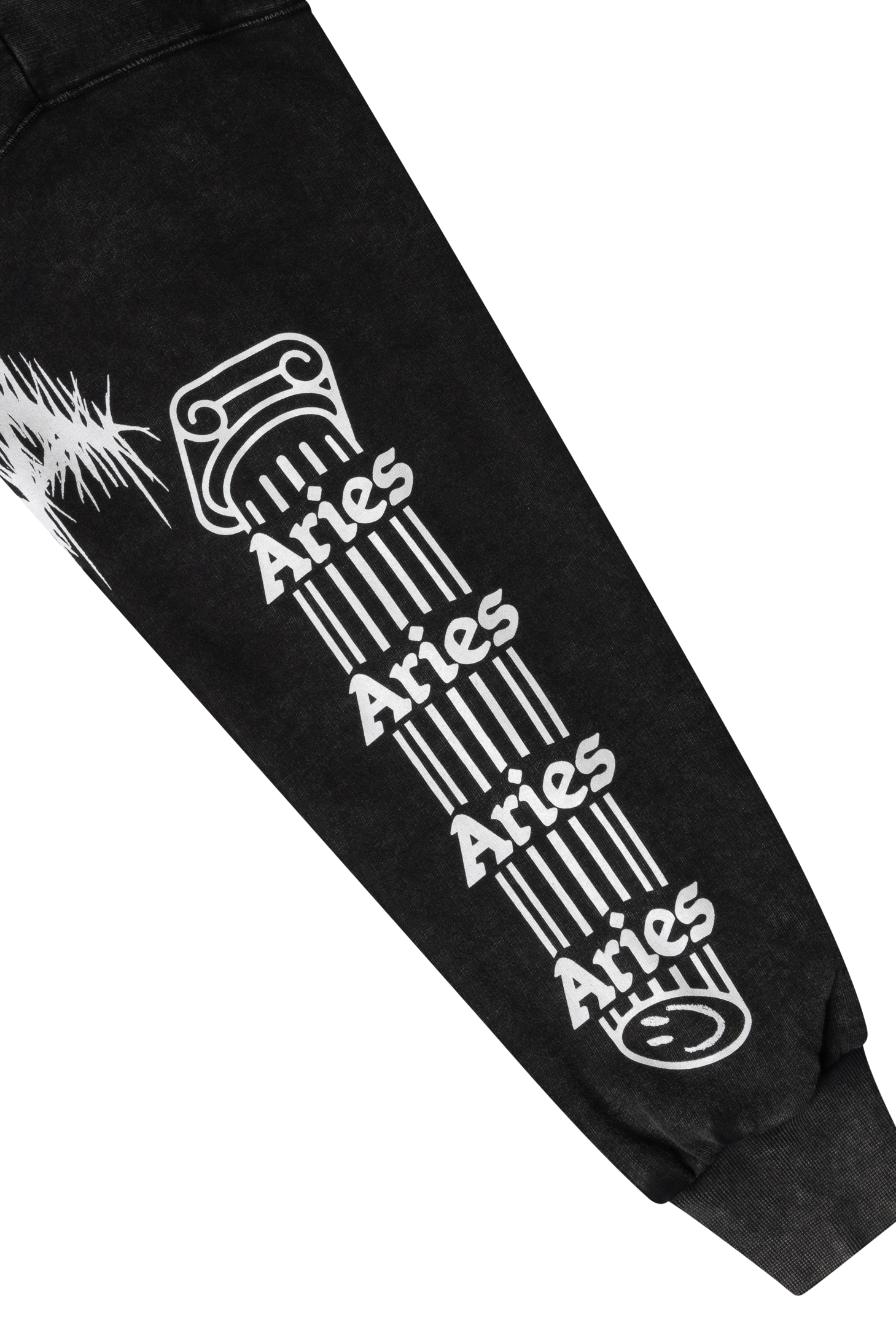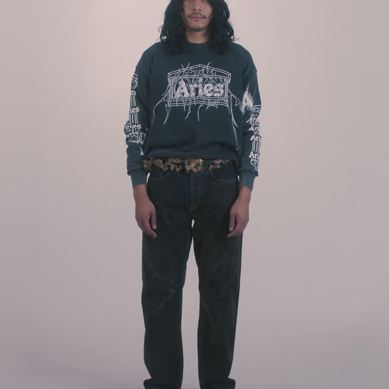 Unisex sweatshirt made from brushed-back cotton jersey fleece, loaded with classic Aries Temple and Column graphics screen printed on the front and sleeves, printed over in seasonal Overlord graphics. Finished with a wash treatment for an aged look. 100% cotton.