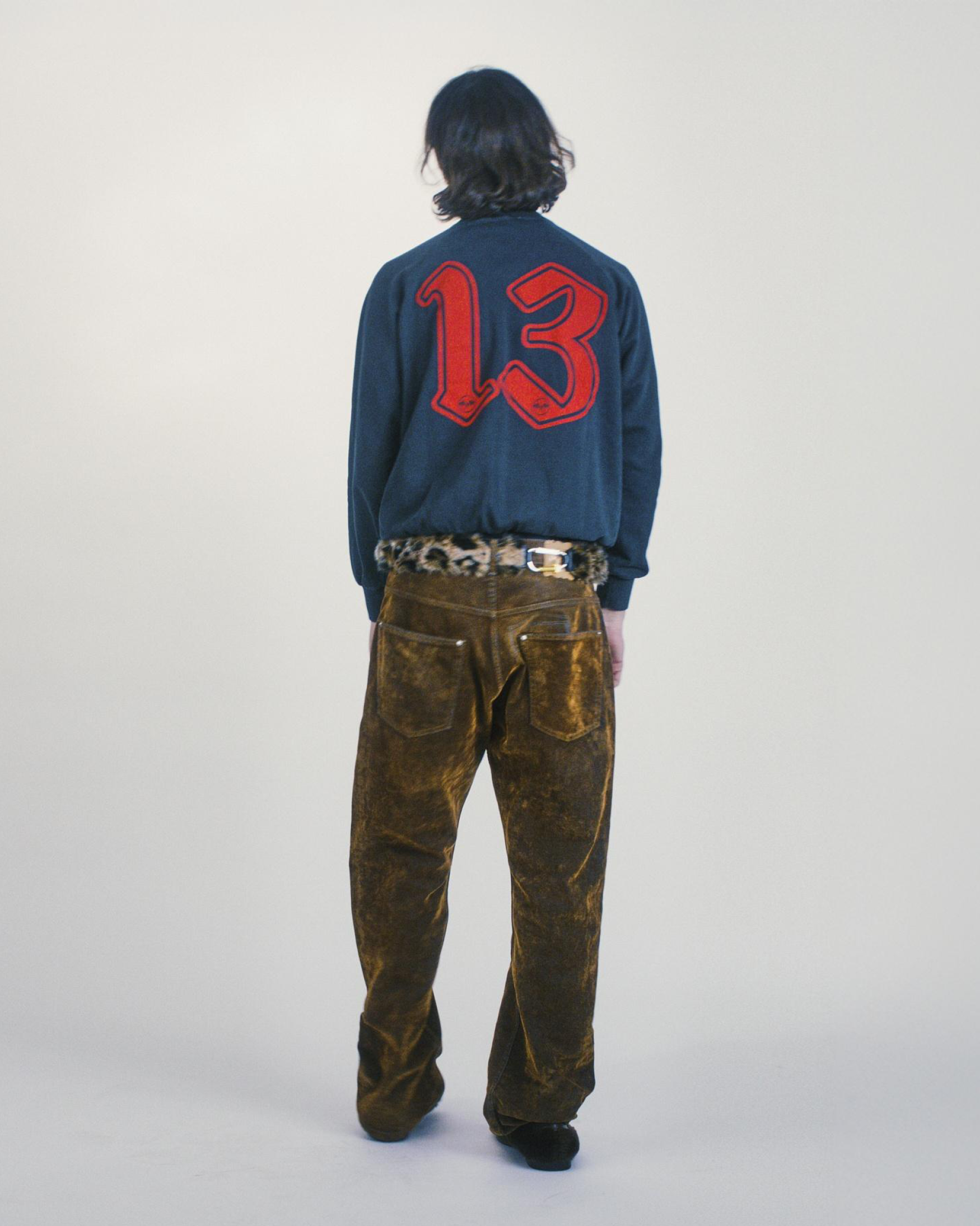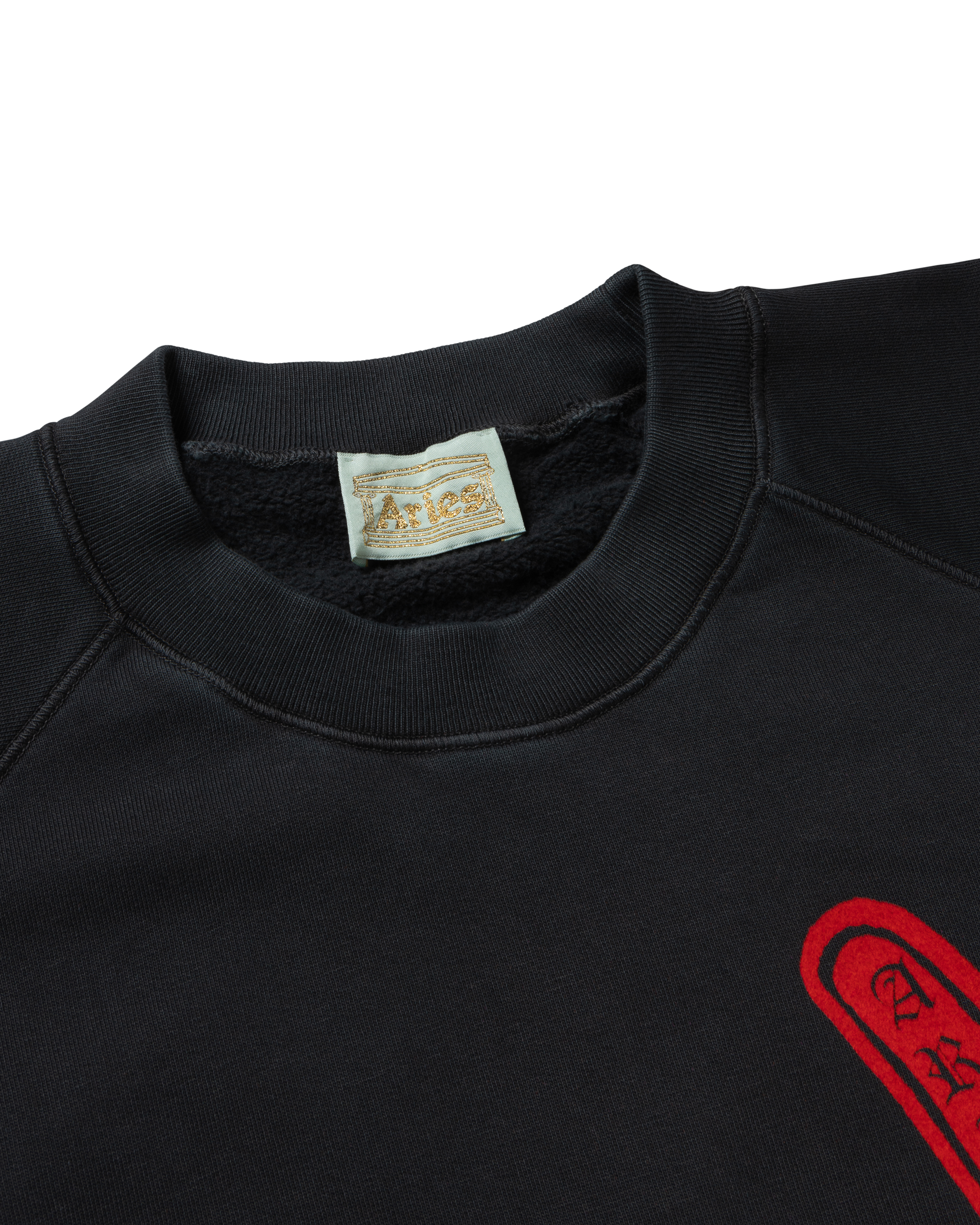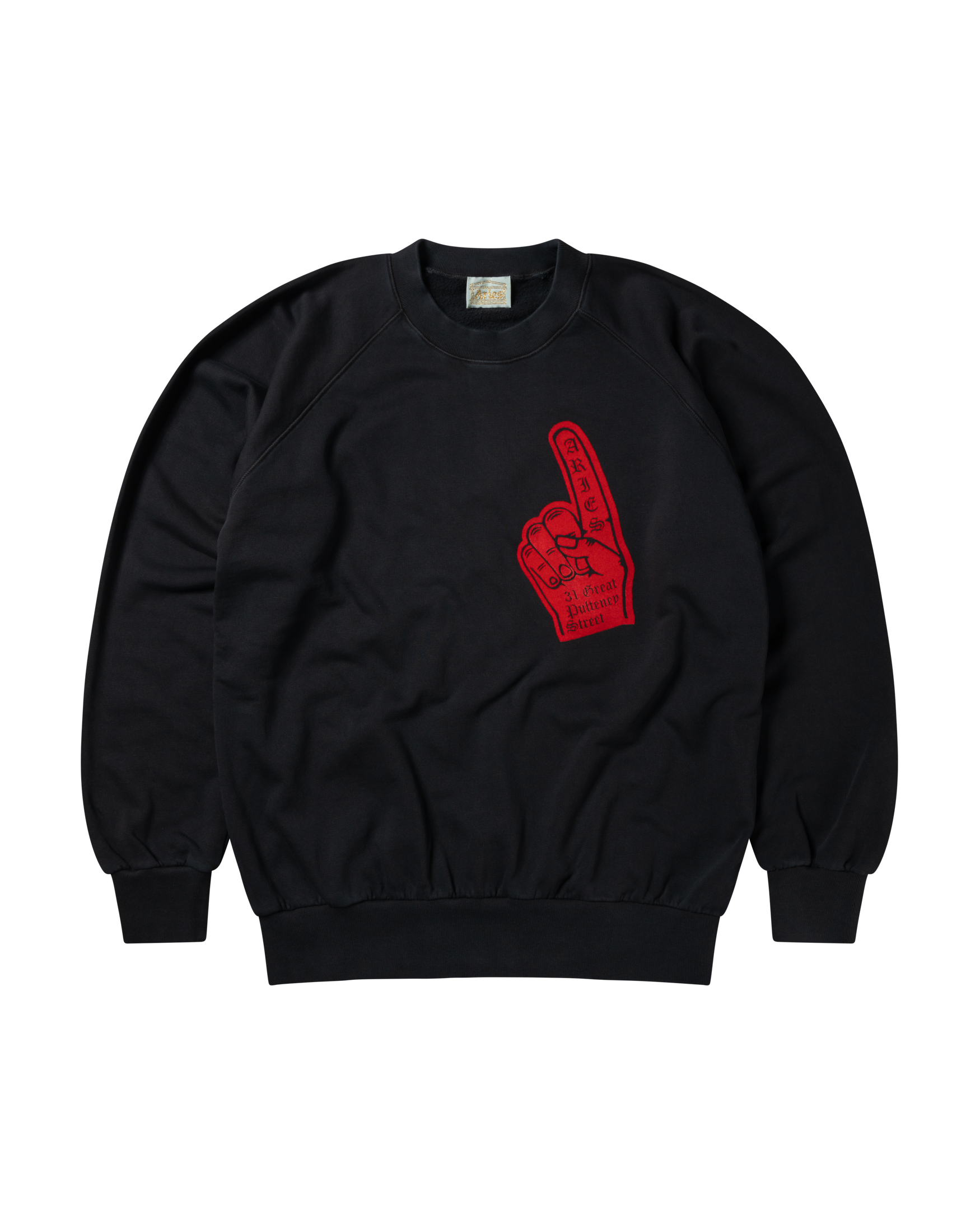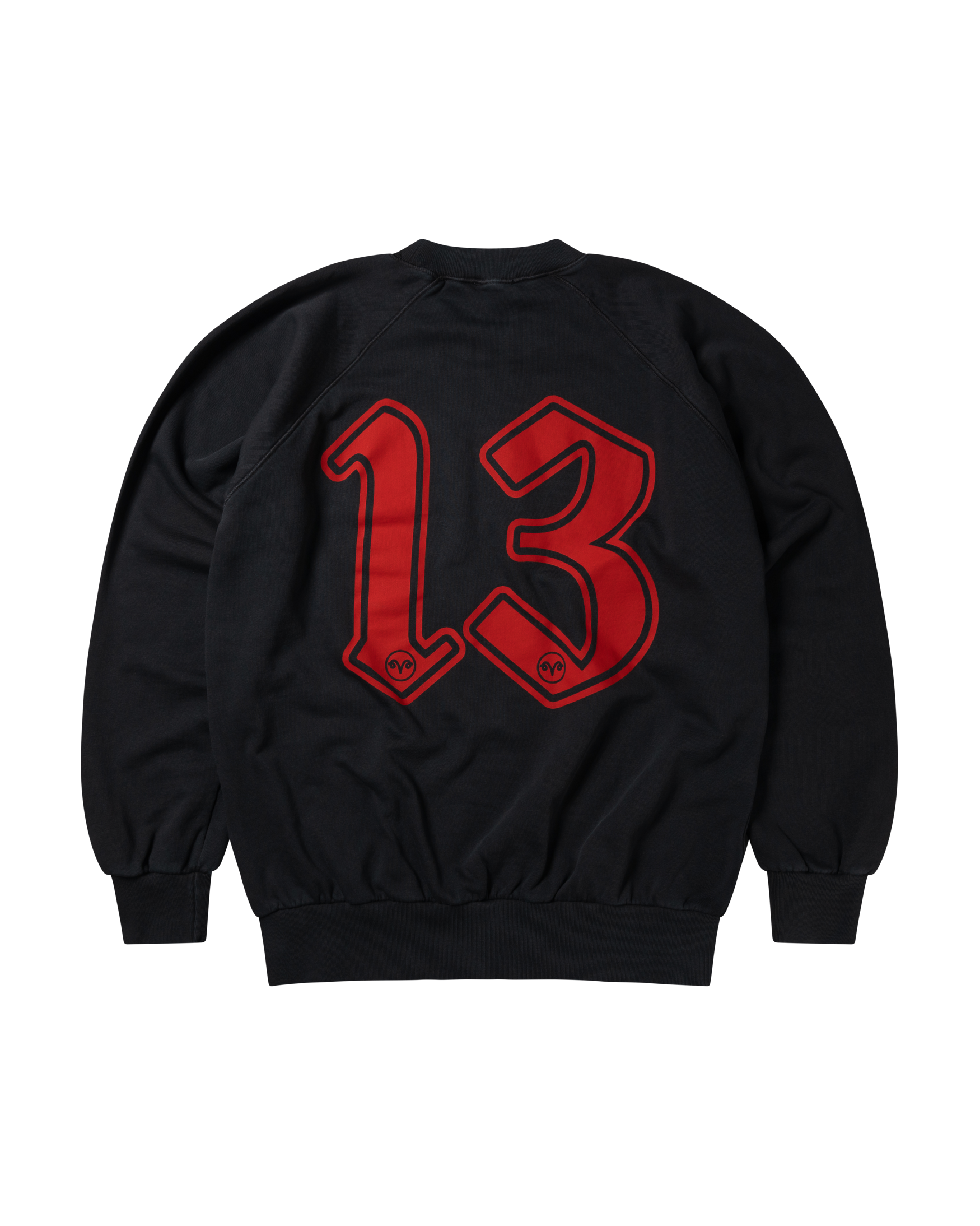 Raglan sleeve sweatshirt made from brushed-back jersey fleece, with a seasonal 'Supportive Finger' graphic flock print on the chest and big 'Unlucky 13' on the back in water-based print, finished with a stone wash treatment for a washed out, faded effect.