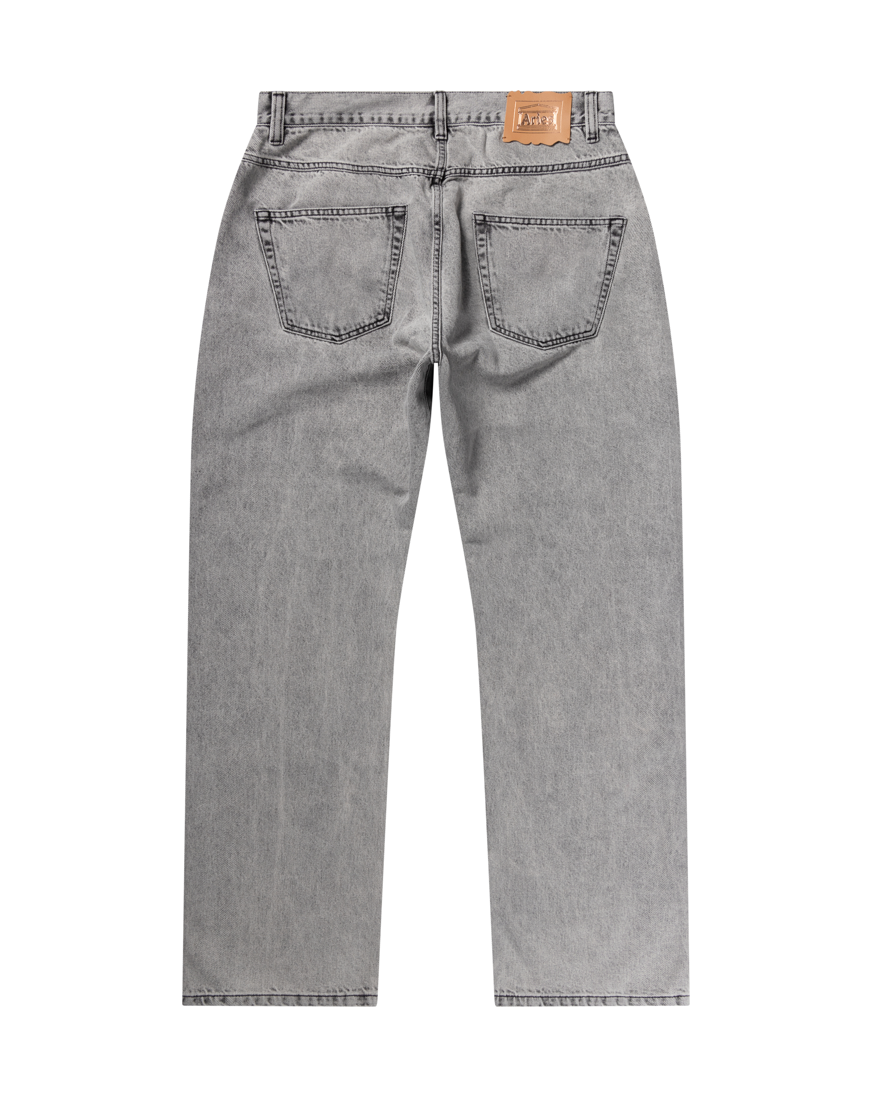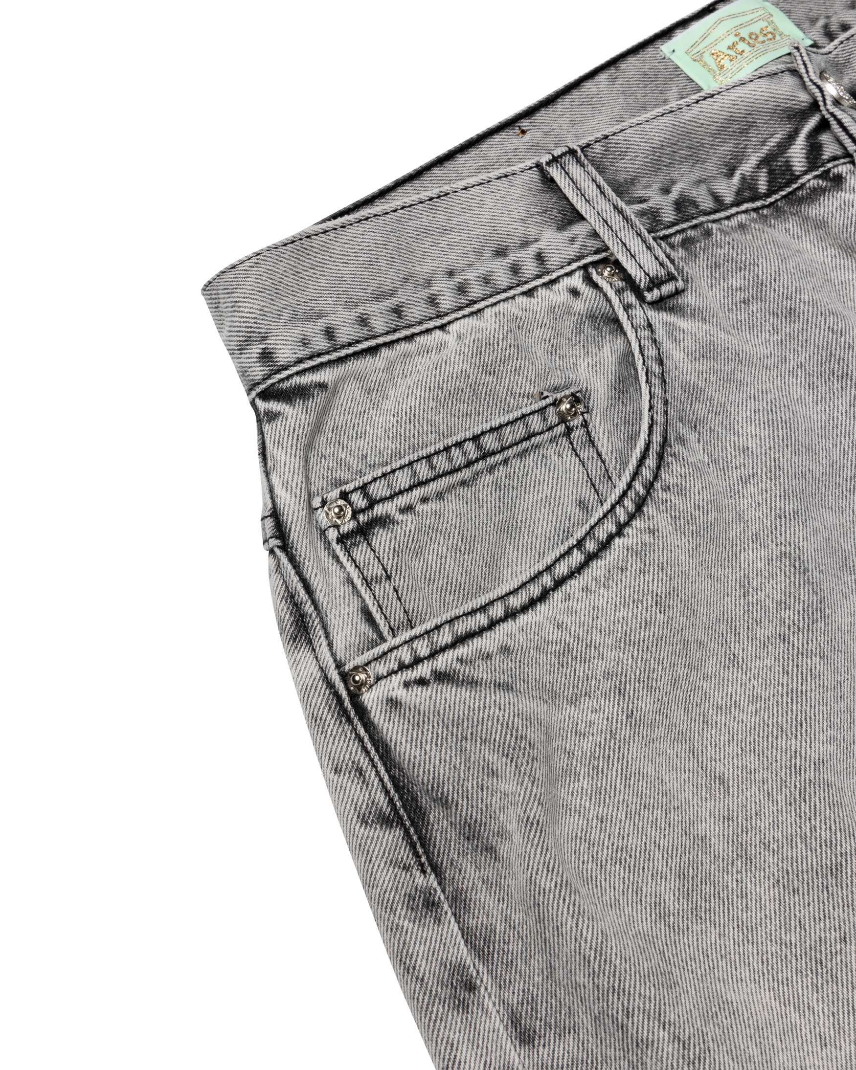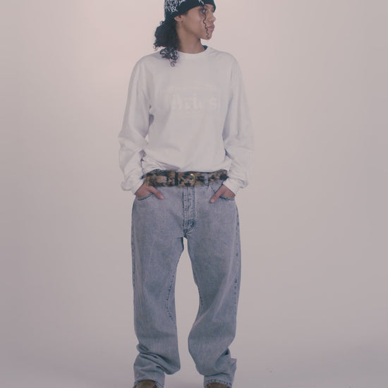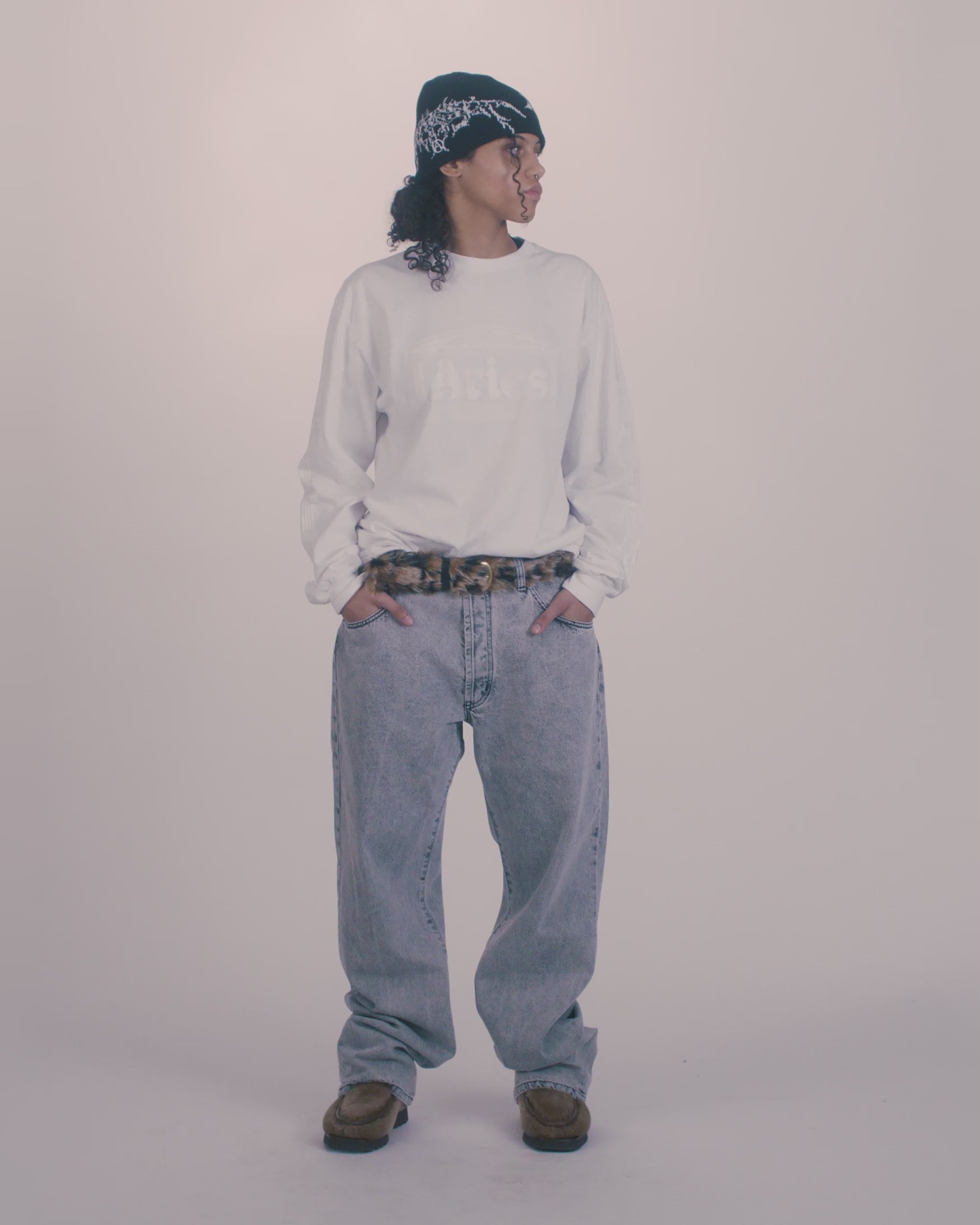 unisex vintage cut '90s-style skate jeans, meant to be worn super baggy. made out of 100% cotton blue denim. treated with an acid wash. with aries and destroy embroidery on the pocket.