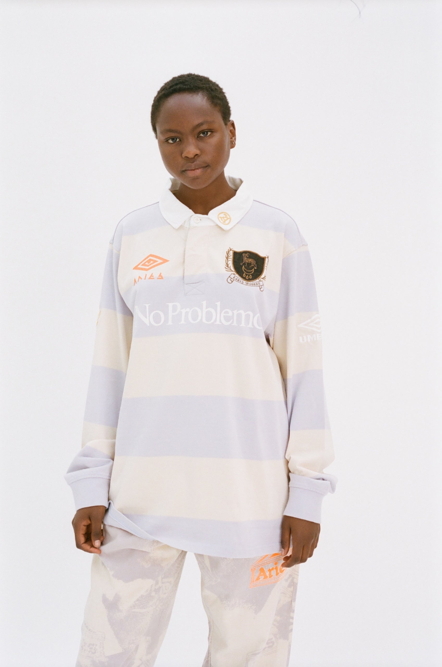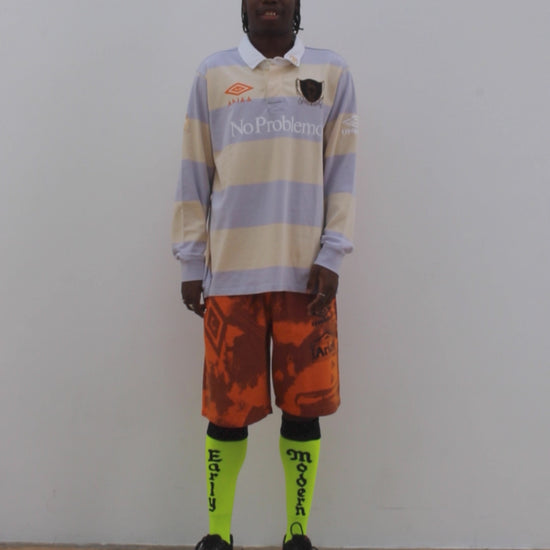Unisex vintage-style long sleeve rugby shirt in a knitted alabaster and lilac striped washed cotton. With a classic, contrast white collar and a buttoned quarter placket opening. With an inked design in fluoro orange on the back, and decorated with a mixture of printed and embroidered Aries x Umbro collab branding, Aries classic graphics and esoteric runes and symbols. With a custom rugby crest on the chest that oozes mysticism and cult tendencies. 100% cotton.