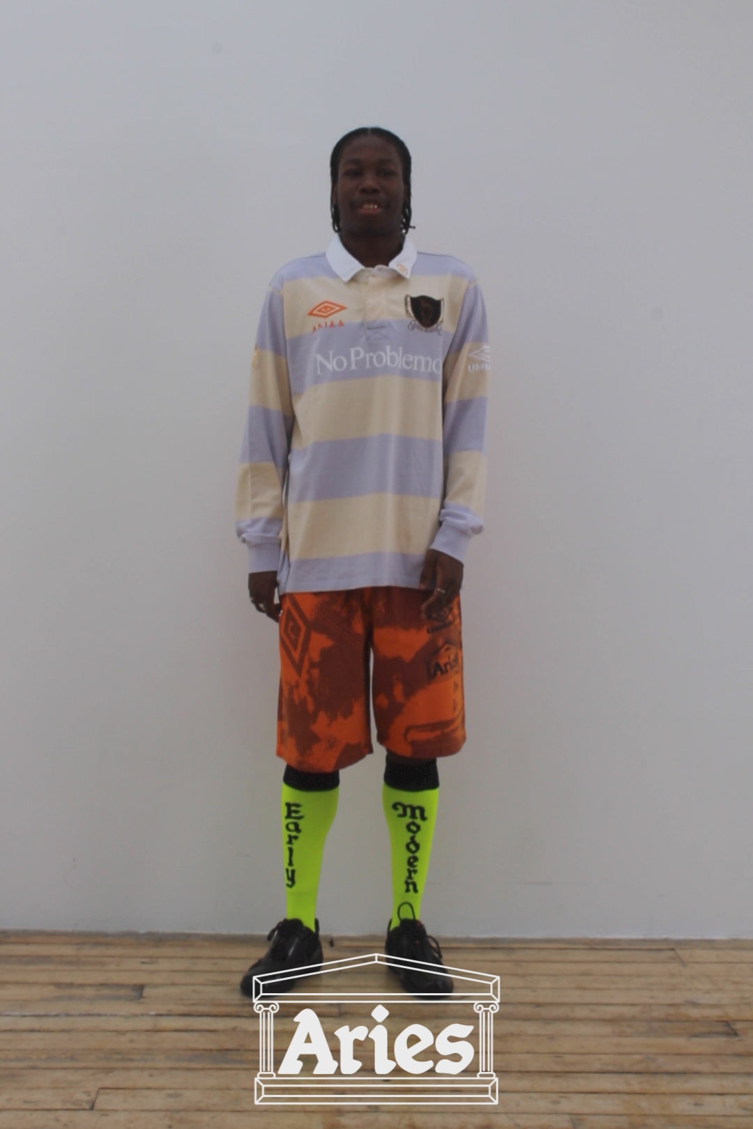 Inspired by the mud-stained nostalgia of the rugby field and shot by award-winning photographer, Elaine Constantine, this 5 sku Aries x Umbro capsule-collection merges traditional rugby attire with Aries’ renowned dyeing techniques and transcendental graphic hand.