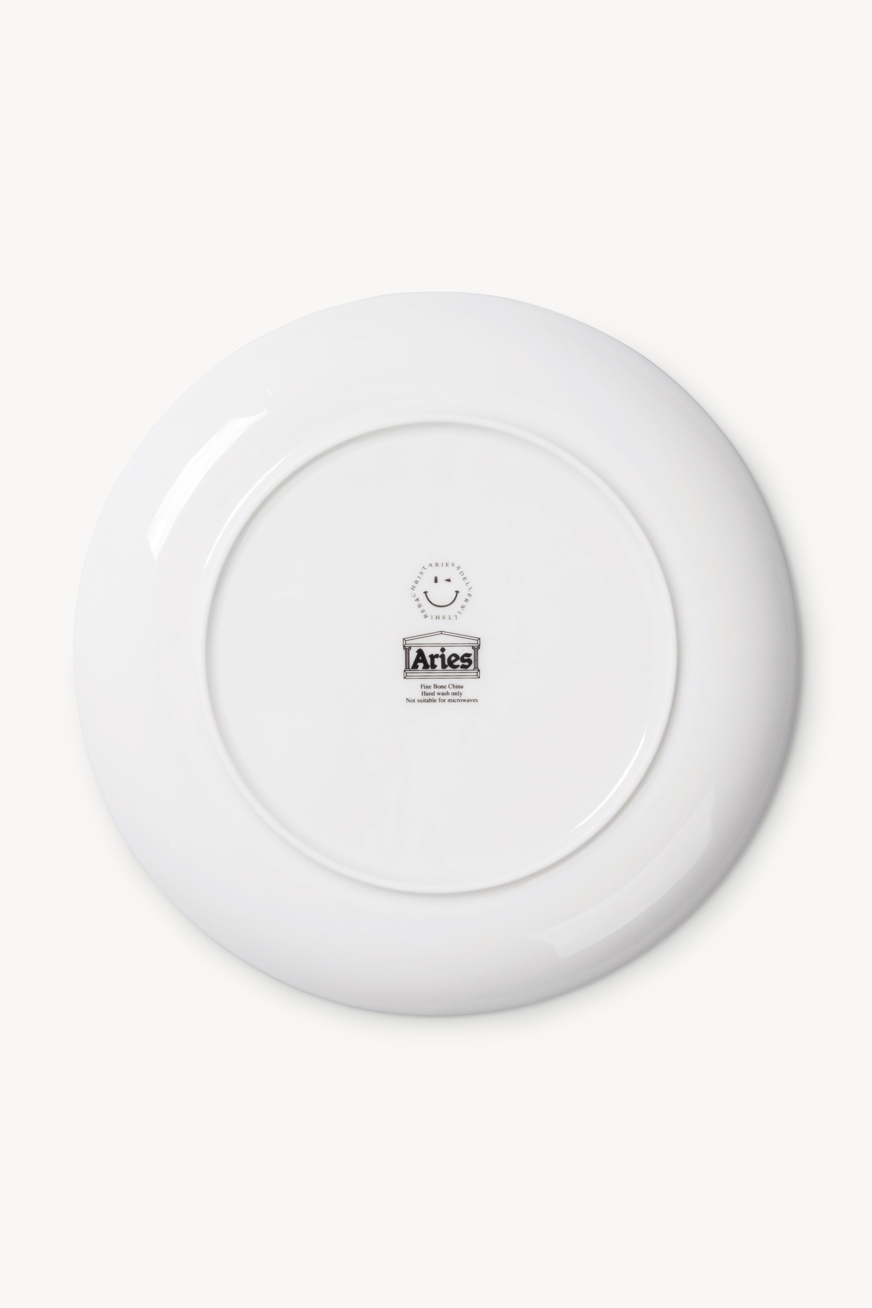 Jeremy Deller x Aries large bone china plate approximately 270mm diameter with Stonehenge and Smiley graphic in gold leaf, grey and black. Jeremy Deller x Aries tableware collection consists of plates and mugs that display graphics inspired by Stonehenge and Neolithic sites surrounding Wiltshire.