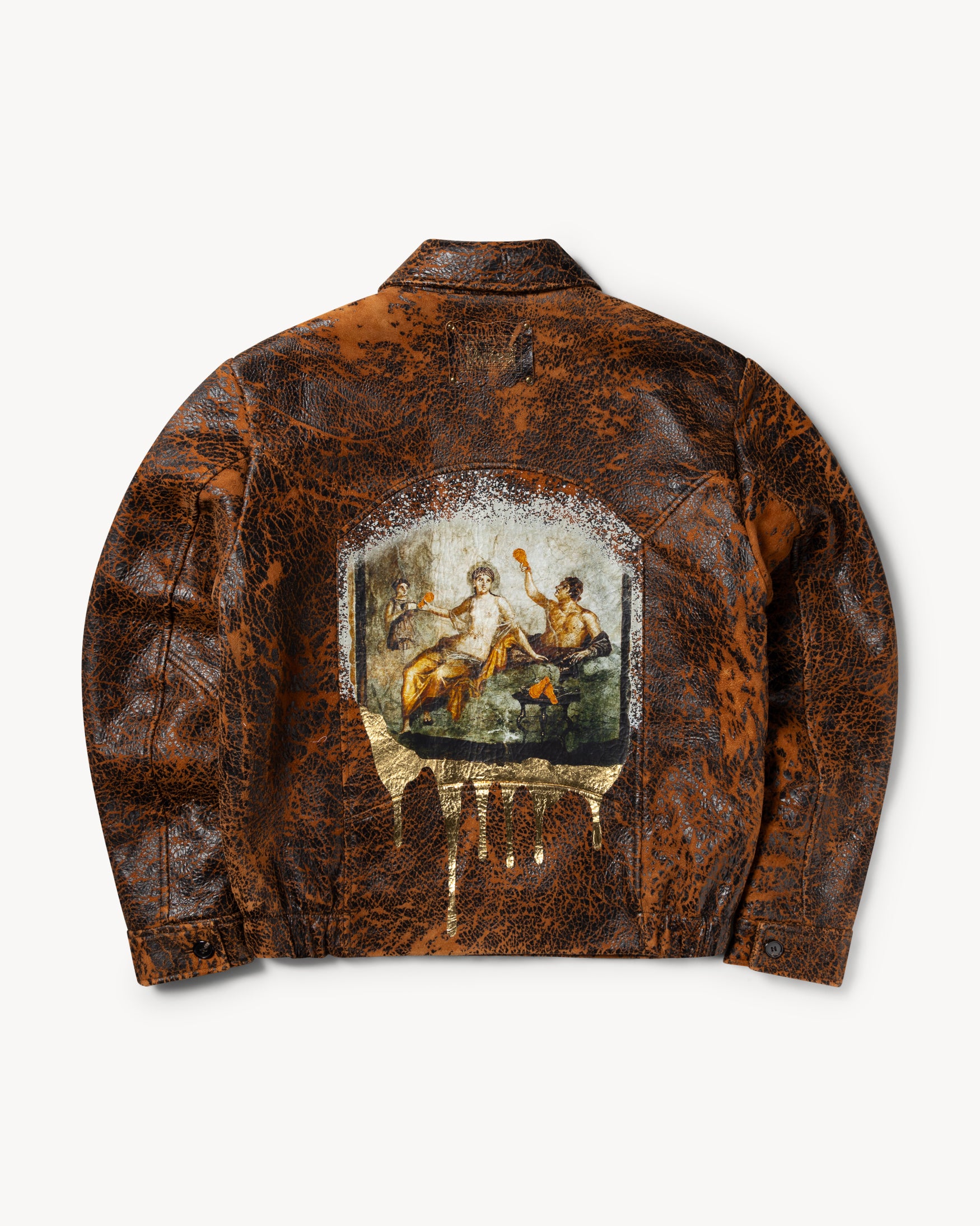 Premium coach jacket with classic Western-inspired detailing, crafted in distressed lamb leather for a vintage-effect finish. Features an Aries x KFC Temple Drip logo on the front and a full-colour fresco graphic across the back, combining matte ink with gold foil accents for a rich, textured look.