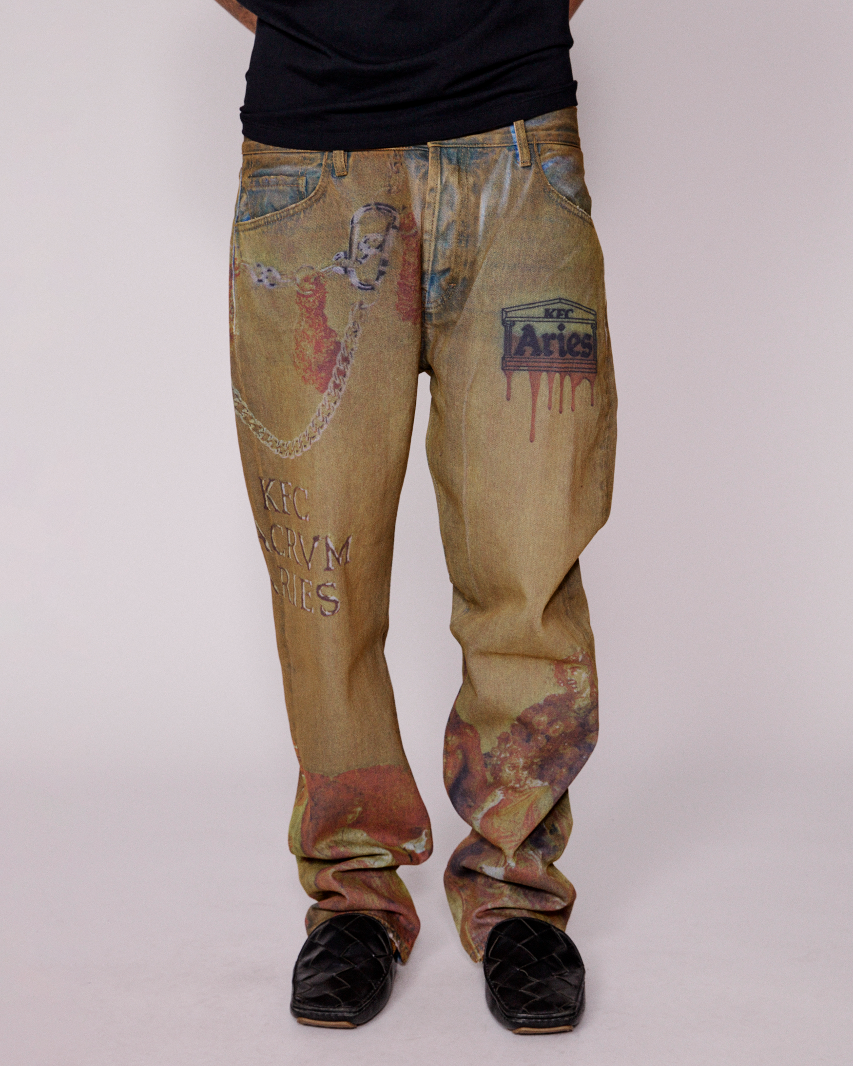 ARIES partners with KFC to present a ten-piece limited-edition collection that blends classical art references with streetwear silhouettes in a bold tribute to KFC’s iconic gravy. The capsule includes digitally printed denim, gold-detailed tees and sweats, and a standout distressed leather jacket featuring Renaissance-inspired artwork. Designed with irony and craftsmanship in equal measure, each piece reflects a shared celebration of indulgence, ritual, and irreverence.
