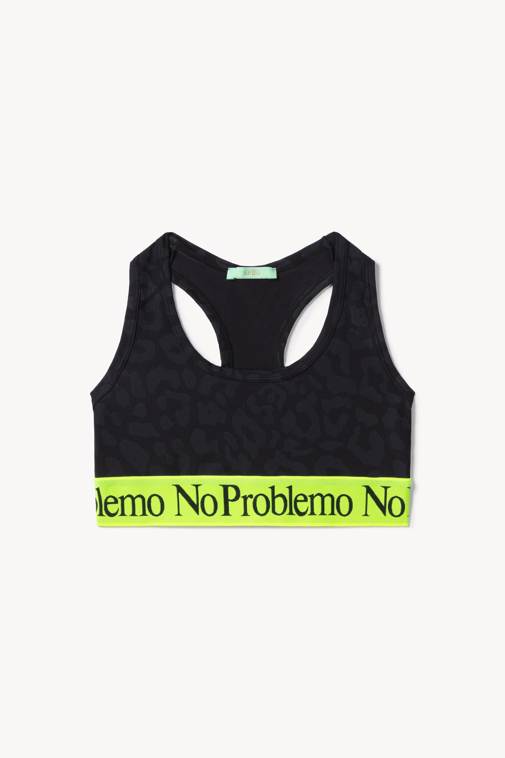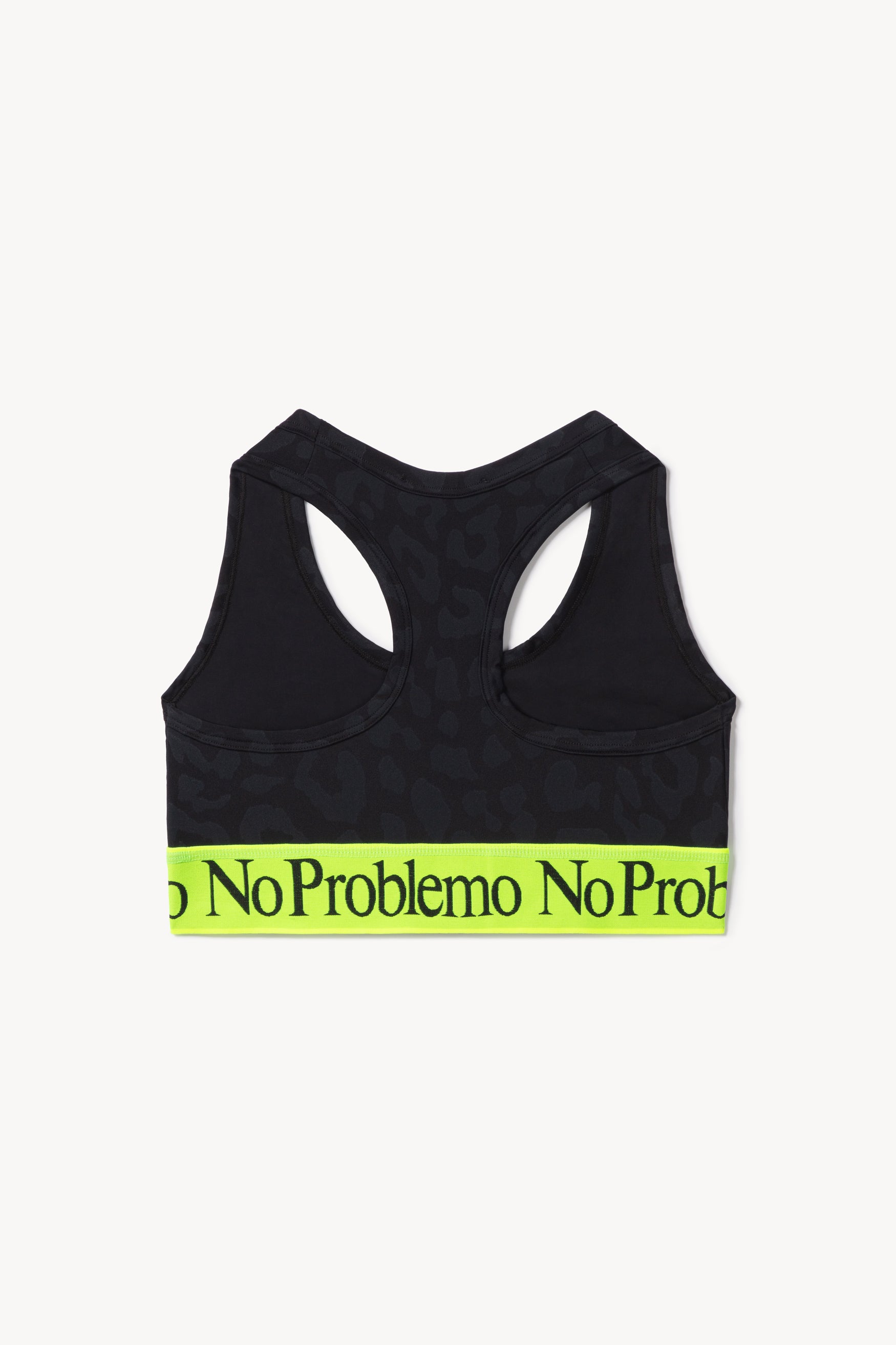 Comfortable lycra sports bra top with subtle Leopard print and fluorescent yellow 'No Problemo' elastic waistband. Comes in purple & black.