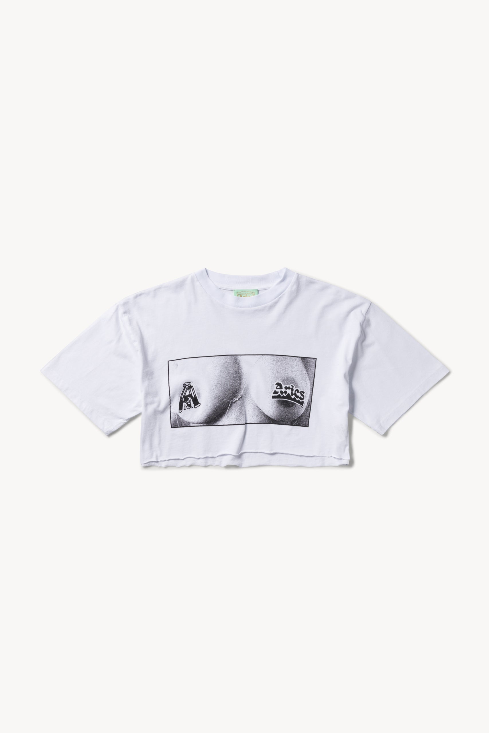Unisex cropped short sleeve t-shirt made from 100% cotton jersey. With an archive screen-printed Boobs graphic and raw hem. Made in Italy.
