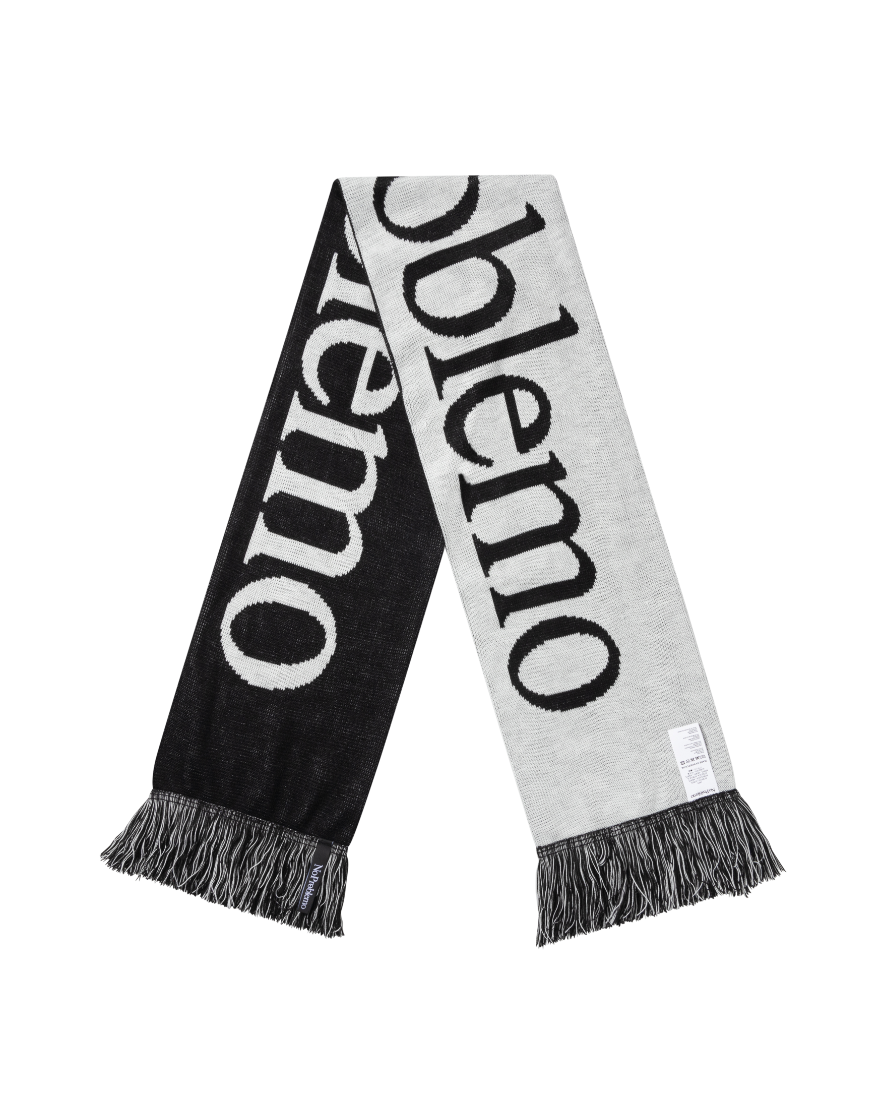 Knitted acrylic football-style scarf with a No Problemo intarsia design and fringed ends.