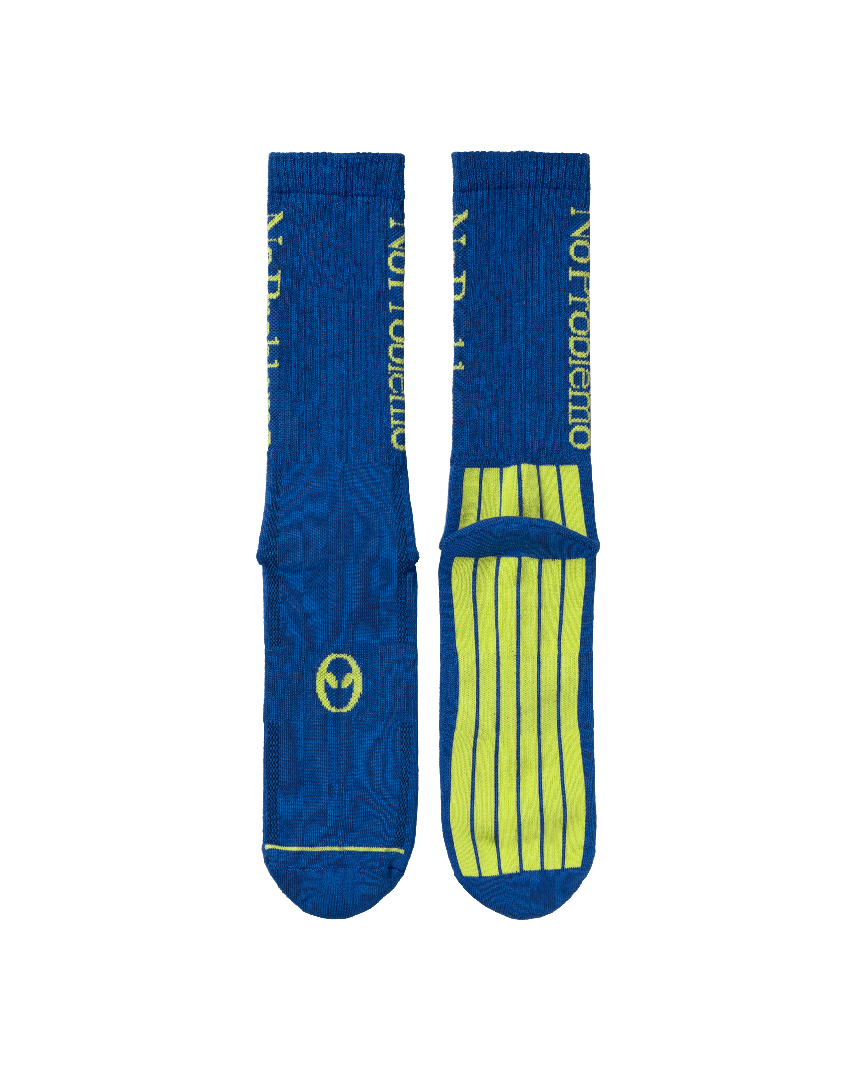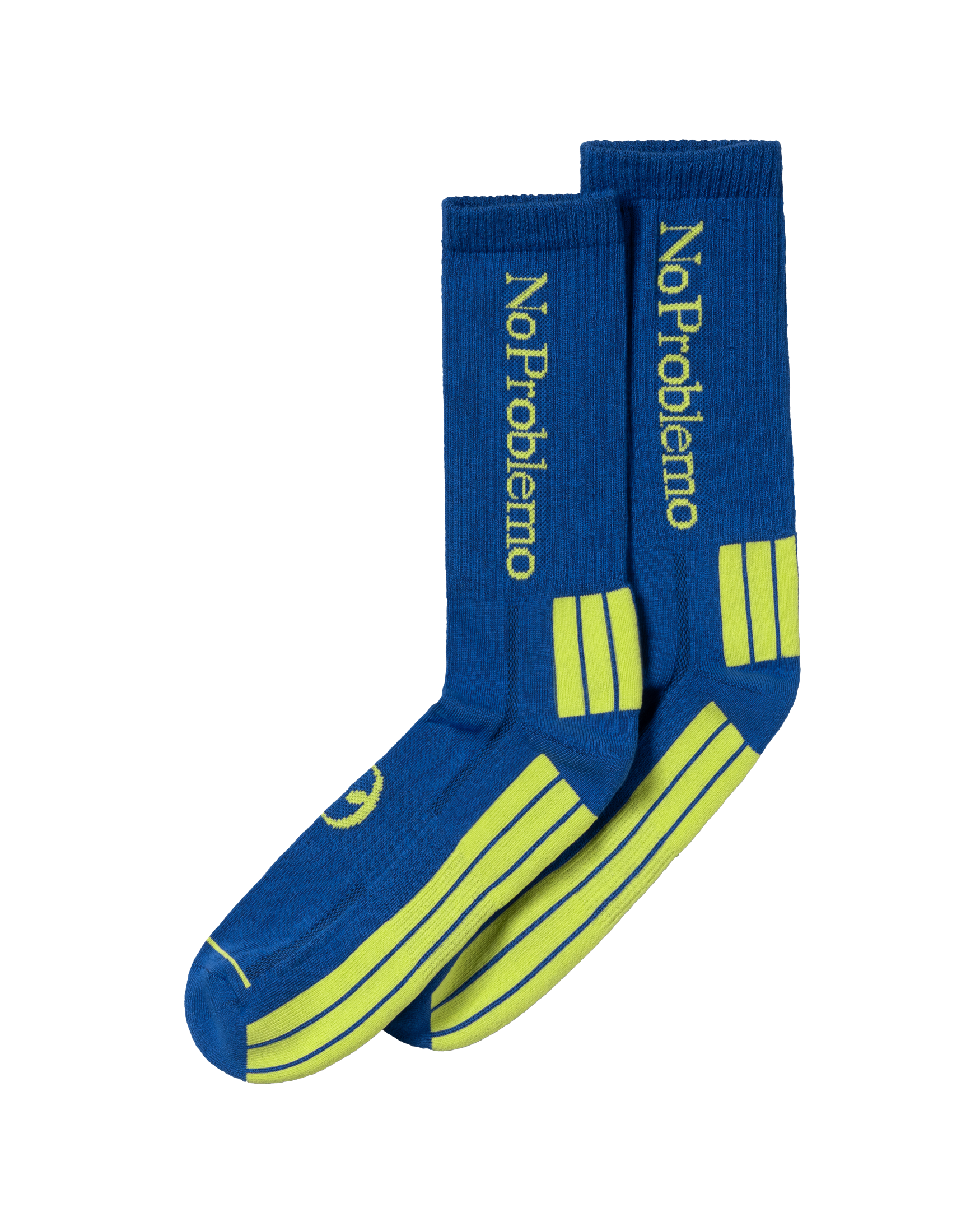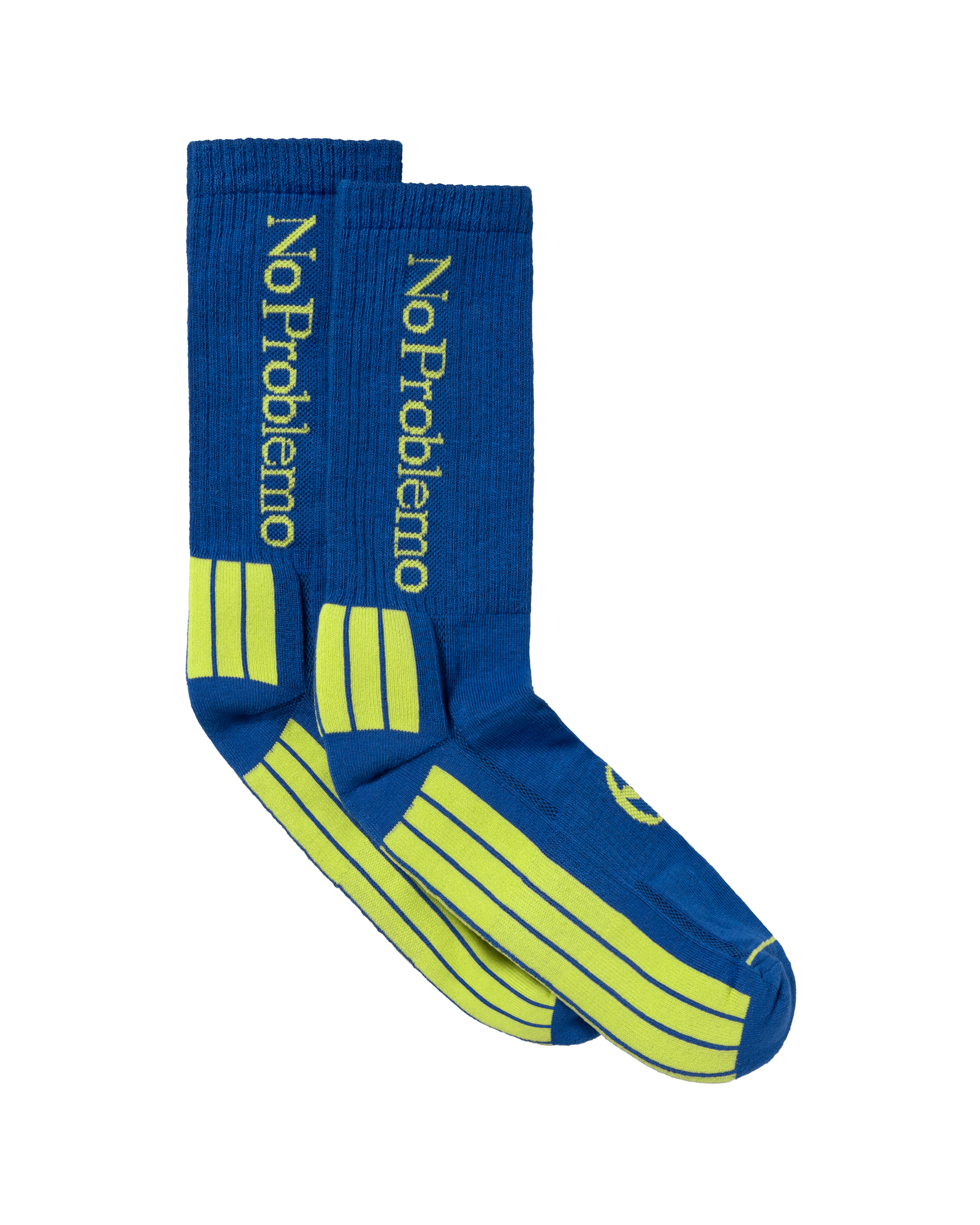 Jacquard socks in a sports-blend mix yarn featuring No problemo graphic.