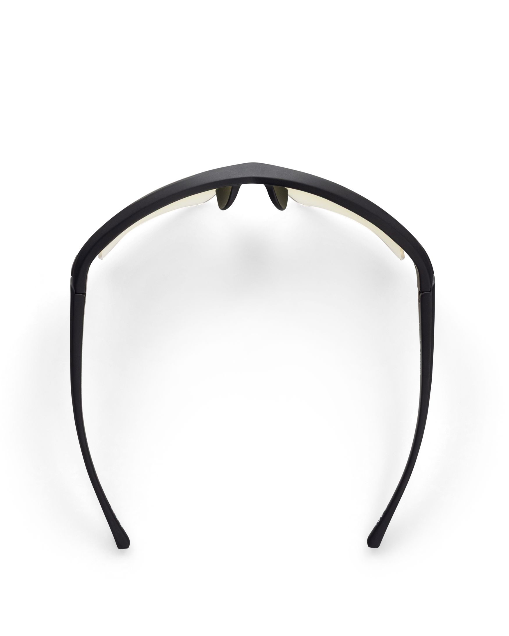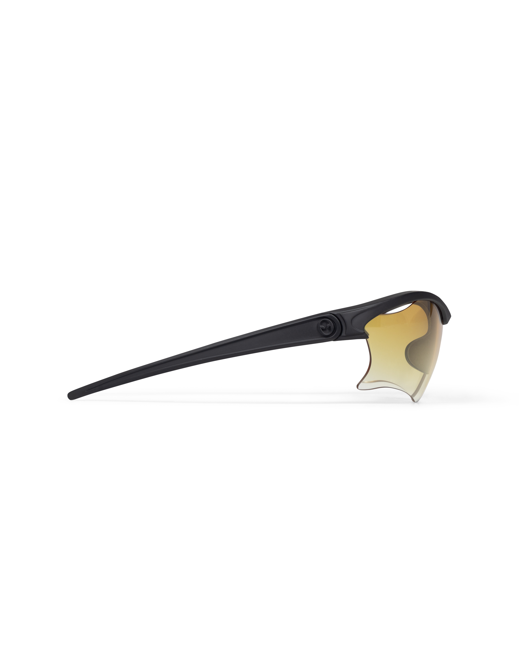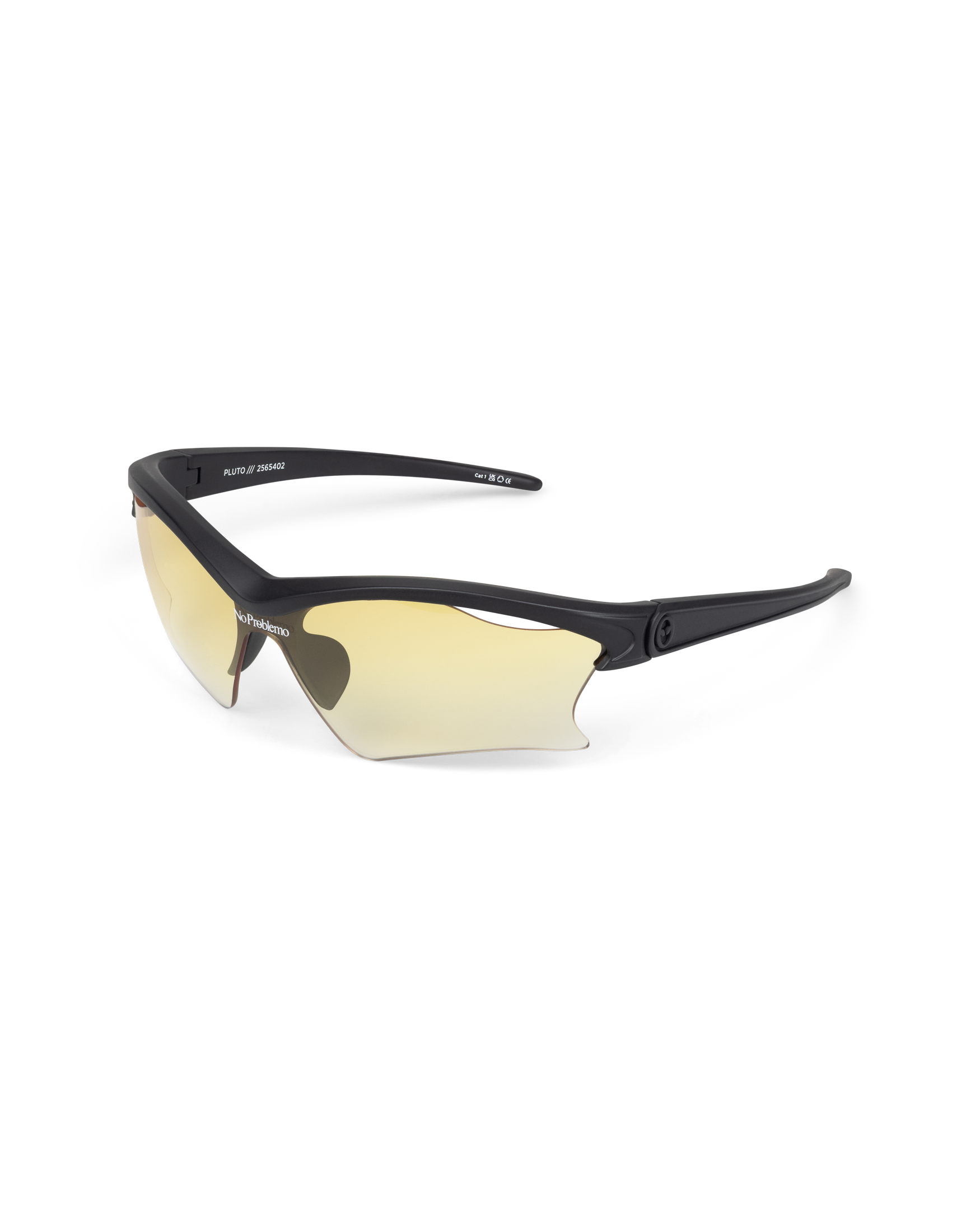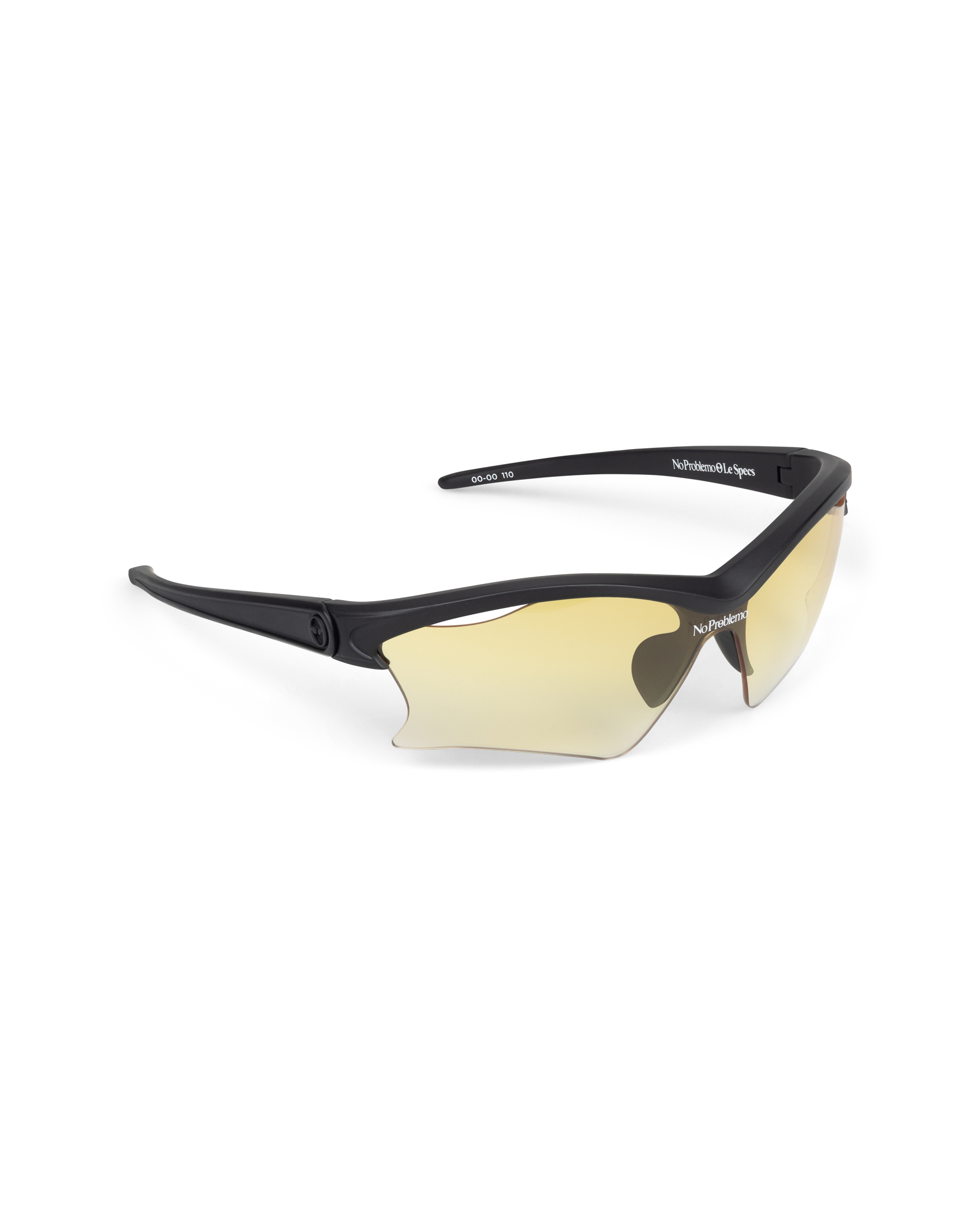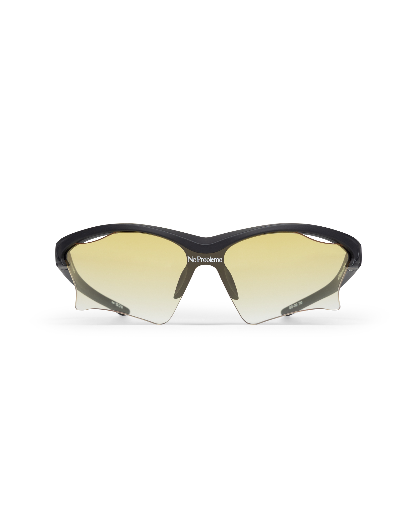 designed with sleek and sweeping proportions, the pluto wraparound semi rimless shield sunglasses are a modern update on the early 2000s racer style. featuring cut out lens accents and three dimensionally moulded frame profile with signature alien head motif embossed into temple, this frame is finished with signature no problemo logo lens print to centre front and tapered tubular temples for a comfortable fit.