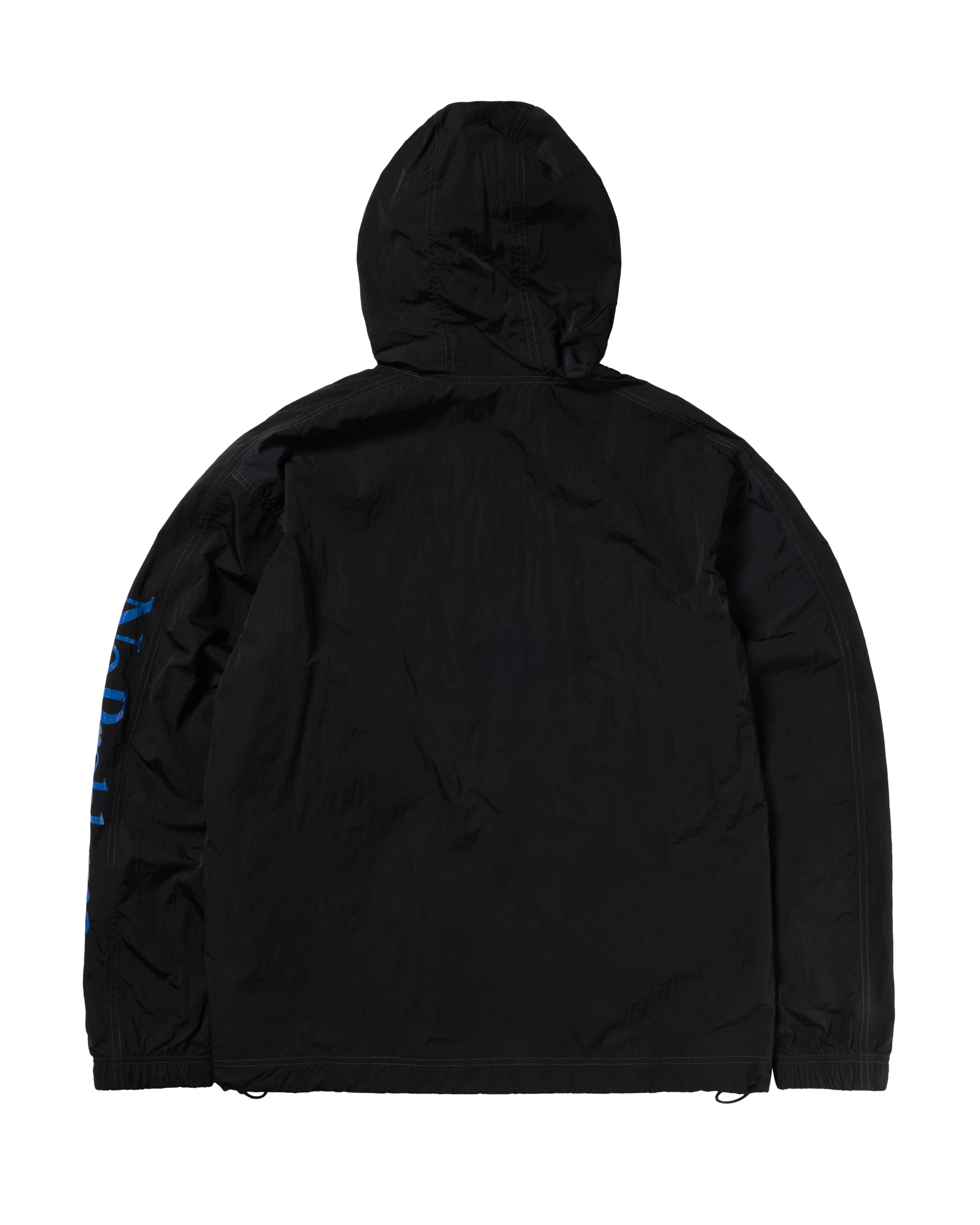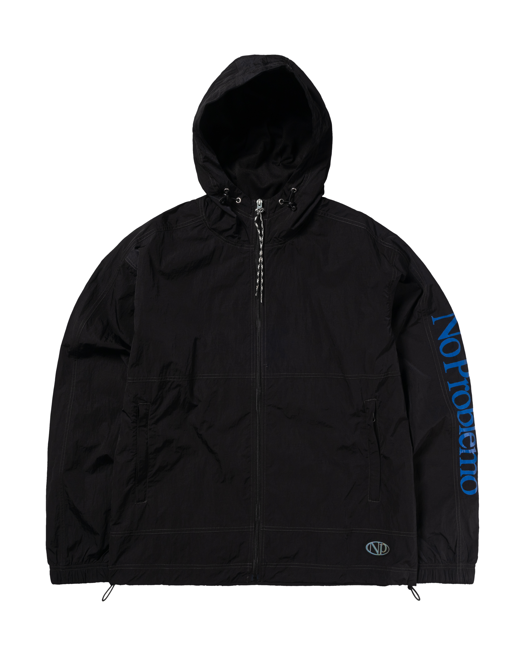 Unisex lightweight zip through hooded nylon track-jacket with mesh lining, adjustable elastic cord at hem and hood. Featuring a No Problemo print down the sleeve and a holographic NP graphic silicone patch.
