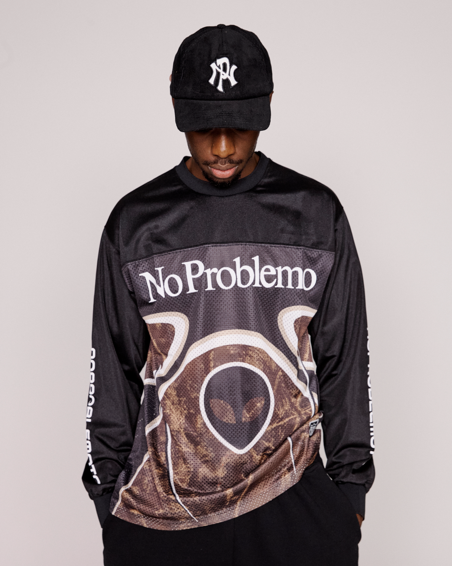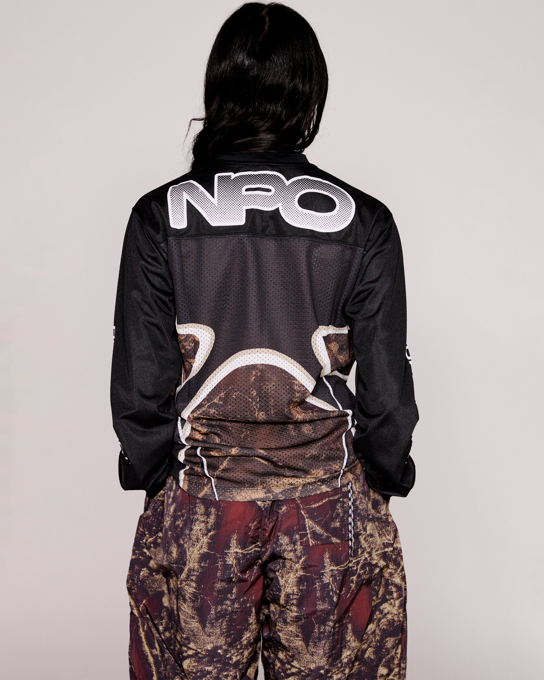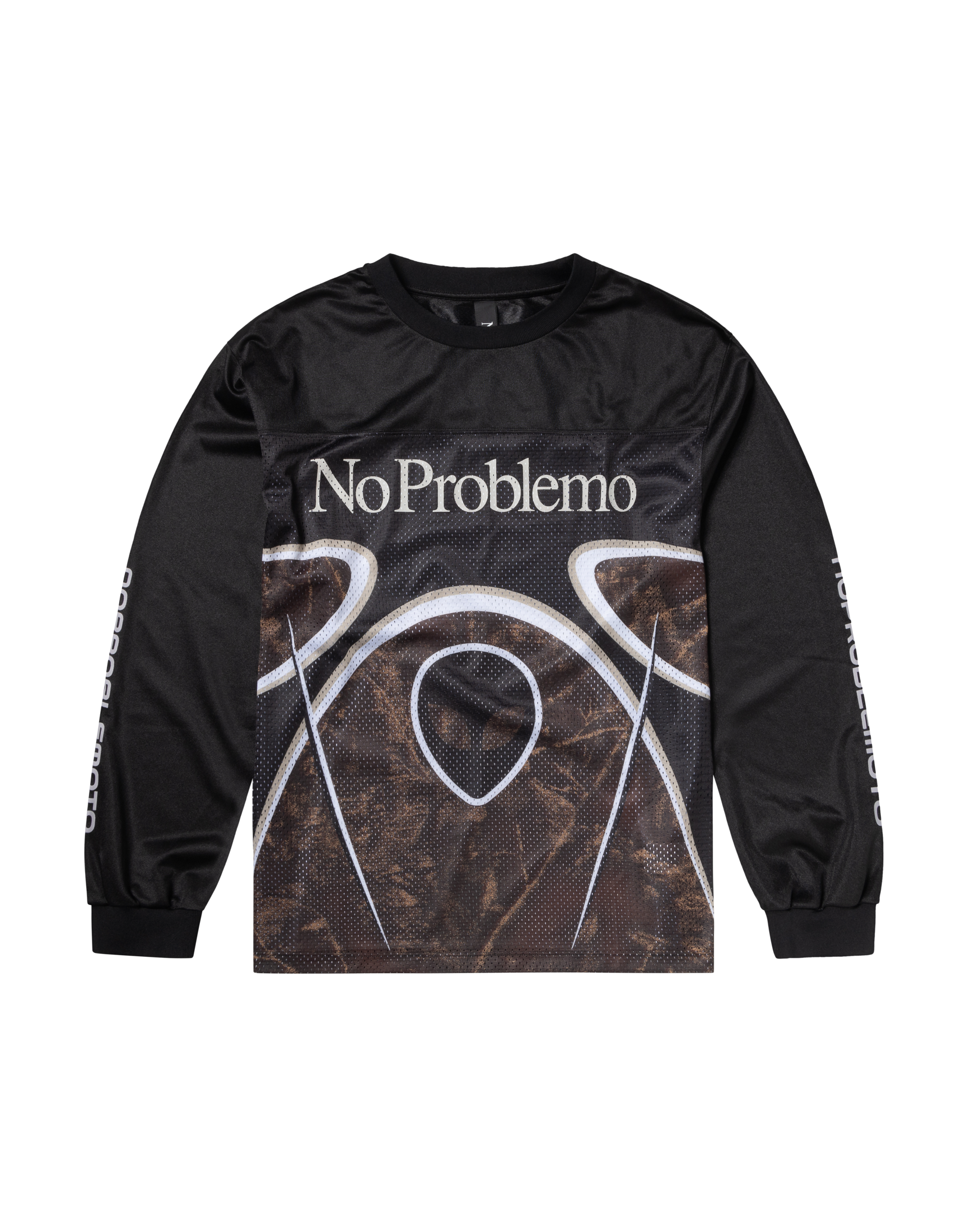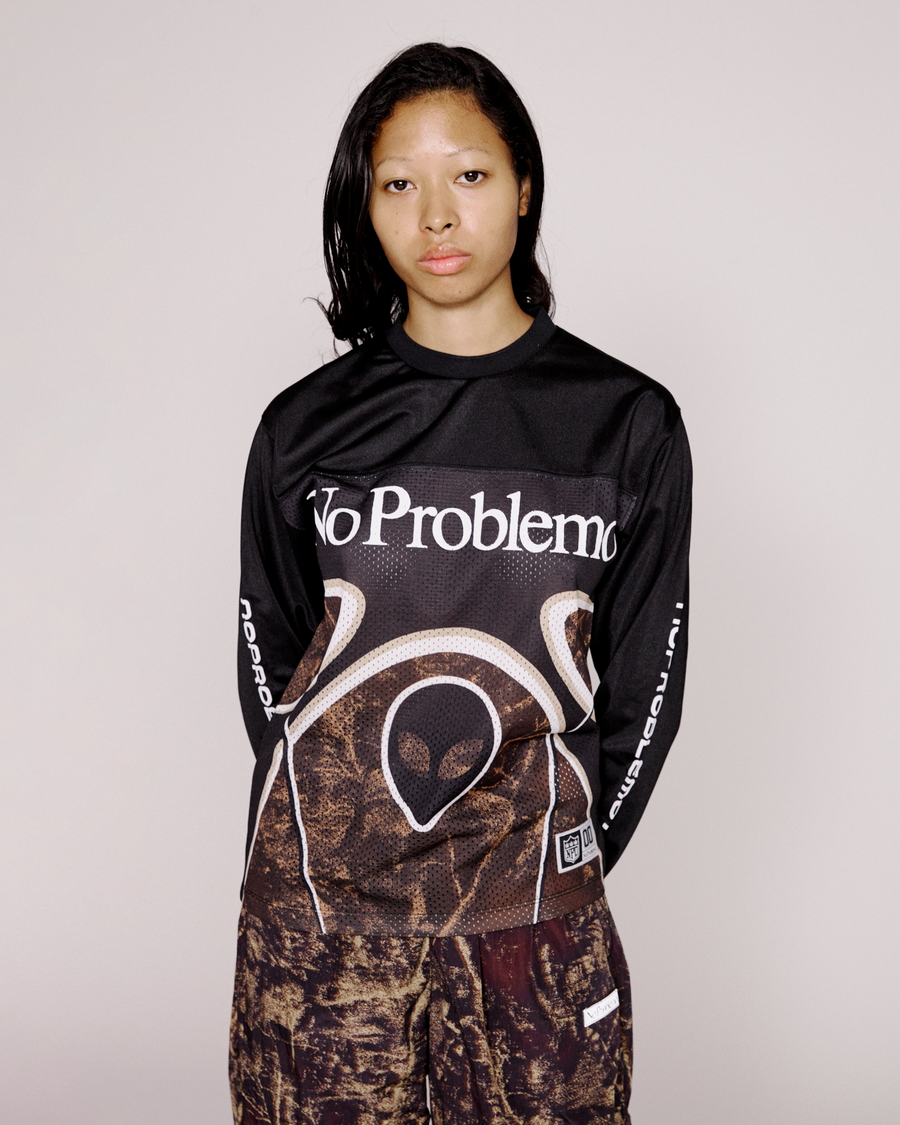 printed polyester and mesh moto shirt with alien graphic print, tree camo allover print and no problemo screen print on the sleeve and reverse.