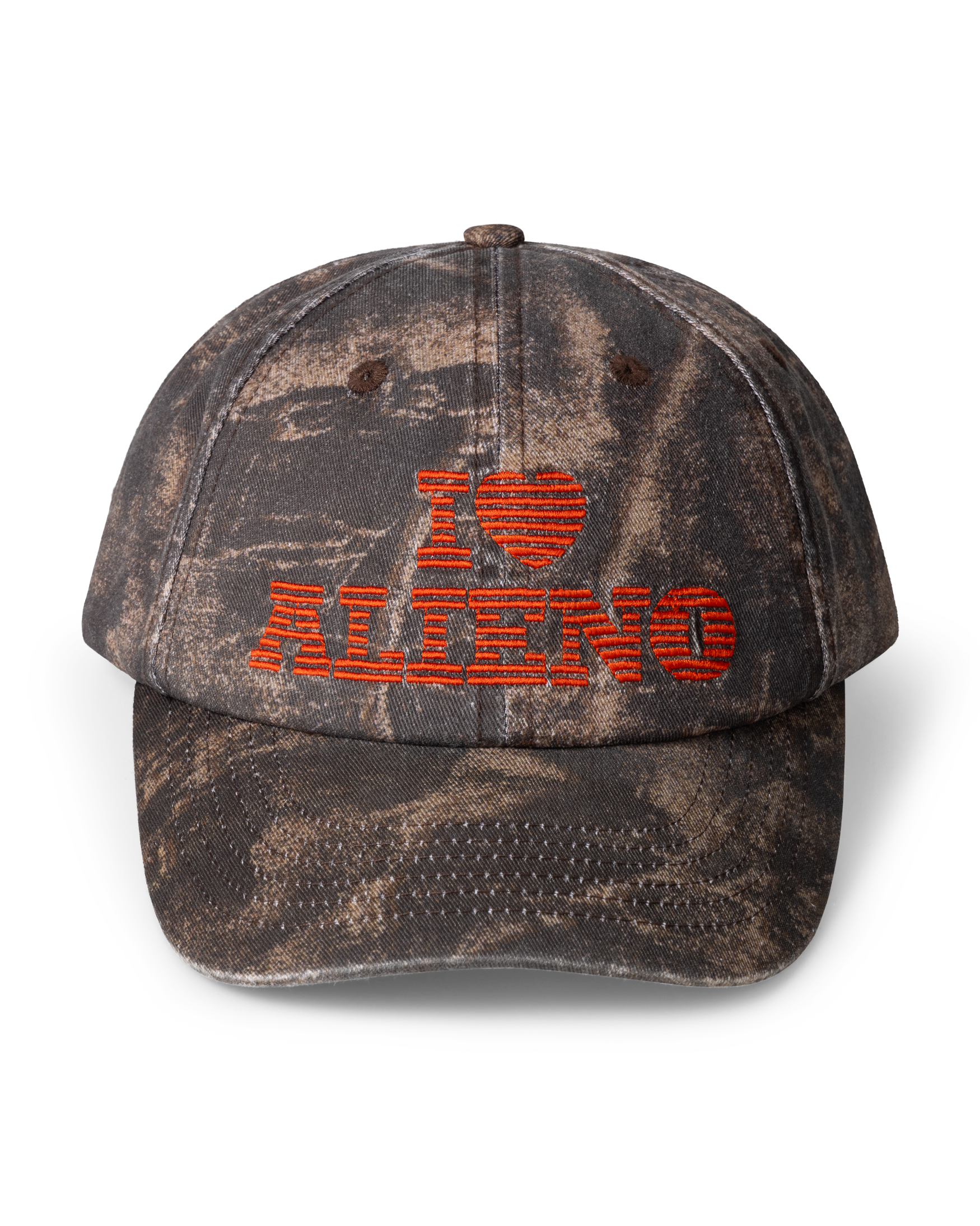 featuring an allover real tree print, i heart alieno front embroidery and a gothic alieno embroidery on the back.