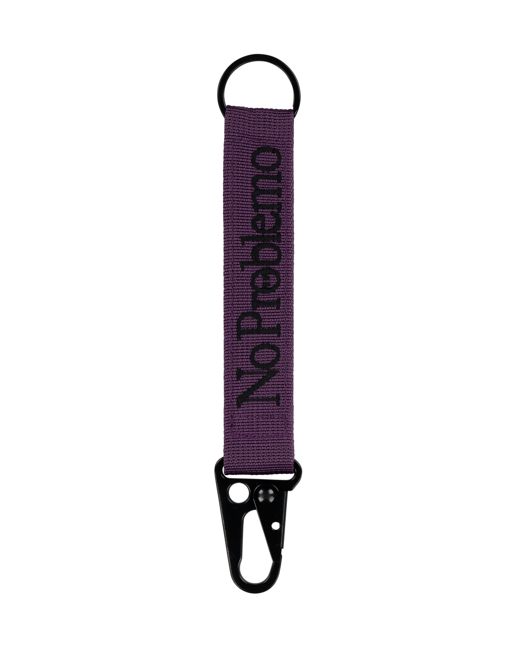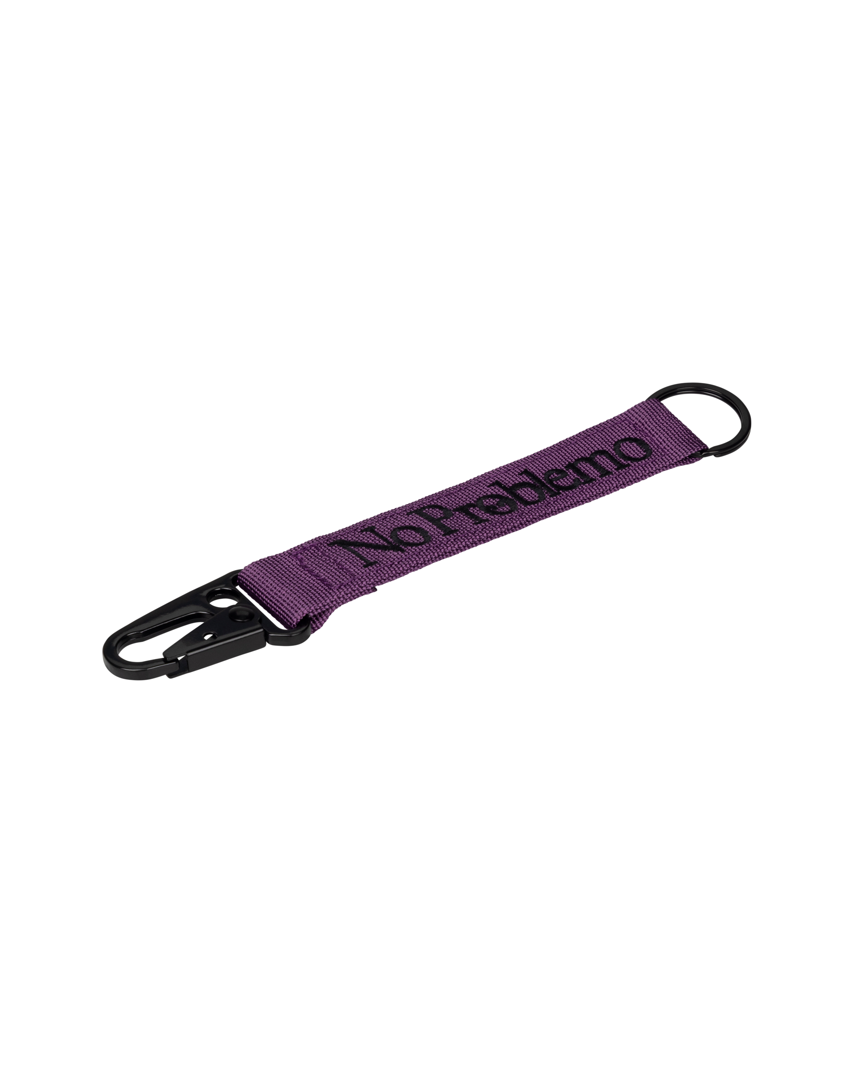 carabiner keychain with webbing strap featuring no problemo graphic.