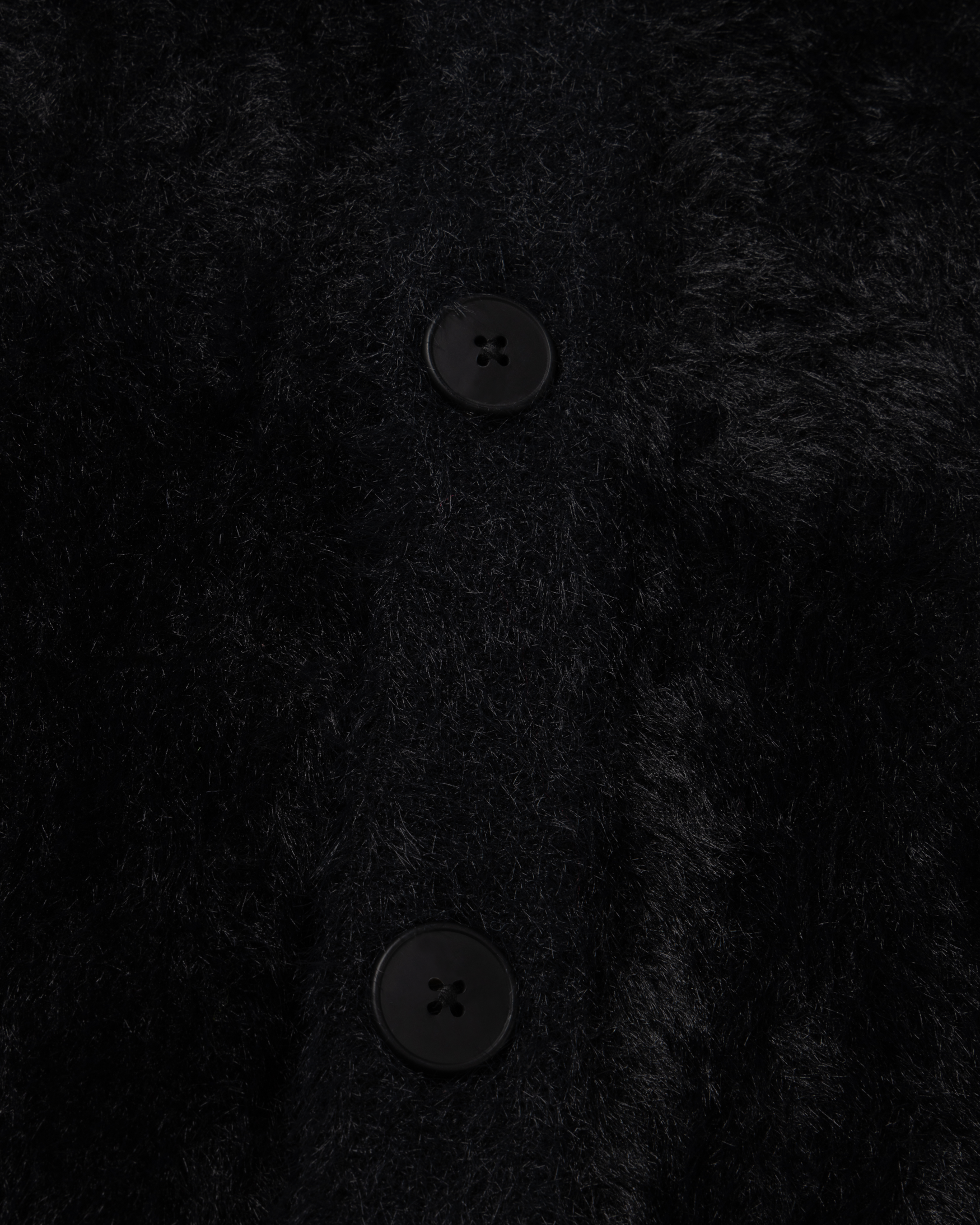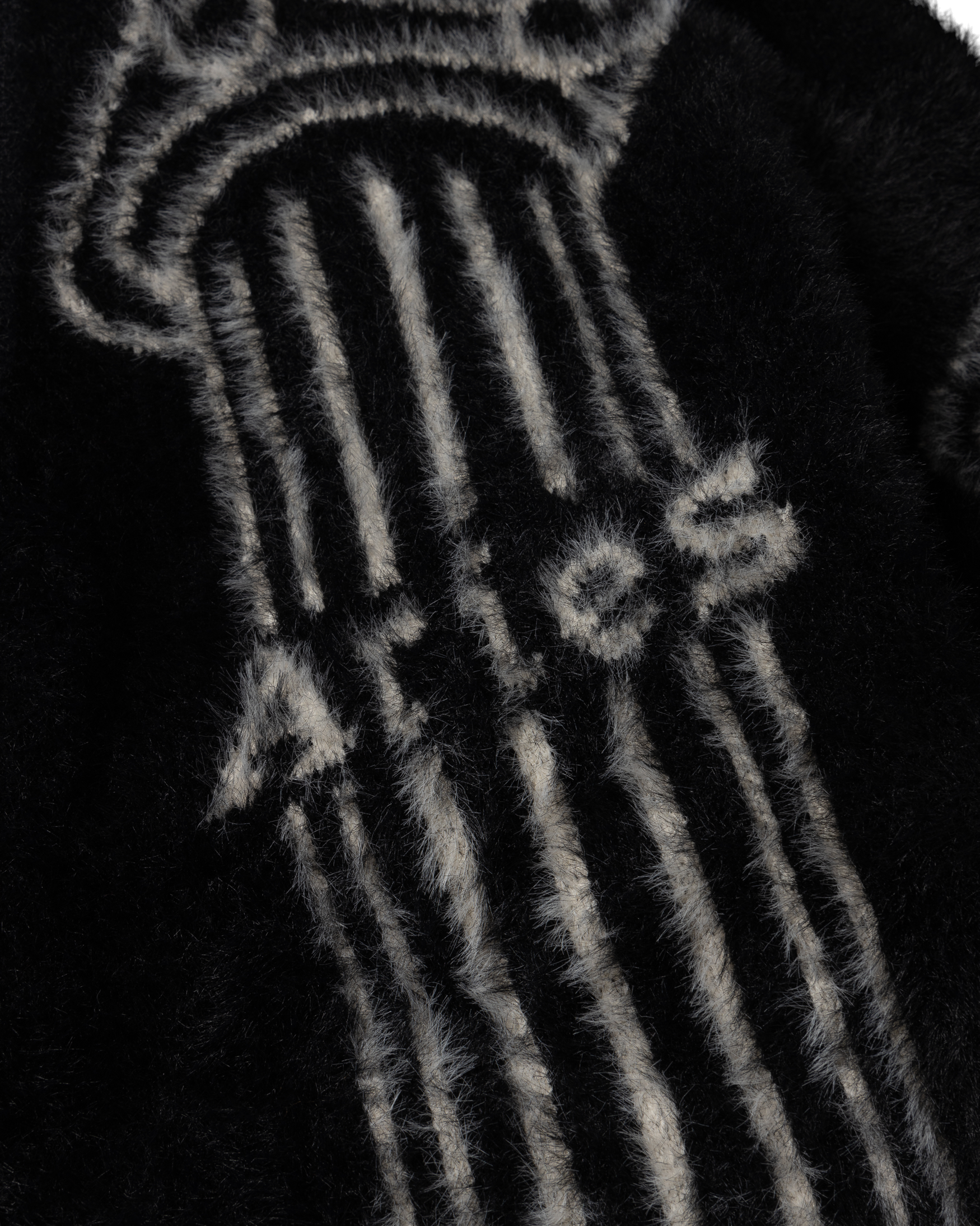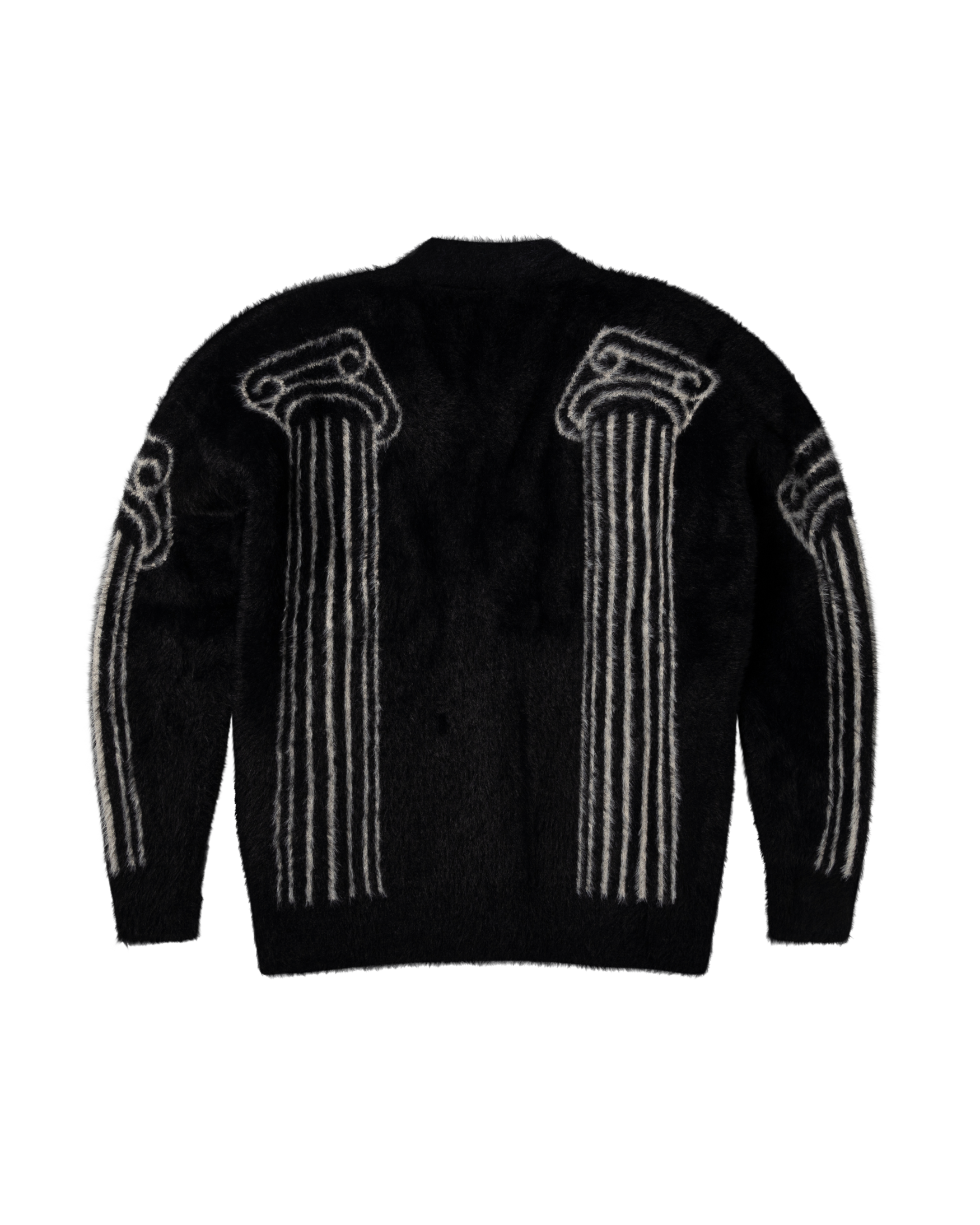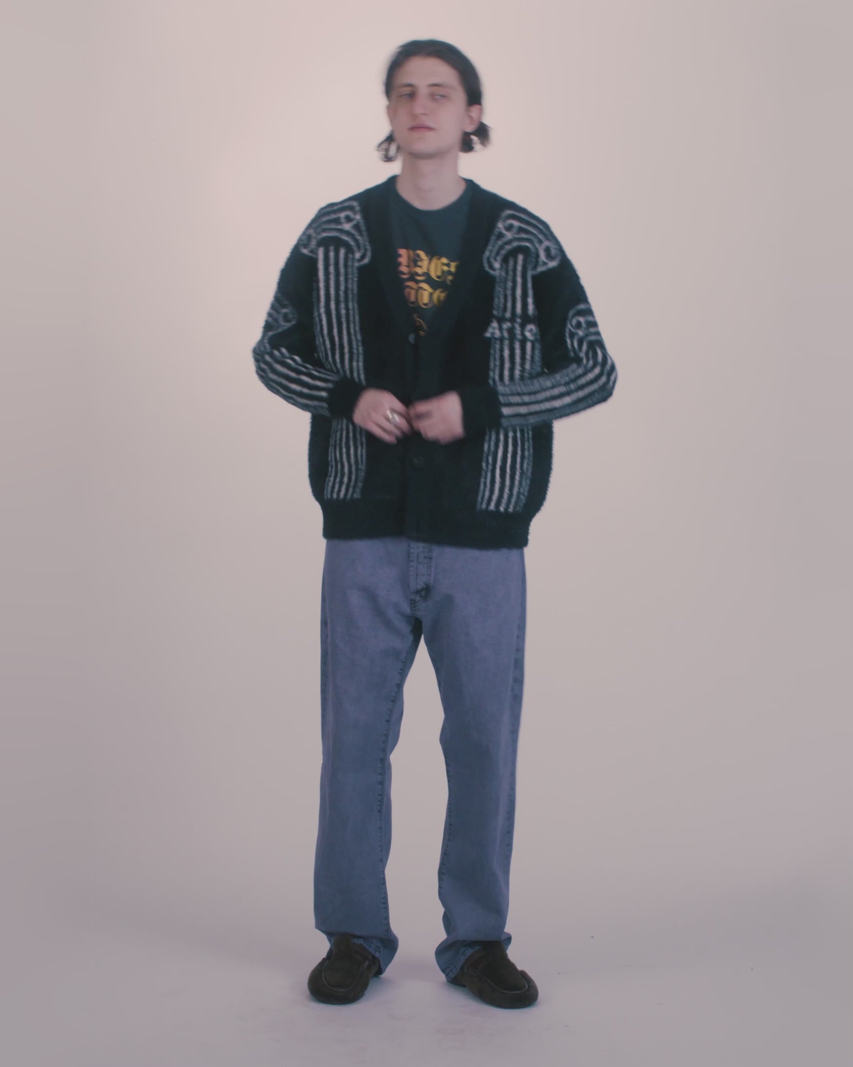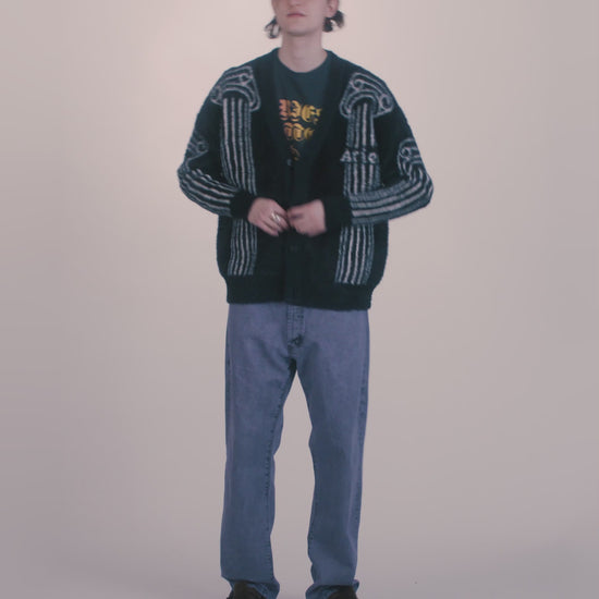 Unisex oversized 7 gauge knit cardigan, made with a fluffy chenille yarn as the main yarn. 2 colour column jacquard design on sleeves, front and back. 50% viscose 28% polyester 22% nylon.