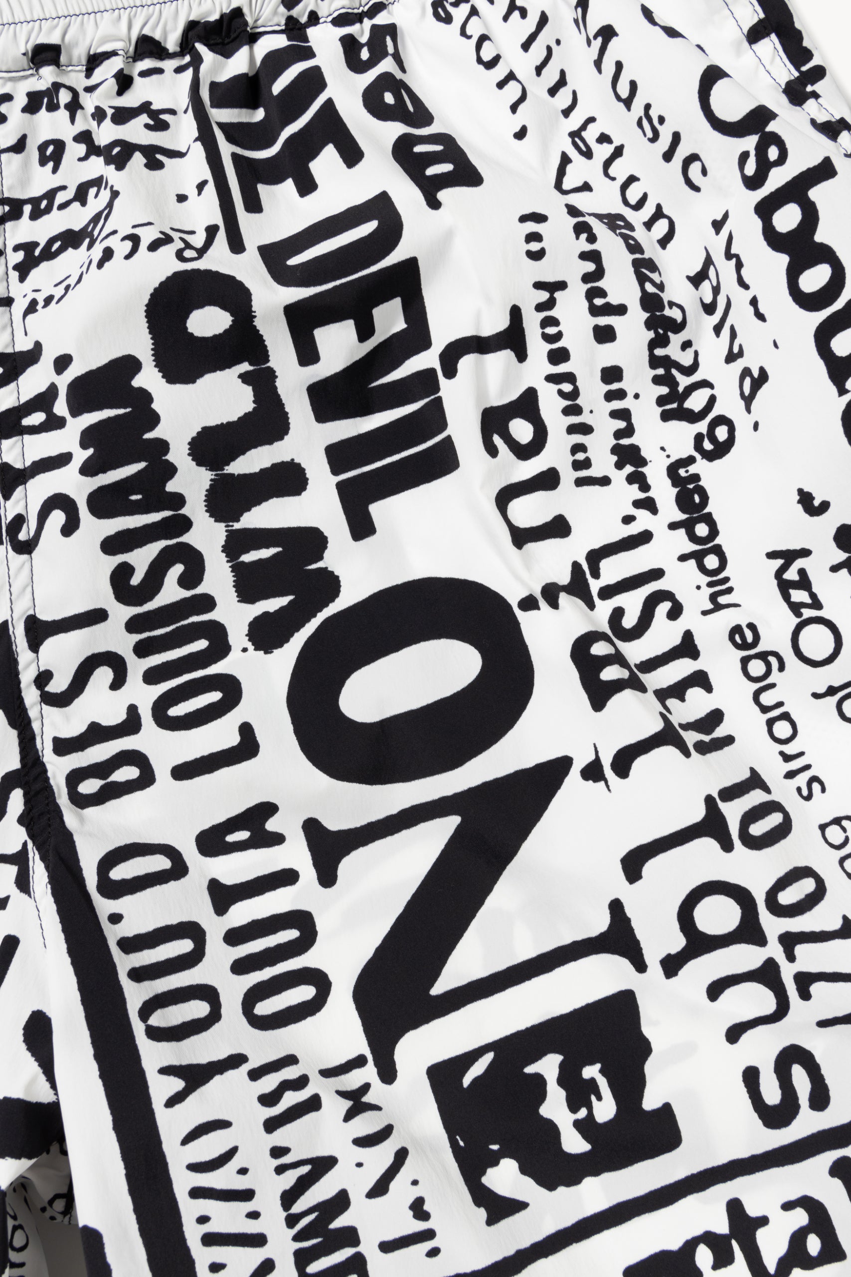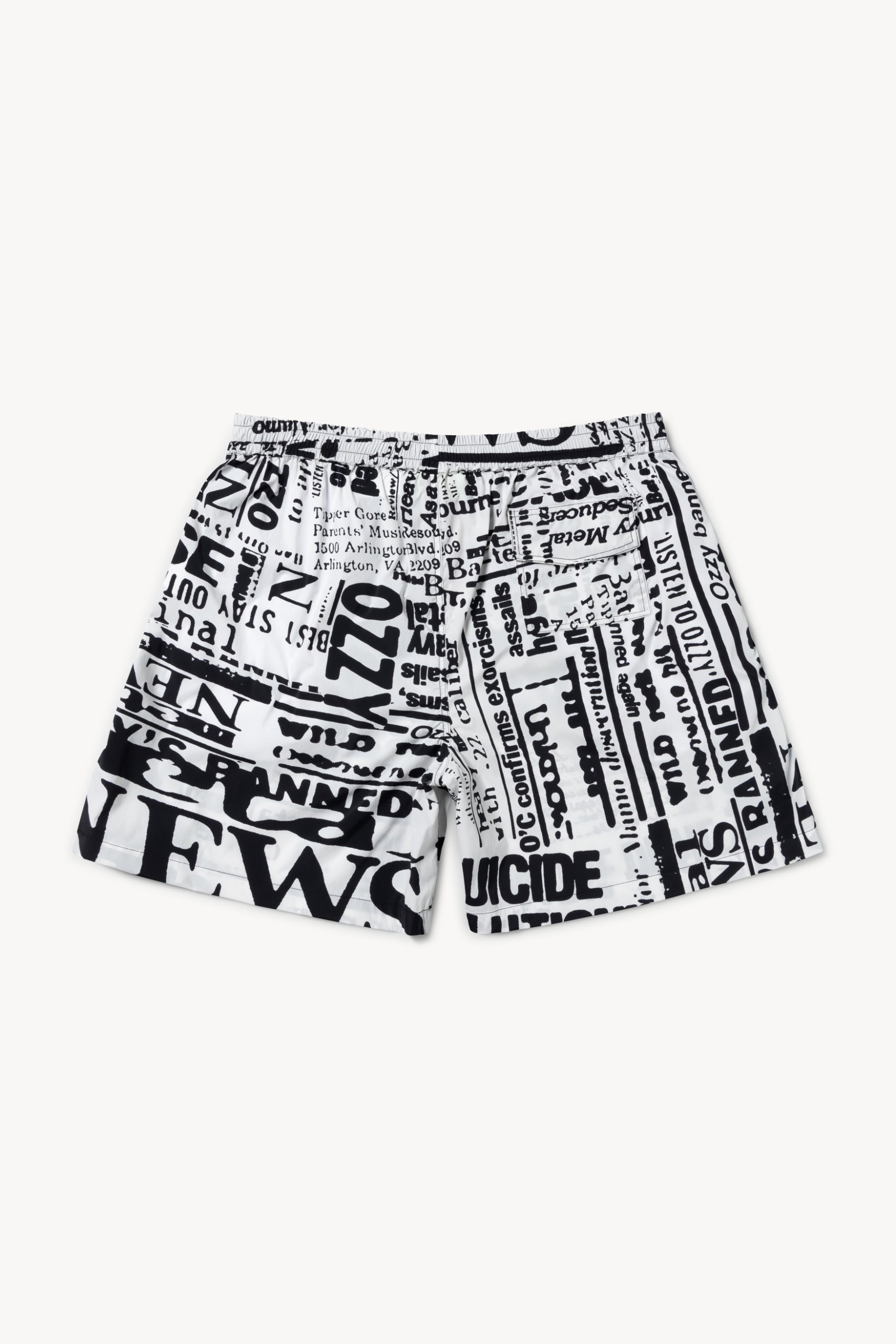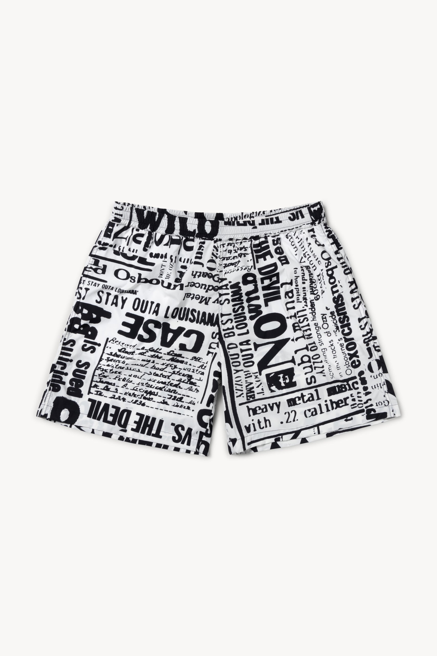 Unisex loose-fit board shorts, made in a nylon-blend fabric with an allover Aries archive Ozzy newspaper print. With an elasticated waistband, cotton drawstring and mesh lining. Made in Portugal.