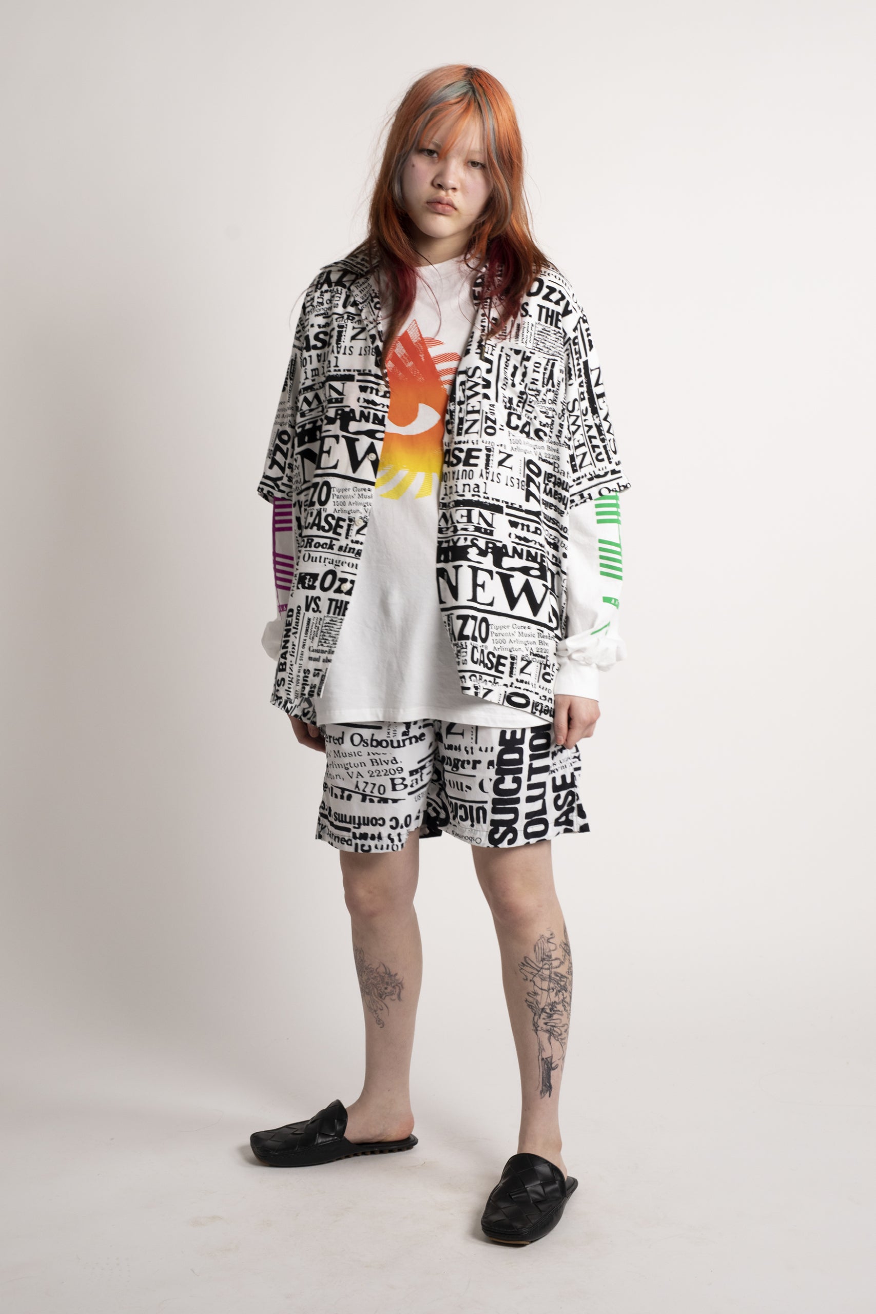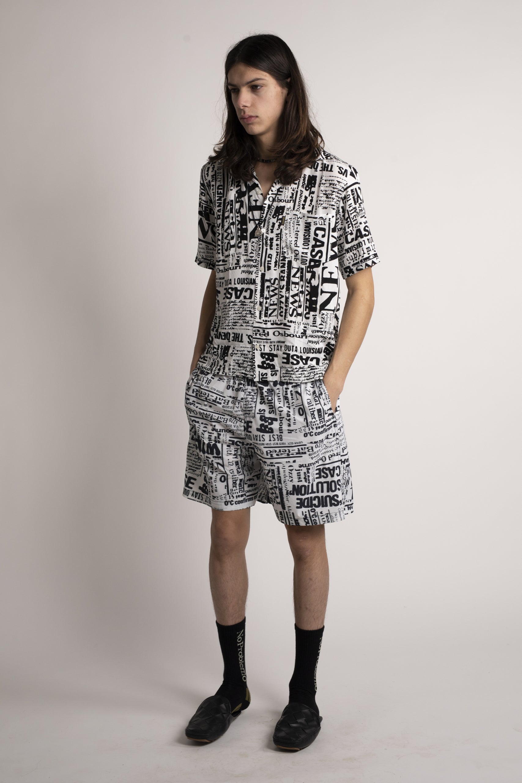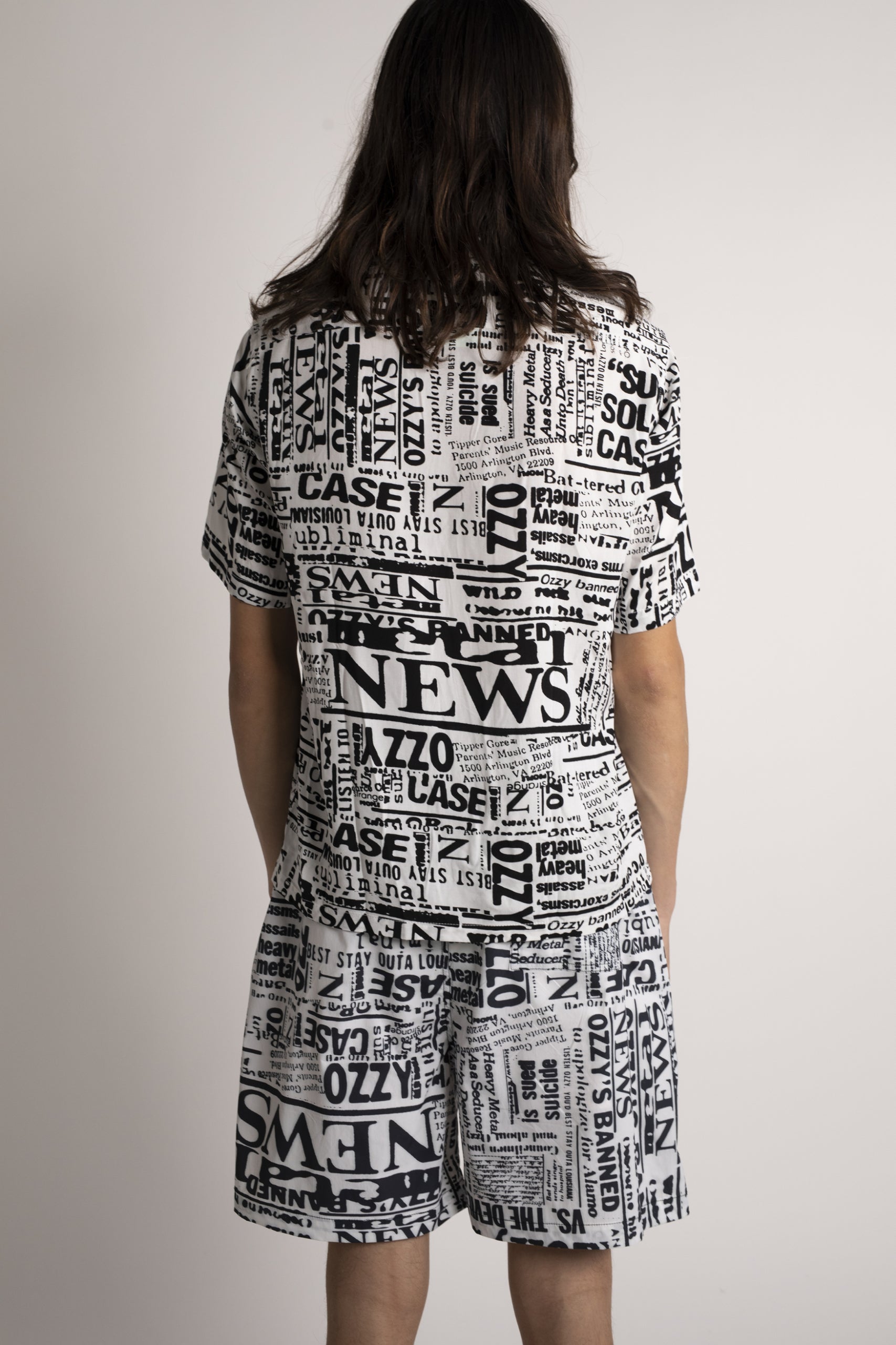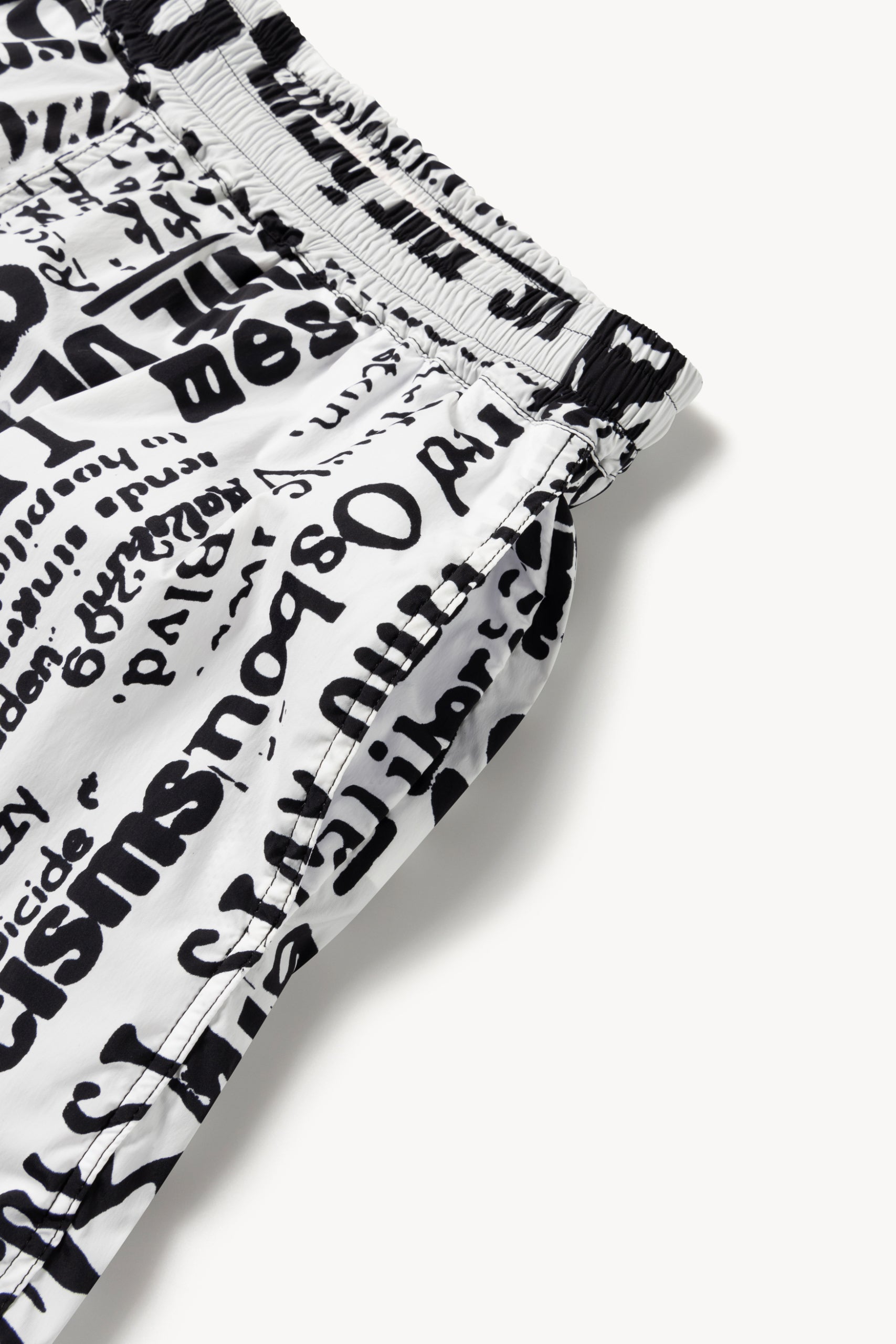 Unisex loose-fit board shorts, made in a nylon-blend fabric with an allover Aries archive Ozzy newspaper print. With an elasticated waistband, cotton drawstring and mesh lining. Made in Portugal.
