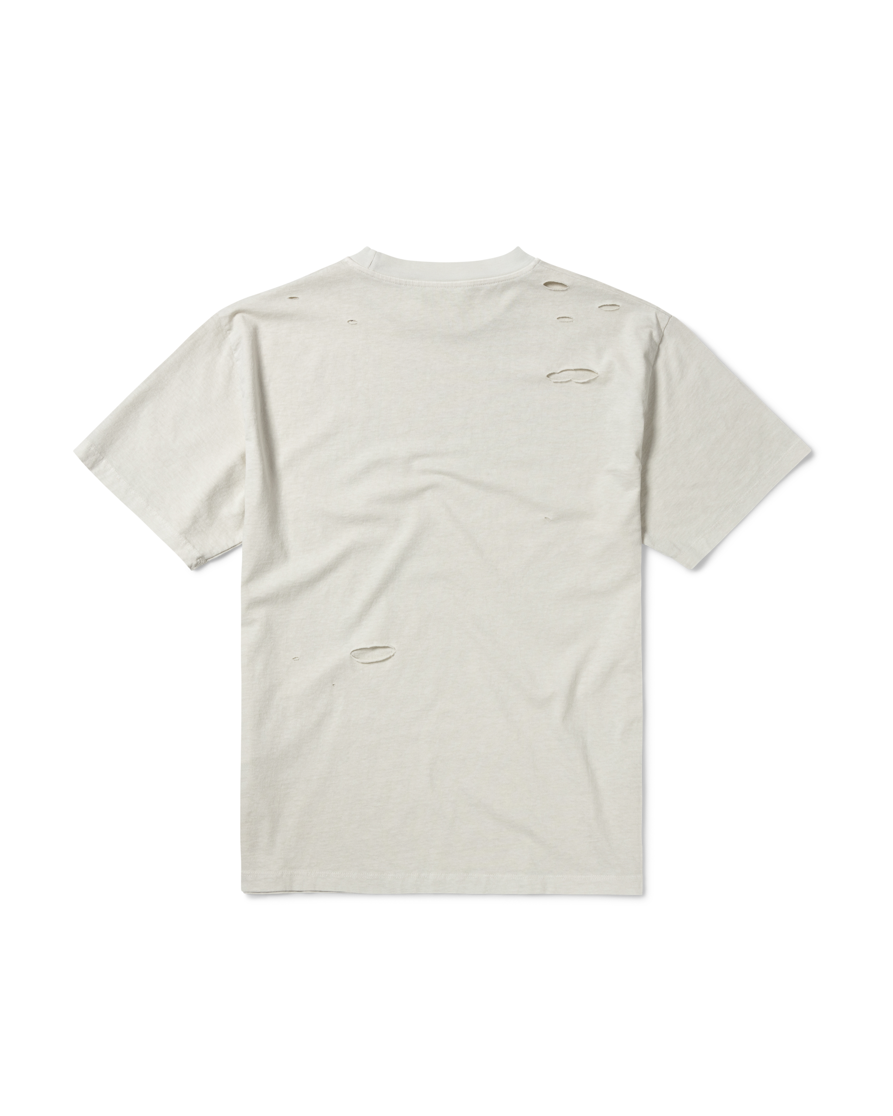 unisex short sleeve t-shirt made from 100% cotton, mid-weight open end jersey, featuring seasonal 'sorority' graphic, screen-printed on the front. finished with holes and a heavily washed treatment for an aged effect.