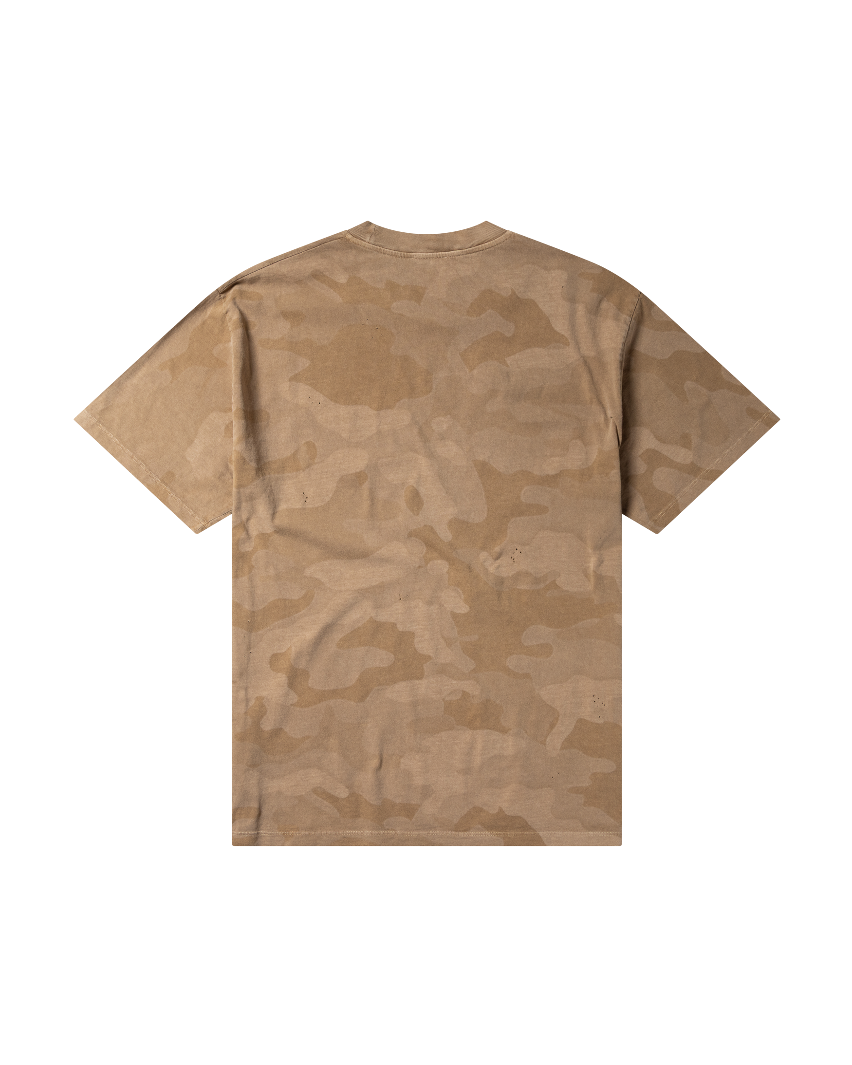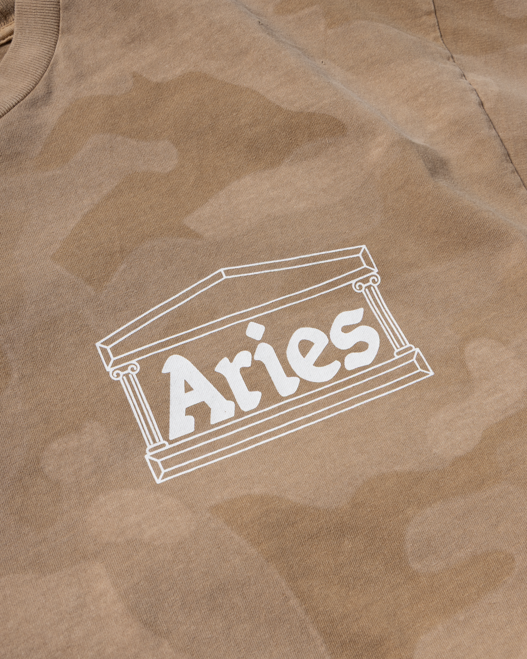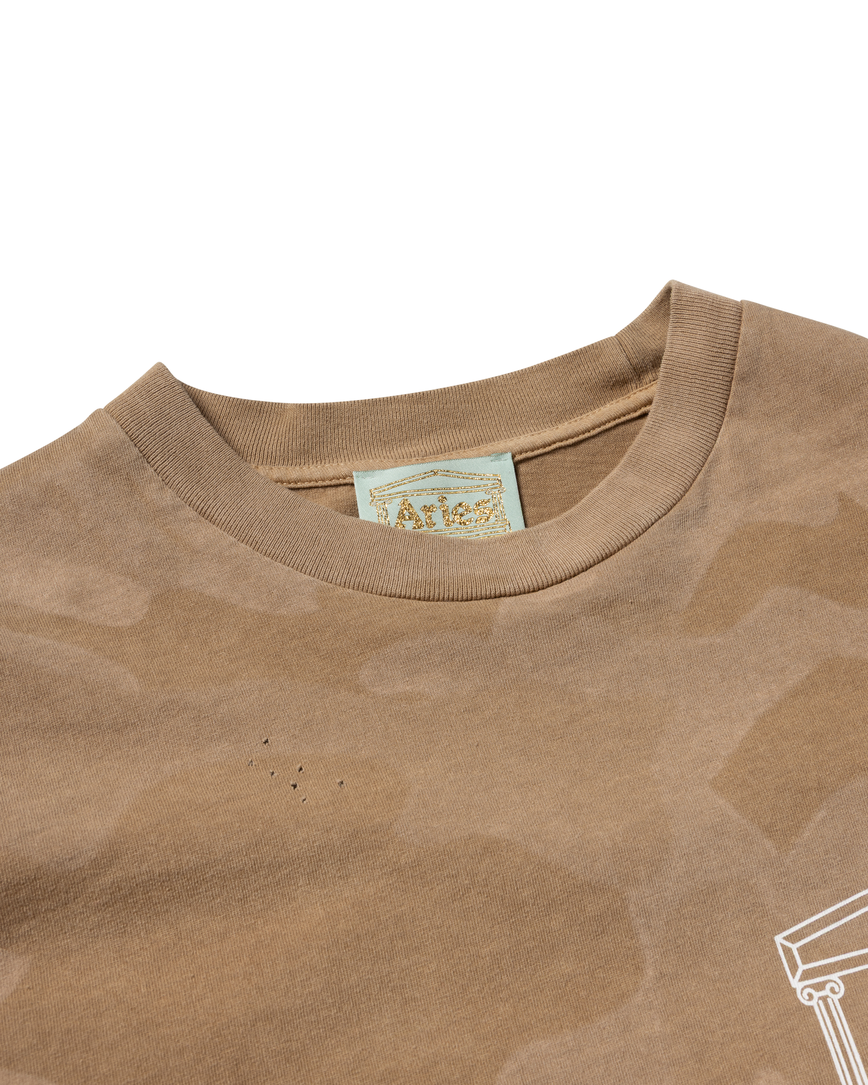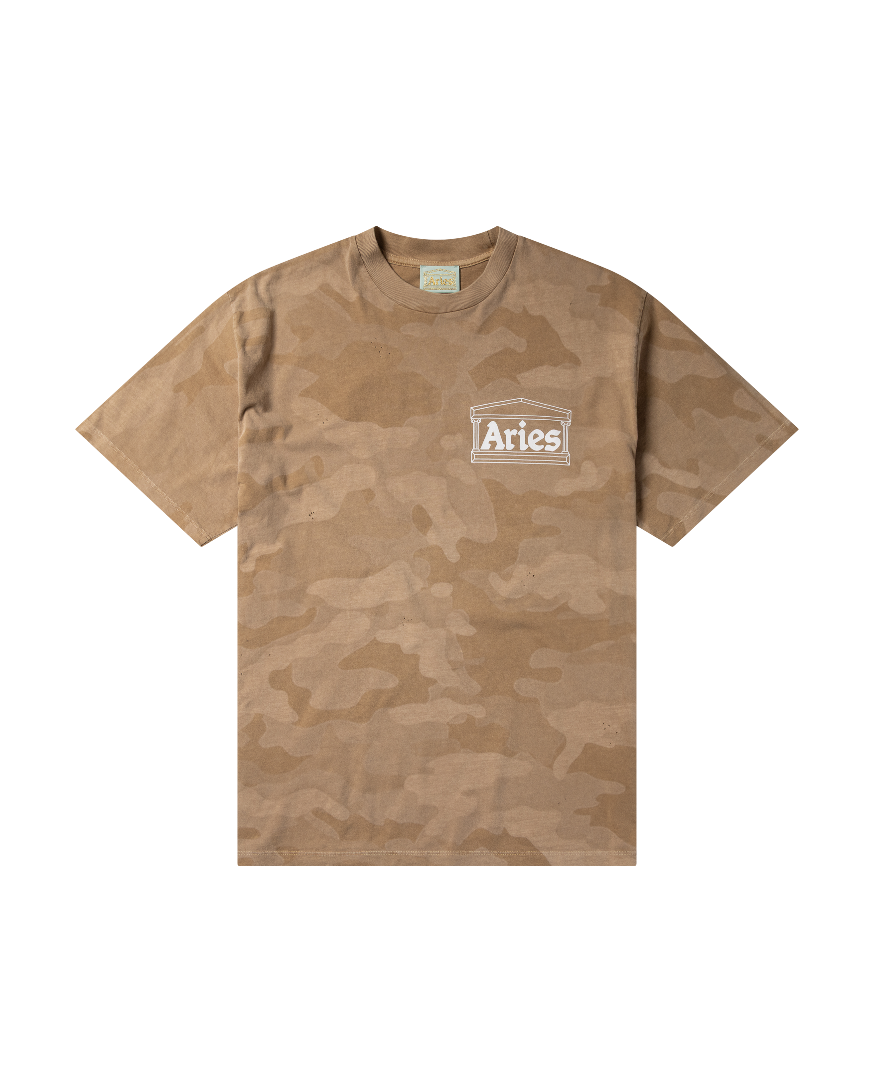 Unisex short sleeve t-shirt made from 100% cotton mid-weight open end jersey. With a camo laser treatment and Aries Classic Temple on the chest, destroyed with a heavy wash treatment for an aged look.