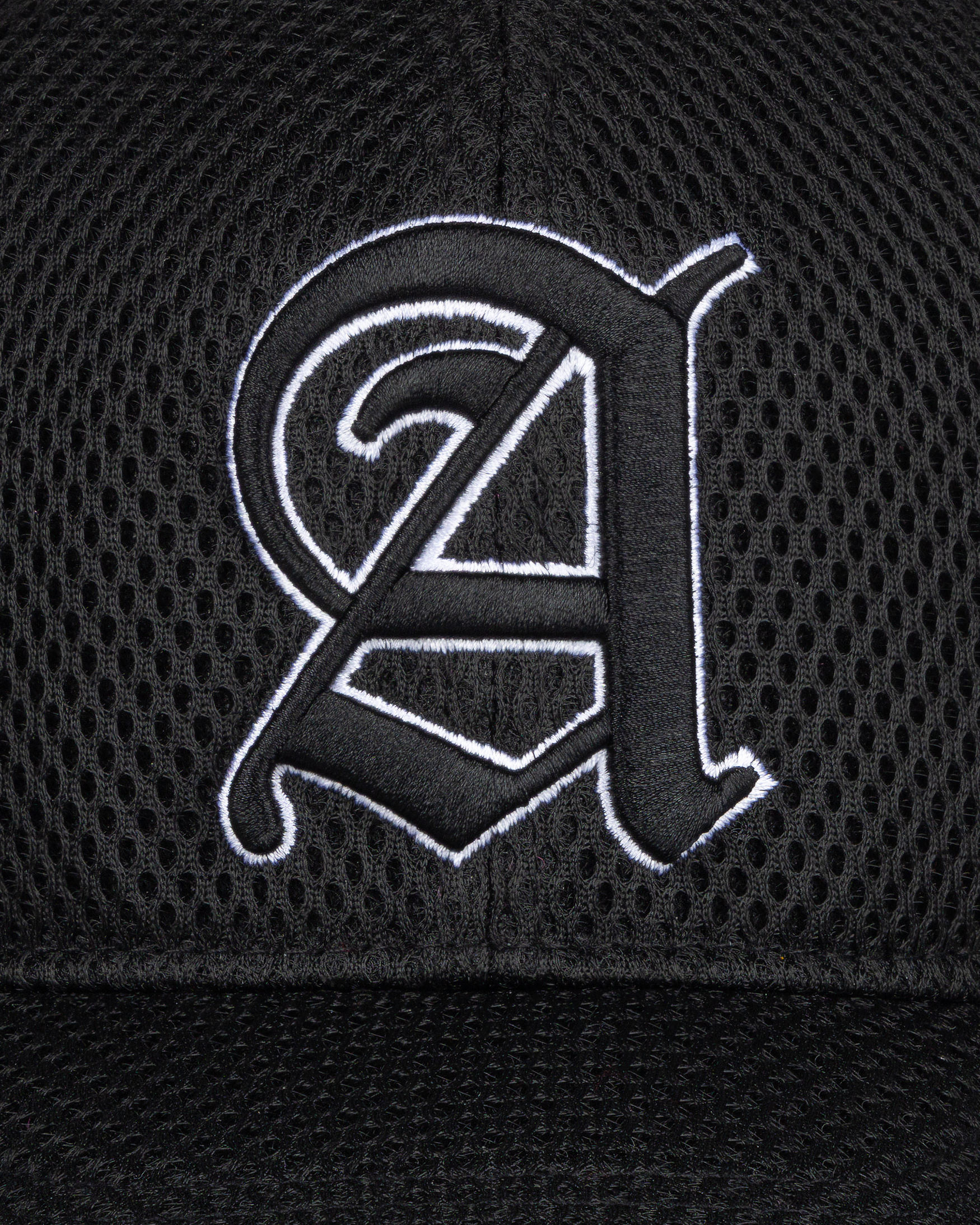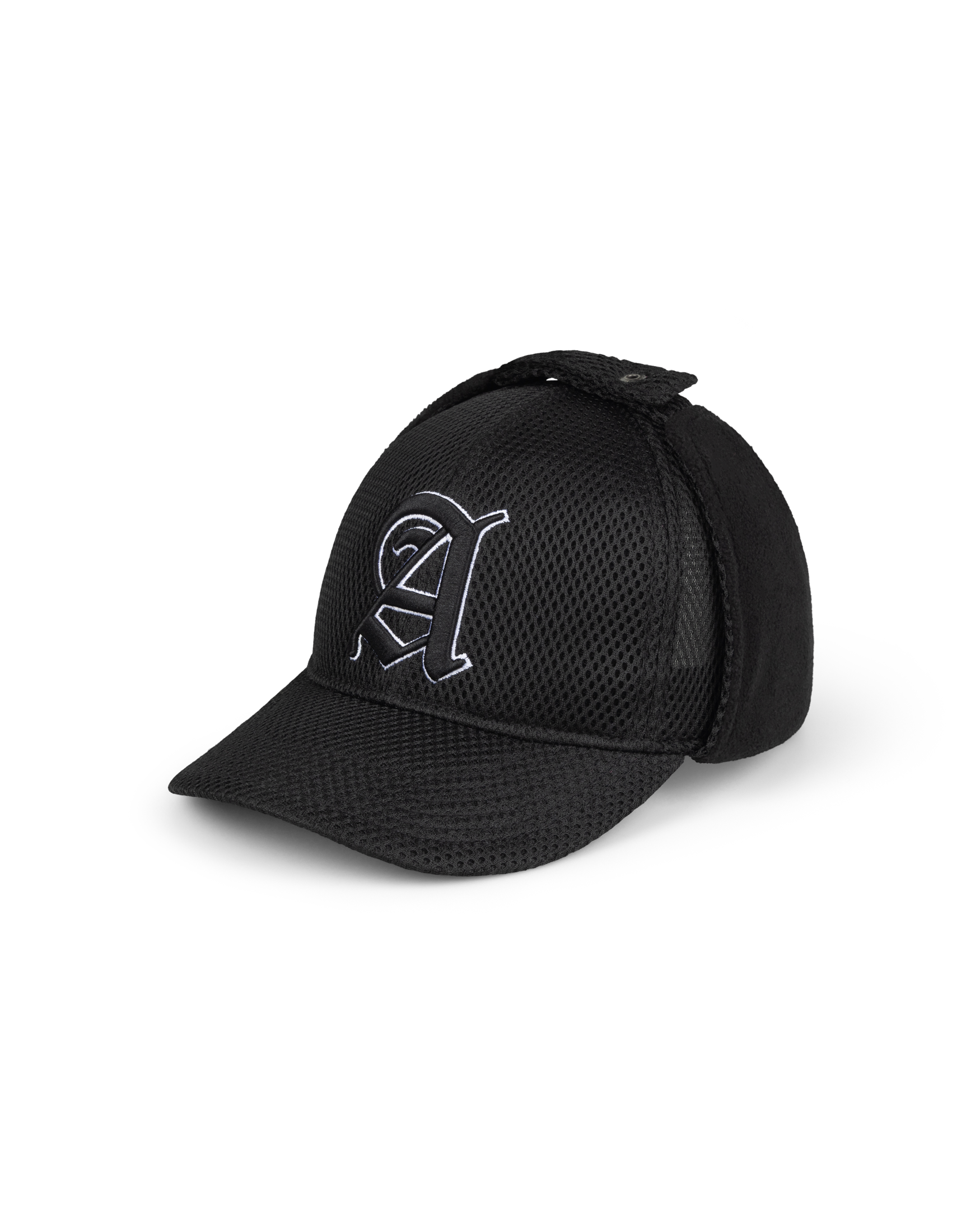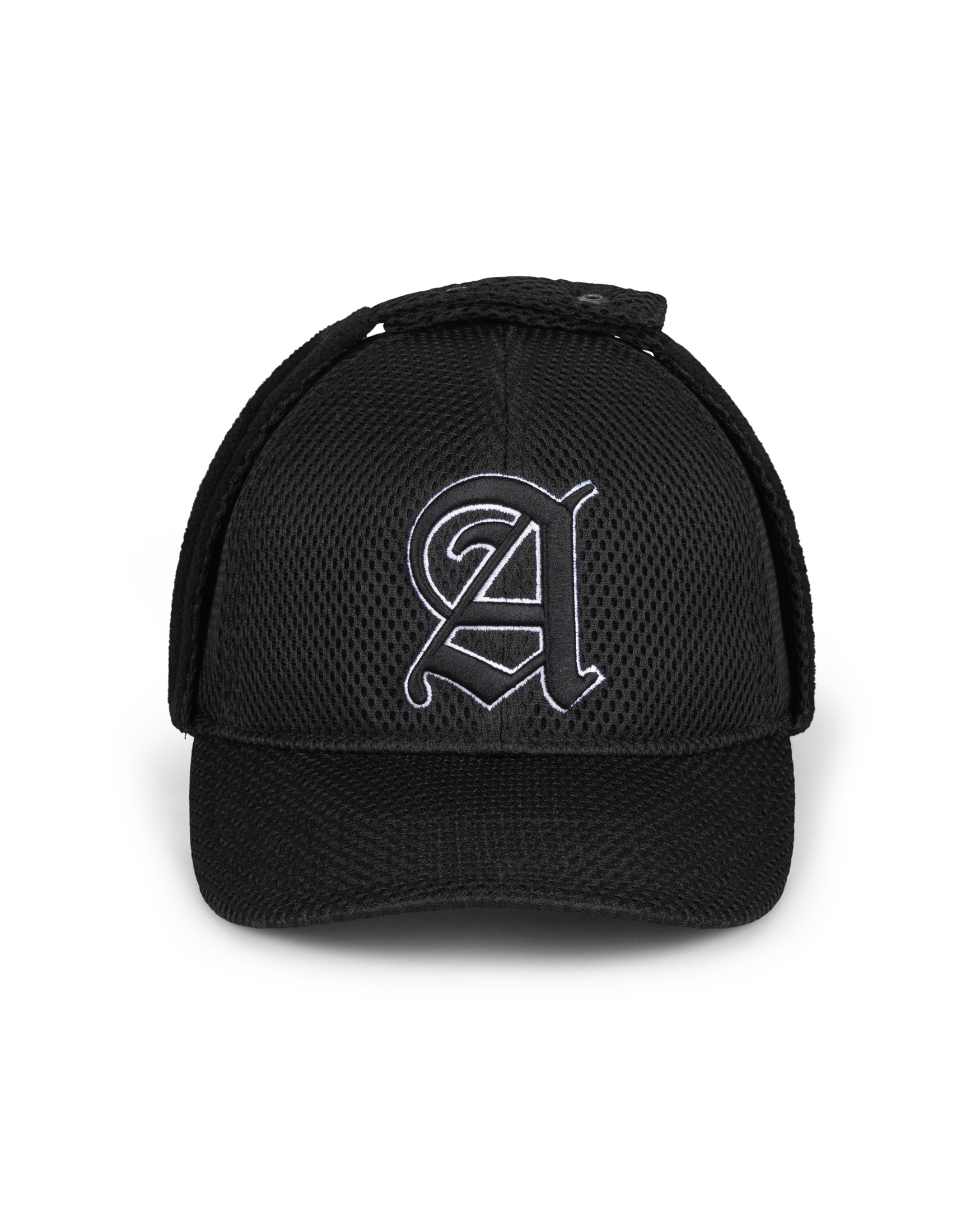 Airtex Trapper hat with high build Gothic A embroidery on front, and Aries embroidery on back. With an adjustable cord at the back.