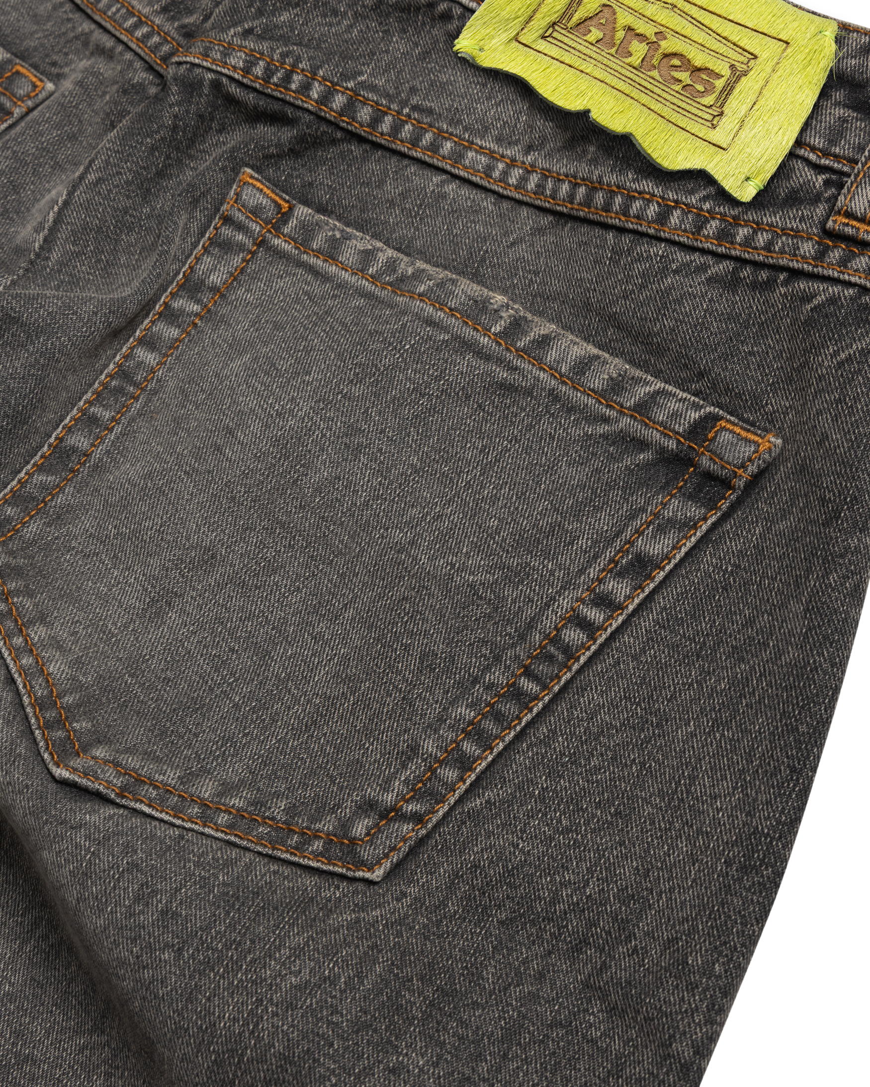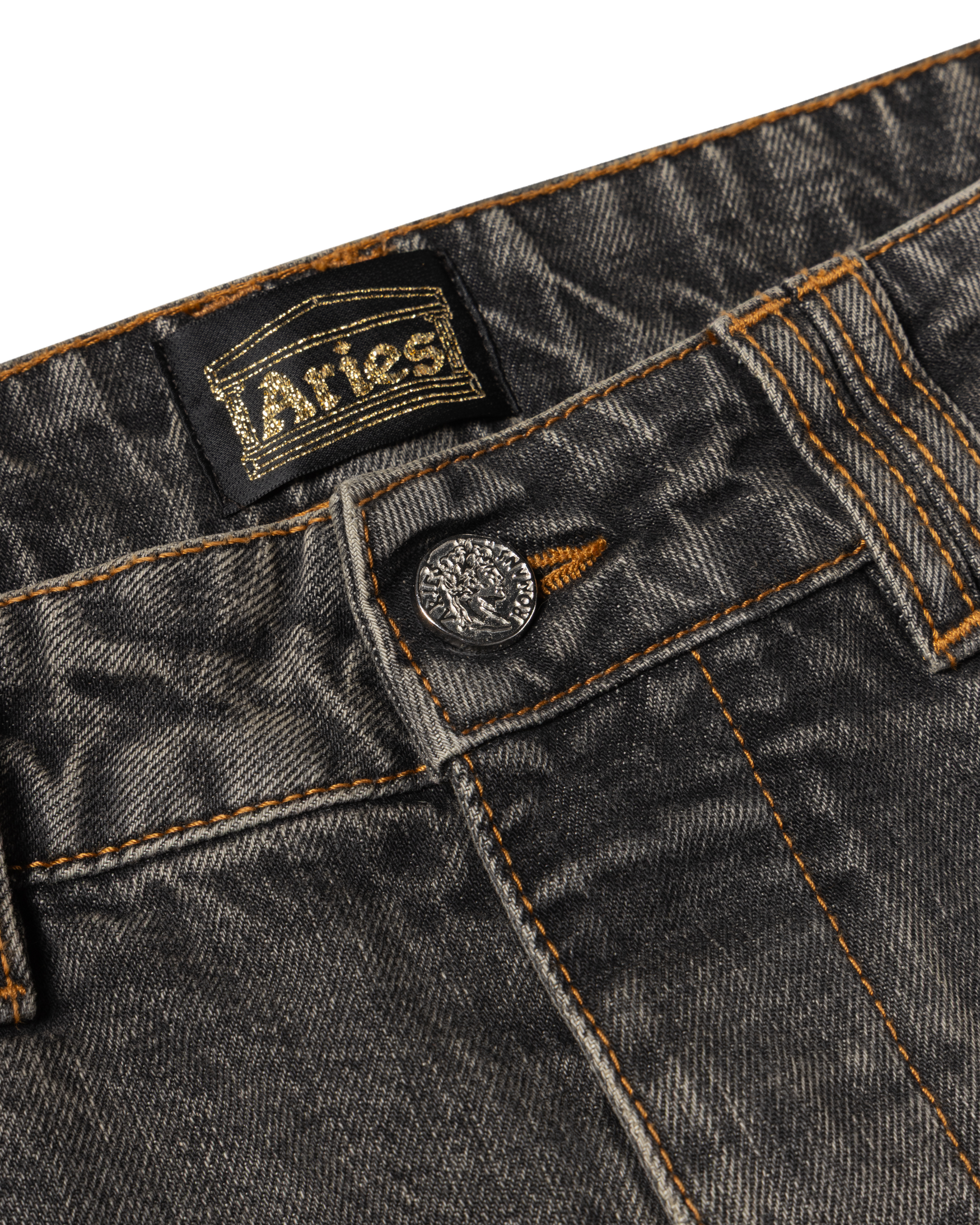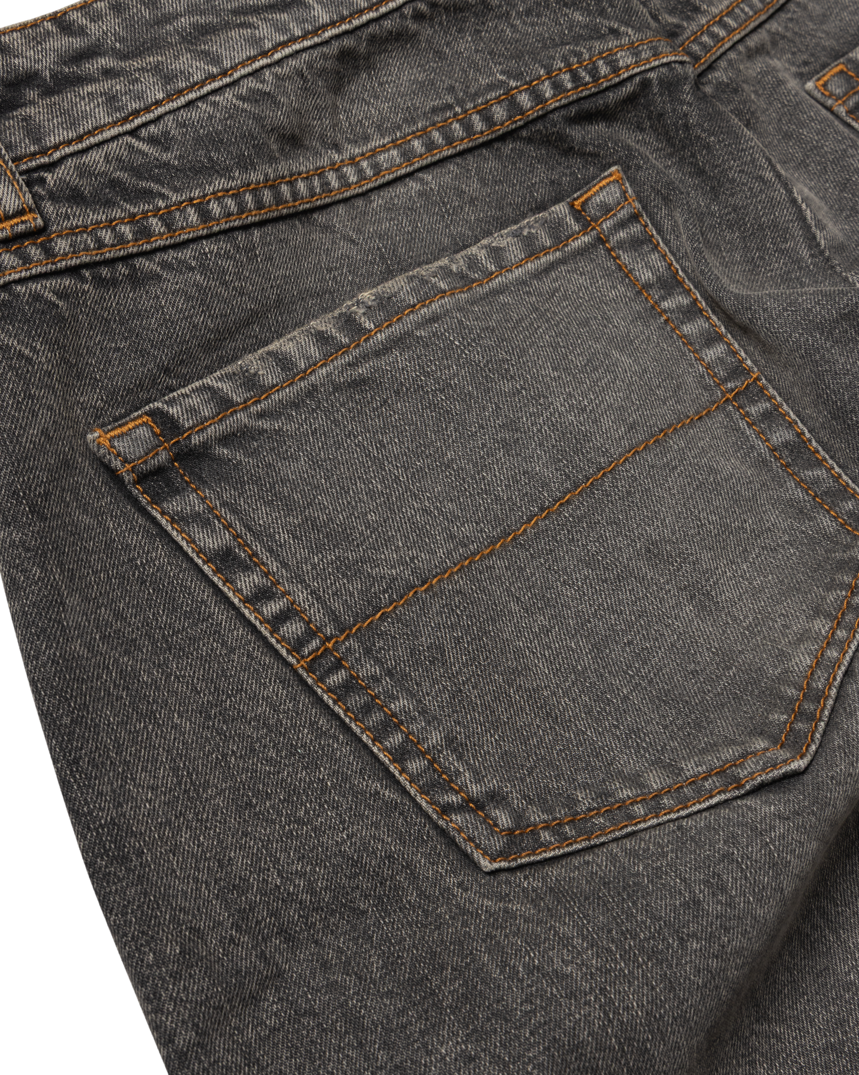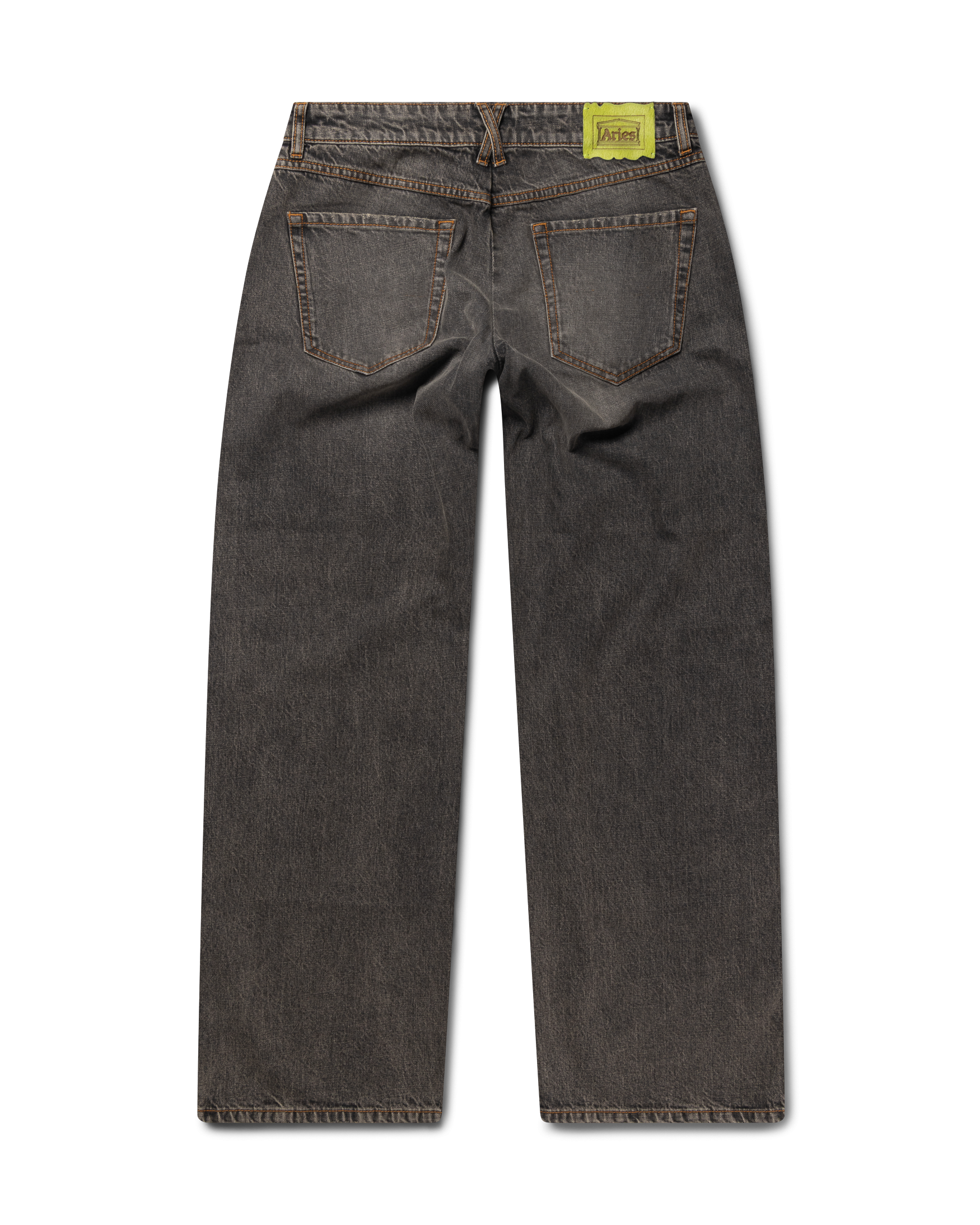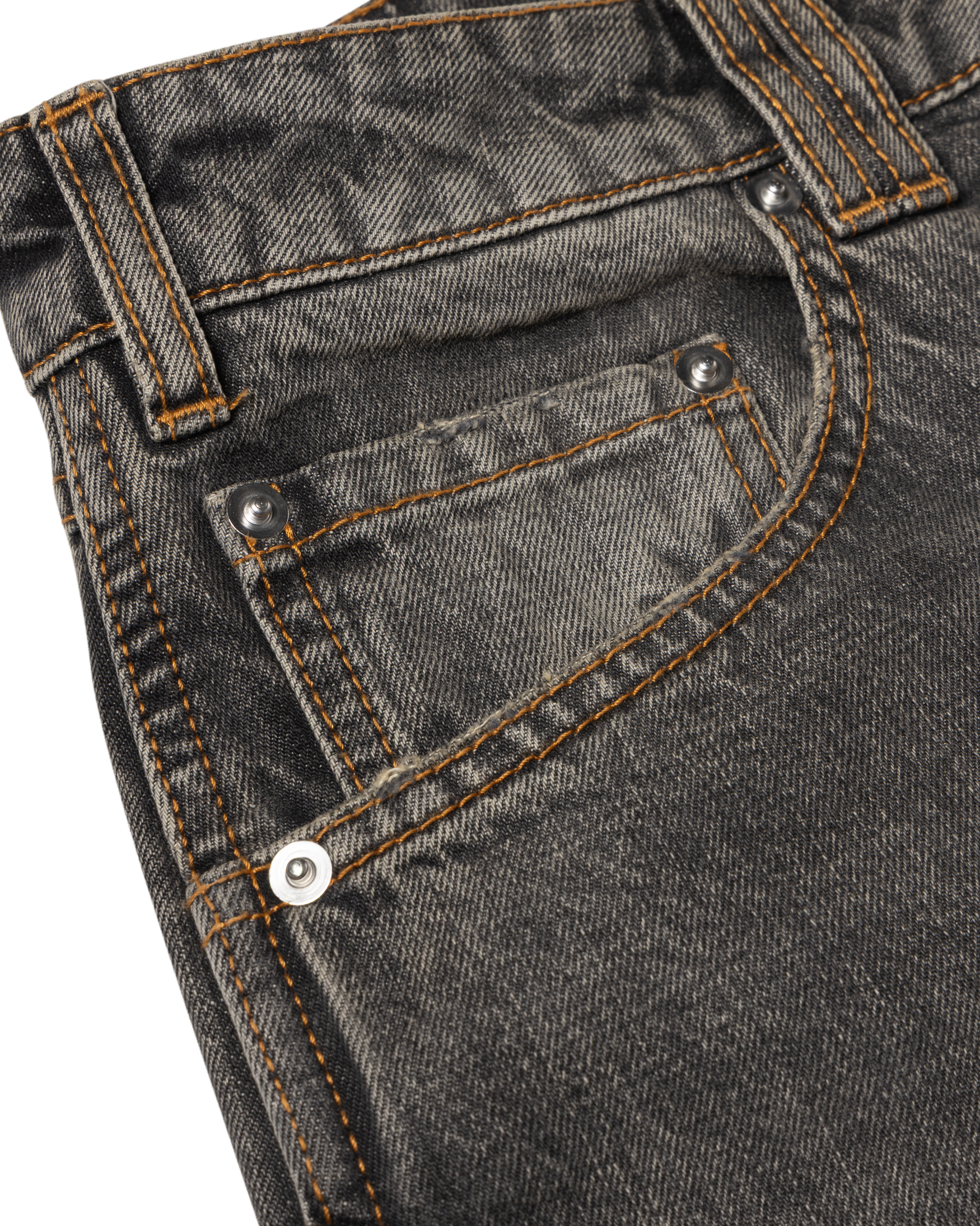 Unisex five pocket wide leg jean made from 100% cotton denim with vintage distressed wash, a dirty tint overdye and a leather temple patch.