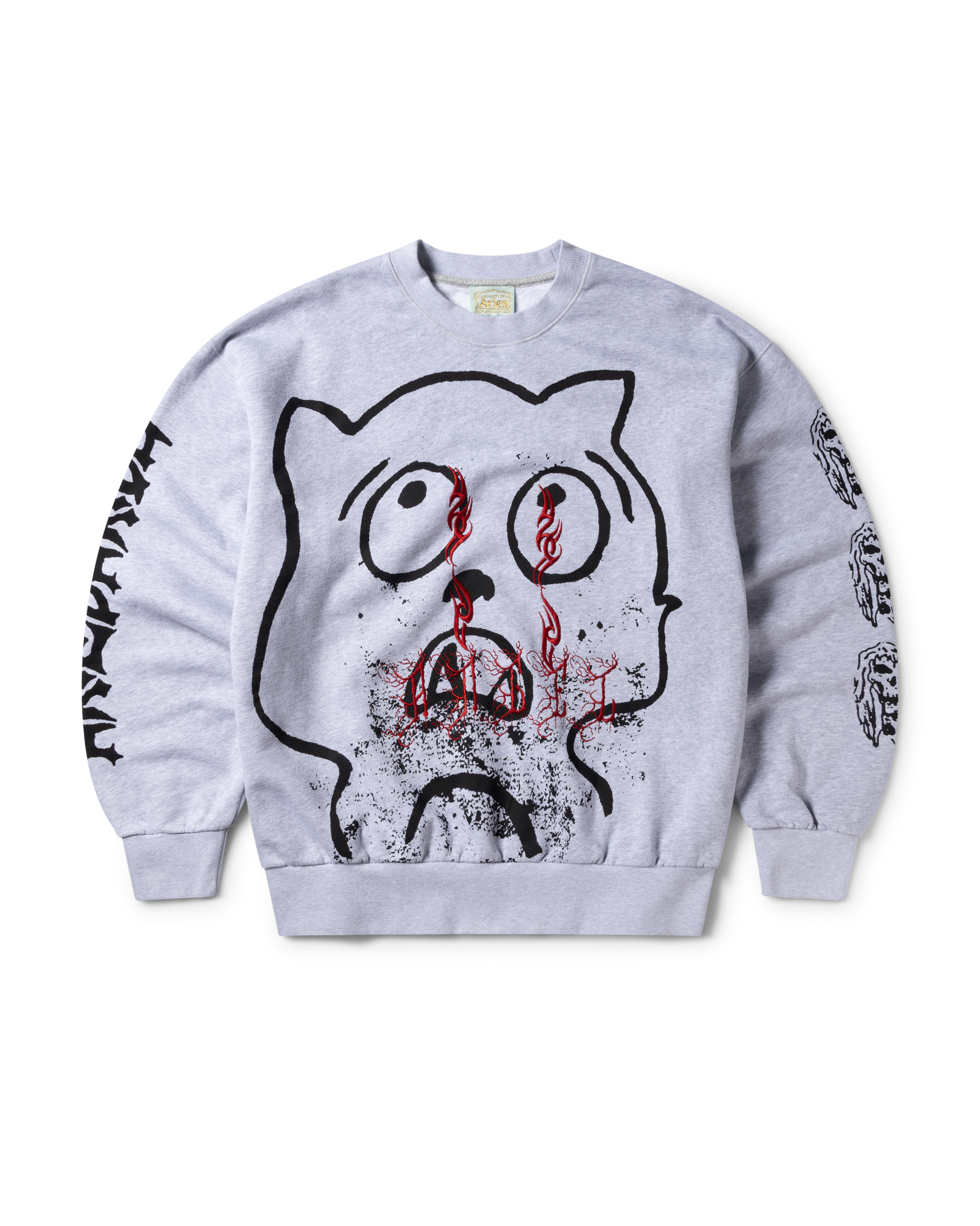 Unisex sweatshirt made from brushed-back 100% cotton jersey fleece. With Meowharishi Cat Face screen print on the front with embroidery on top and Zombie & Aries Zine graphics screen-printed on the sleeves.