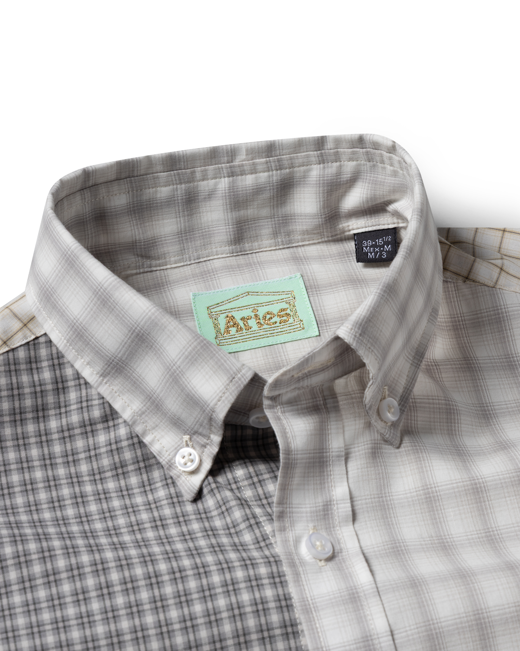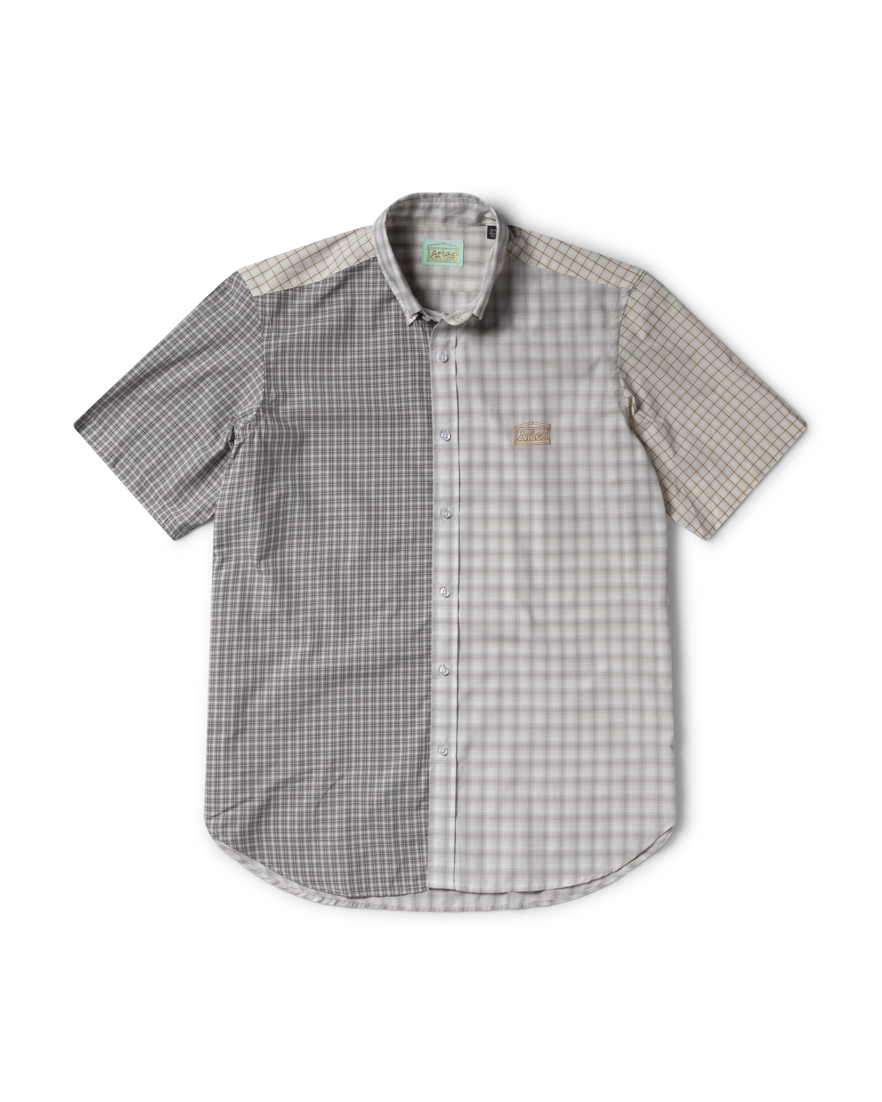 Short-sleeved shirt with button down collar in a patch-worked check design with embroidered Aries Temple logo on wearer's left chest. Beige colourway is overdyed.