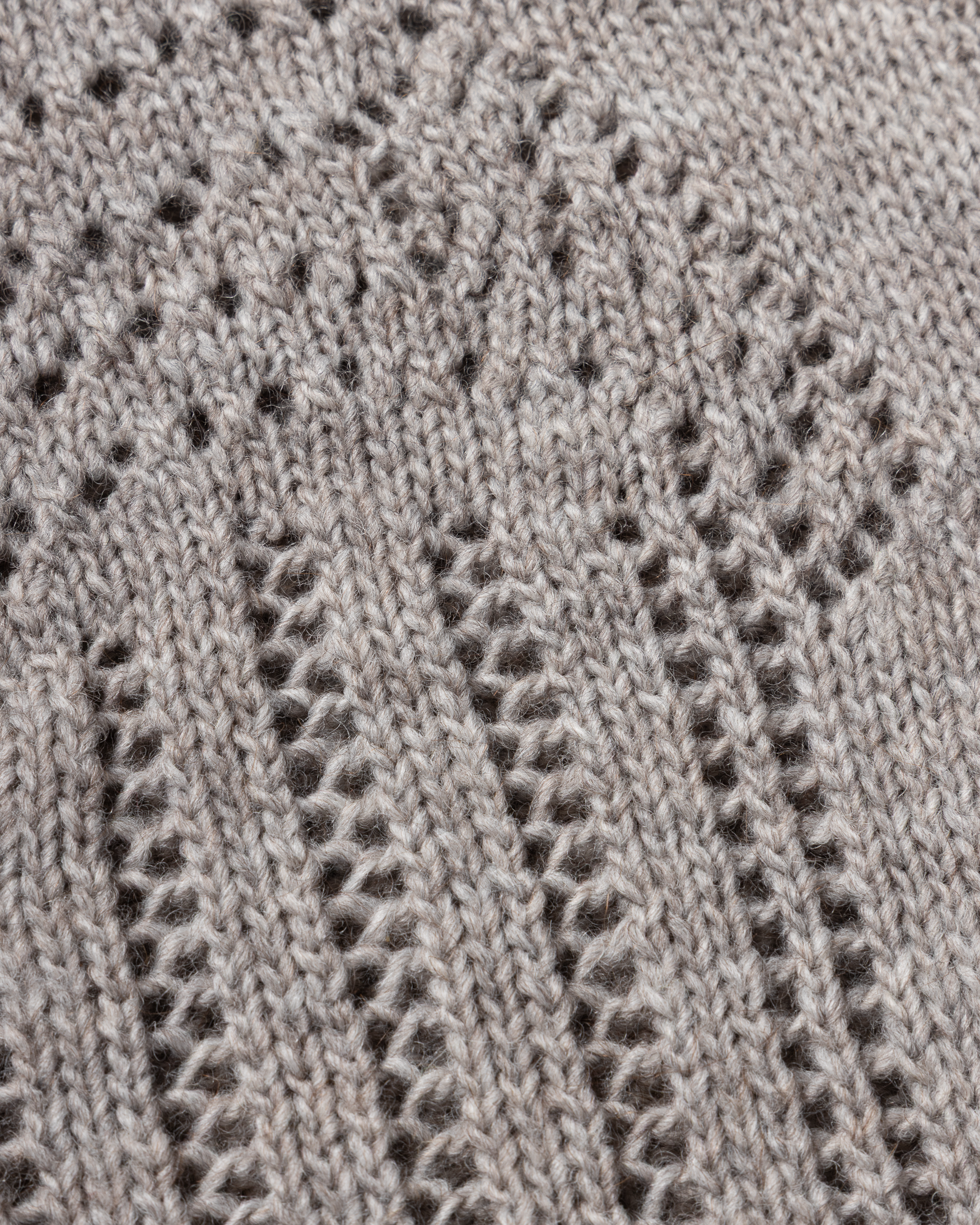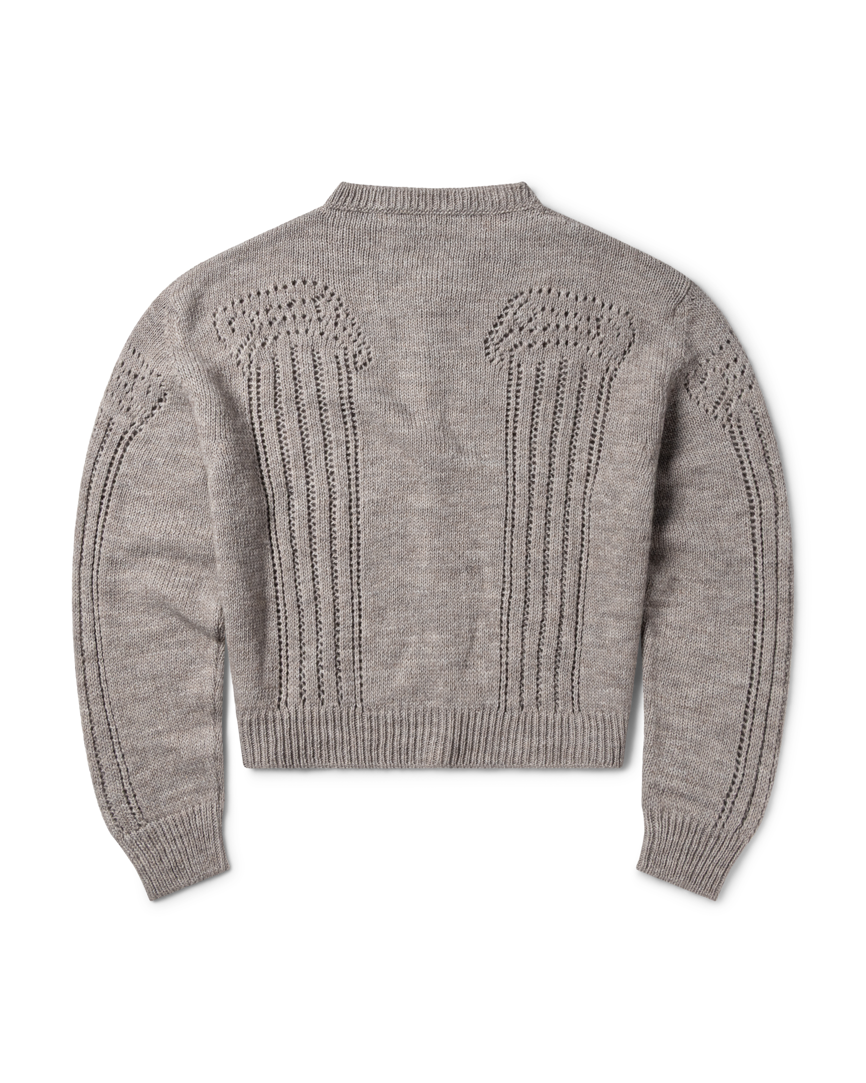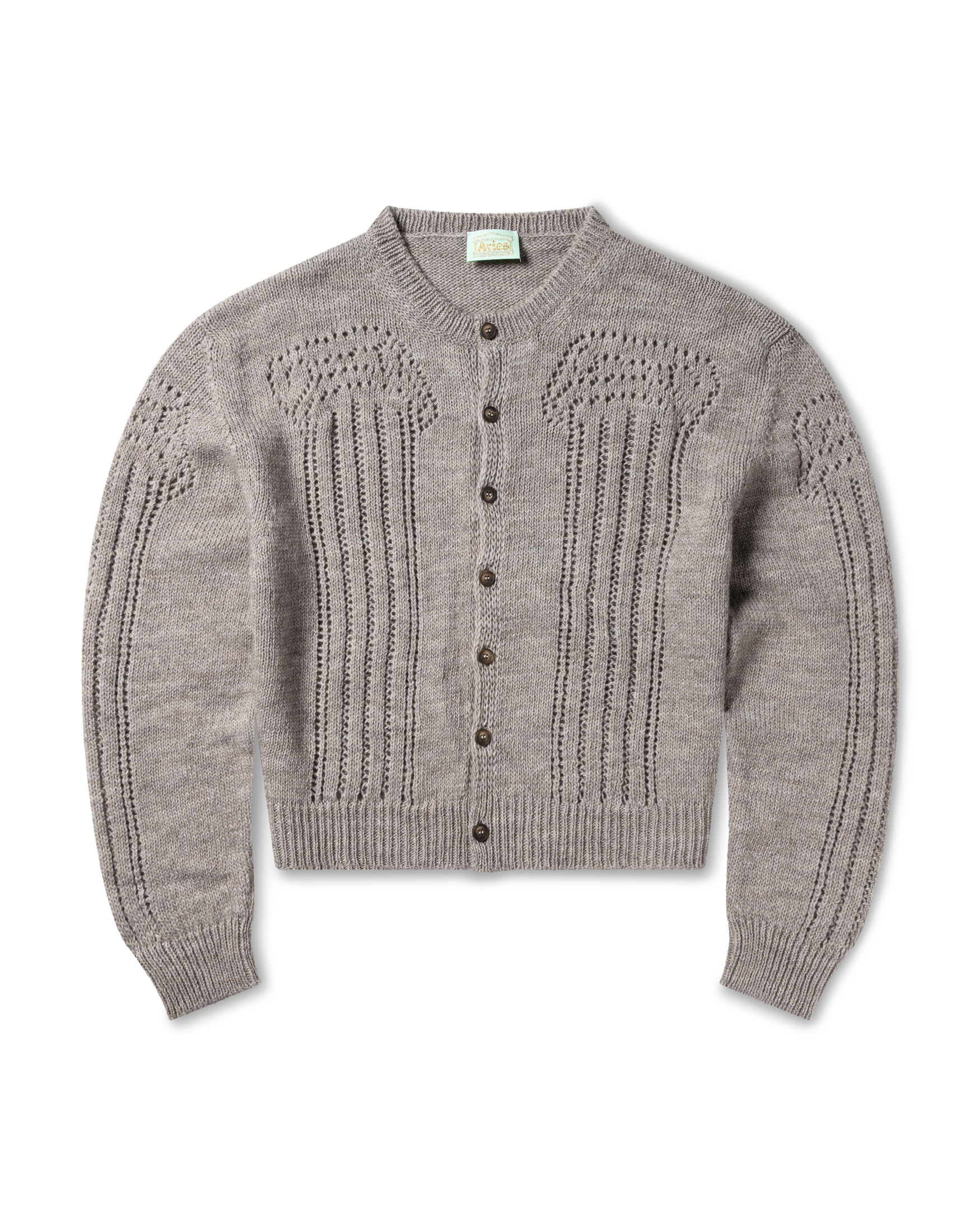 Unisex knitted cardigan in a pointelle stitch with classic Column graphics also in pointelle stitches.
