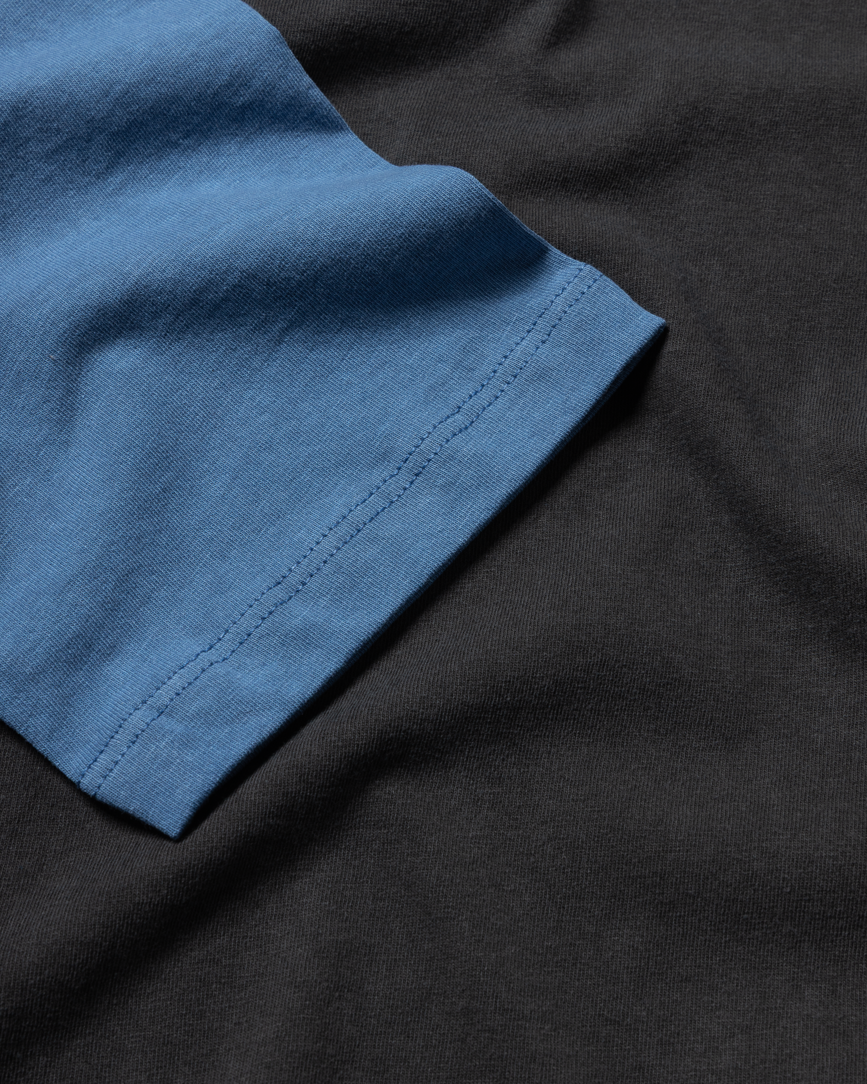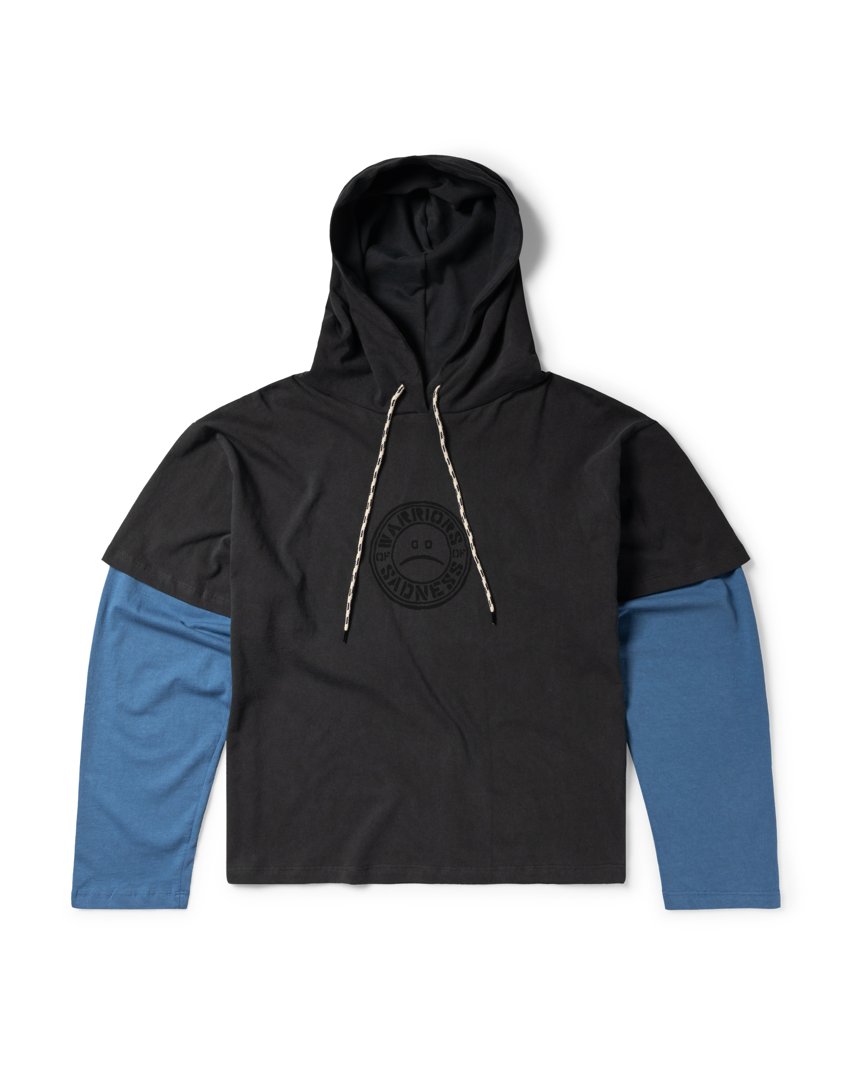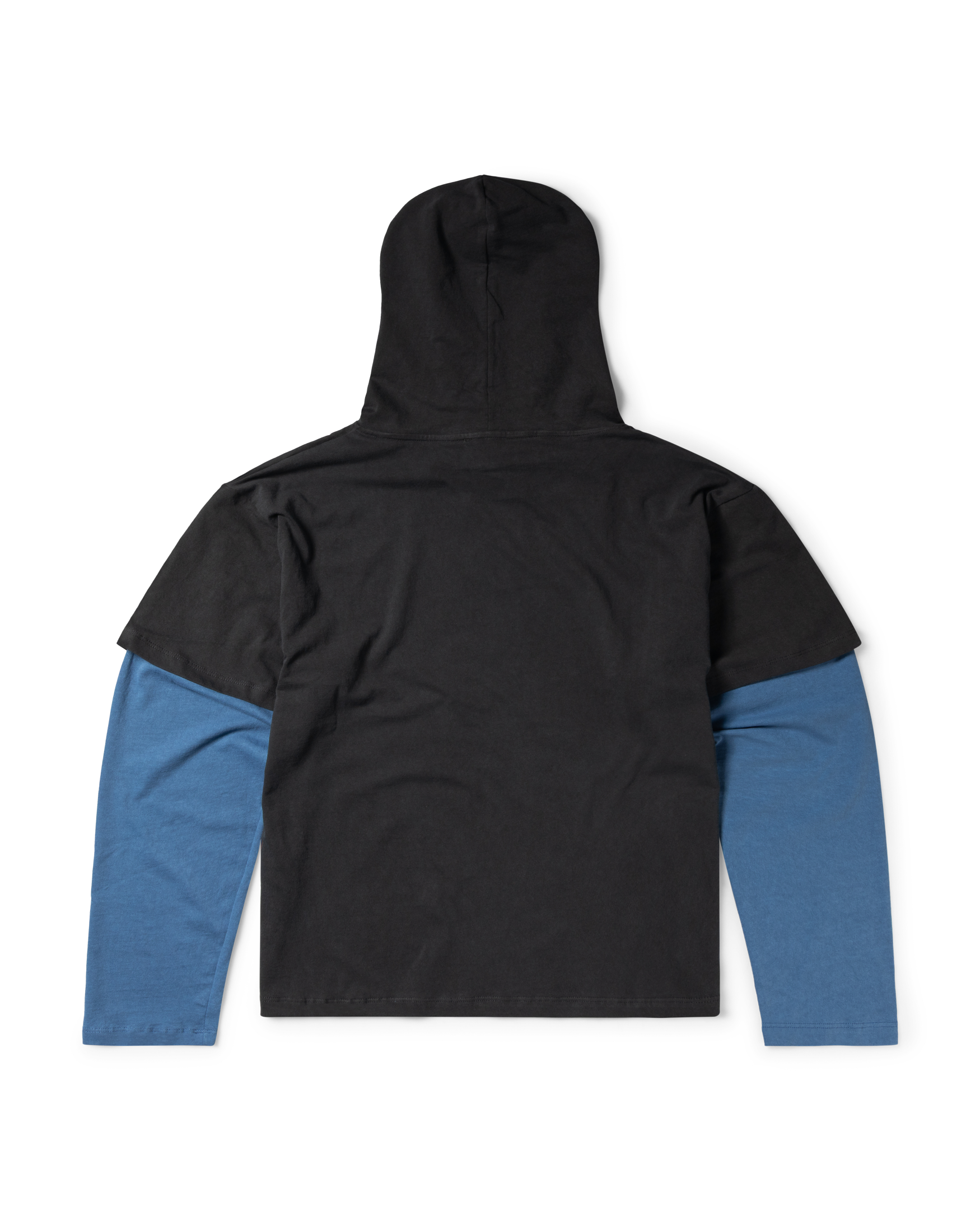 Unisex layered effect long-sleeved t-shirt with hood -made from 100% cotton, mid-weight open-end jersey. Colour-blocked blue and black jersey with a seasonal graphic screen print on the front. With a folded label at the side.