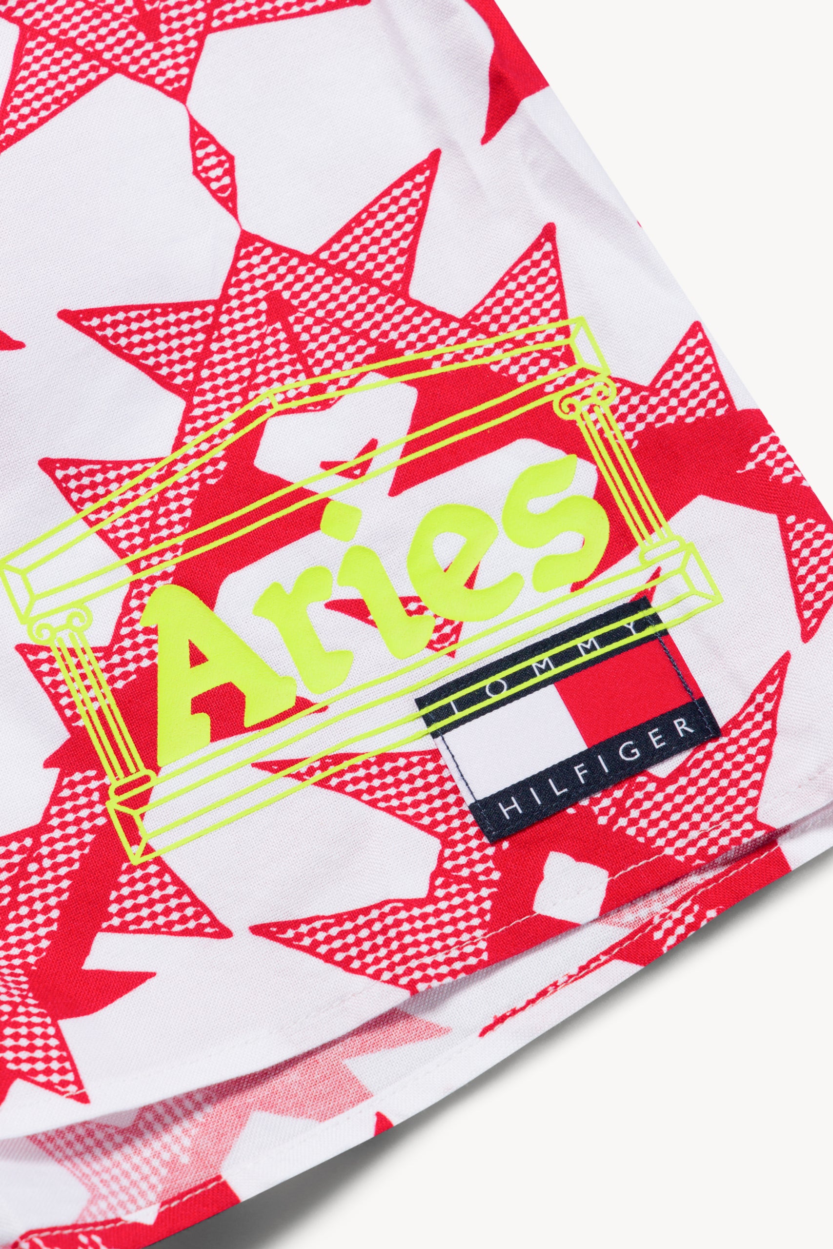 Unisex boxer short made from oxford cotton. With an Americana-inspired dual-tone bandana print and Tommy x Aries jacquard brand elastic on the waist. With a fluoro Aries temple logo and Tommy x Aries woven patch on the front. 100% cotton.