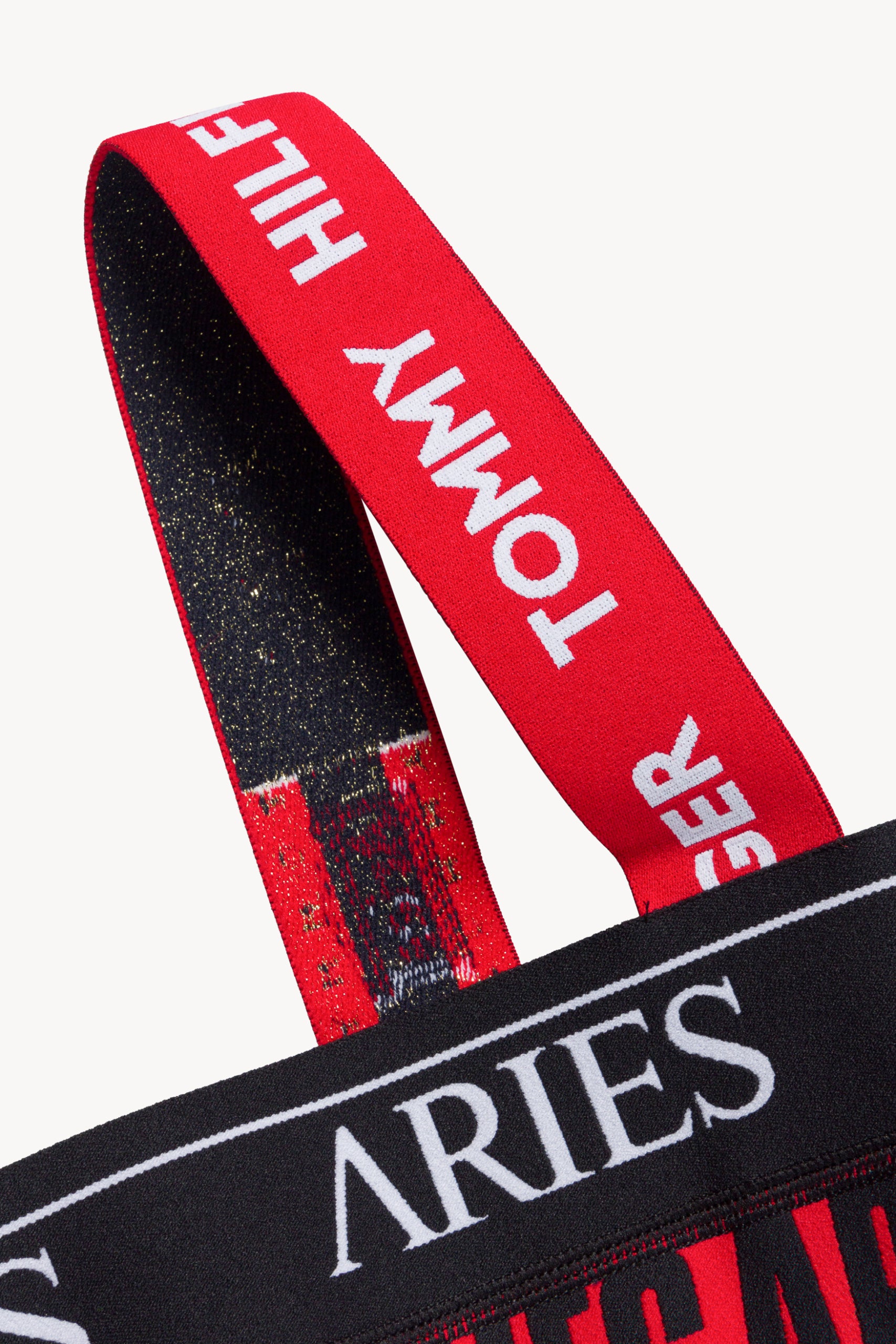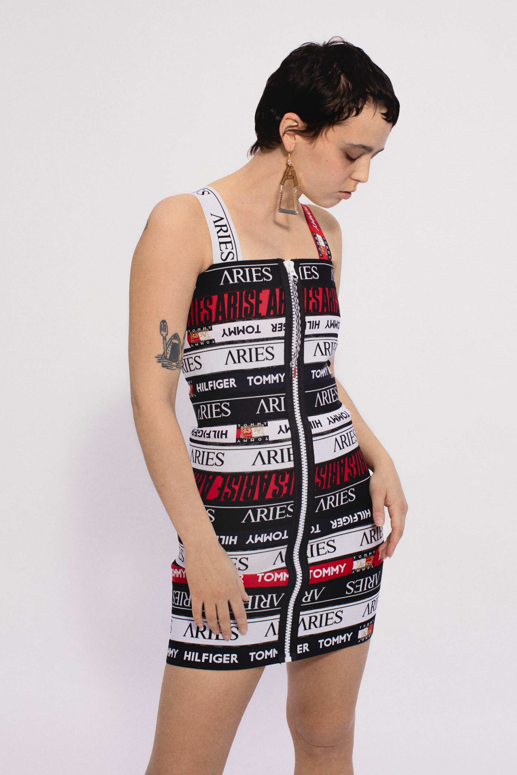 Bandage-style mini dress made a combination of Aries and Tommy Jeans woven elastics. With shoulder straps and a chunky vislon zip down the front.